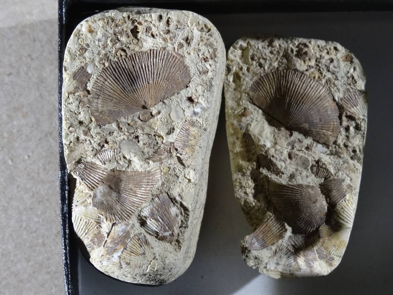 Po rozbití valounu silurského vápence vynikla krásná miska ramenonožce rodu Chonetes jako vypouklý otisk (vpravo) a vpadlý protiotisk (vlevo). Velikost misky 14x8 mm. Stará kaolínová jáma u Vidnavy. Foto: M. Hanáček.