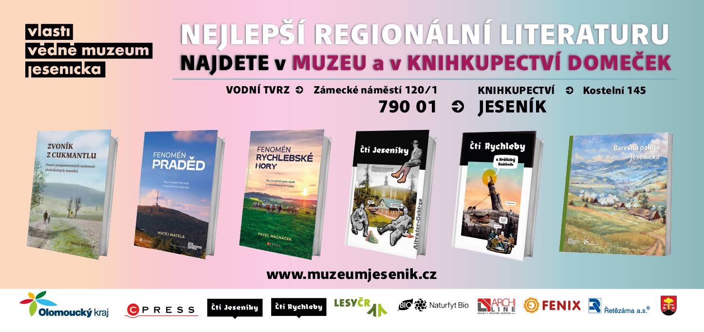 Publikační činnost VMJ Nabízíme  | Dr. ADOLF LORENZ Životní příběh rodáka z Vidnavy, jenž stál u zrodu moderní ortopedie Autor: Matěj Matela Rok vydání: 2026 Anotace: Životní příběh dr. Adolfa Lorenze (1854–1946) je inspirativním osudem jedince, který se vlastními silami, intelektem i díky přízni štěstěny dokázal ze syna chudého sedláře ze slezské Vidnavy vypracovat na jednu z nejvýraznějších osobností novodobých dějin medicíny. Publikace předkládá českému čtenáři komplexní obraz věhlasného lékaře nejen coby jednoho z osnovatelů dětské ortopedie, ale rovněž jako manžela, otce, přítele, člověka a v neposlední řadě slezského rodáka, který si ke kraji svého dětství uchoval silný vztah a rád se sem vracel. Biografii doplňuje množství vzácných fotografických snímků, ať už ze soukromého fondu rodiny Lorenzových v dolnorakouském Altenbergu, či muzejních a archivních sbírek. Cena: 390 Kč |  | MISTŘI Z JESENICKA Autor: Pavel Macháček Rok vydání: 2025 Anotace: Kniha přibližuje příběhy odhodlání, dřiny i štěstí, jež stálo za sportovními úspěchy, a zároveň zachycuje bohatou historii sportovního života na Jesenicku. Cena: 350 Kč |  | POVODNĚ NA JESENICKU Editor: Pavel Rušar Rok vydání: 2025 Publikace nabízí interdisciplinární pohled na povodňové nebezpečí na Jesenicku. Autoři z Vlastivědného muzea Jesenicka, Českého hydrometeorologického ústavu, Přírodovědecké fakulty Univerzity Palackého a Hasičského záchranného sboru Olomouckého kraje v ní představují historické souvislosti, klimatologii, hydrologii, přírodní rizika, ochranu obyvatelstva i paměťovou stopu v krajině. Kniha propojuje odborná data s vlastivědným pohledem na povodňové nebezpečí v regionu. Knihu vydal Olomoucký kraj v rámci své popularizační edice. Neprodejný titul |  | ZAPOMENUTÍ KANTOŘI Autor: Bohumila Tinzová Rok vydání: 2025 Publikace zpracovává veškeré v současnosti dostupné zdroje poznání k historii českého menšinového školství na Jesenicku v období tzv. první republiky. Úvod je věnován celkové politické a národnostní situaci v daném regionu a časovém rozpětí a jejímu vlivu na vznik českých menšinových škol. Podstatu knihy představuje historie všech osmi obecných škol a jedné školy měšťanské na Jesenicku. Tato část stati vychází nejen z existující literatury, ale využívá především dochované archivní prameny a dobový tisk. Text doplňují vzácné dobové fotografie, kopie dohledaných archiválií a biogramy pedagogů obecné a menšinové školy v Jeseníku. Cena: 200 Kč |  | BRATEČEK Z BRETNOVA Autor: Matěj Matela Rok vydání: 2025 Nadšení vlastivědci, rázovití lesníci, ale také rusínští vojáci, odpůrci nacismu či podivínský lovec zmijí. Ti všichni svými naturely a dílem přispívali k nezaměnitelné atmosféře kraje pod Pradědem. Atmosféře, která se z nemalé části, podobně jako lidská paměť, pozvolna vytrácí. Vydejme se tedy do ulic staré Vidnavy, Jeseníku a Krnova, na zadumaný Rejvíz, pod koruny stromů ve vrbenských lesích, do hospody v Široké Nivě, ale i na sever Itálie, a dokonce za velkou louži a povyprávějme si o dvaceti pozoruhodných osobnostech mizejících Jeseníků…Kniha je volným pokračováním titulu Zvoník z Cukmantlu z roku 2022. Cena: 450 Kč |  | KRÁLOVNA ČARODĚJNIC ZE ZLATÝCH HOR 1651-1652 Autor: Michaela Neubauerová Rok vydání: 2025 Zlaté Hory, malé město ve Slezsku, se v první polovině 17. století staly dějištěm jednoho z největších a nejznámějších čarodějnických procesů v českých zemích. Zdejší soudy s domnělými čarodějnicemi a čaroději prosluly svým rozsahem a brutalitou, kdy strach z čarodějnictví vedl k tomu, že světská spravedlnost byla pokřivena. Nejen pověry a iracionální obavy z čarodějnictví, ale také tehdější krutá doba plná bídy, války a moru vytvářela úrodnou půdu pro šíření nenávisti a obviňování nevinných. Text poskytuje populárně-naučný pohled na čarodějnické procesy ve Zlatých Horách v 17. století, se zaměřením na případ Voršily Schubertové, známé jako "královna čarodějnic". Je zde představen i tragický osud jejích tří dcer a vnučky, který přesahuje hranice Zlatých Hor a Slezska. Jejich příběh slouží jako memento období, kdy víra v nadpřirozené síly měla tragické následky pro mnoho nevinných lidí. Cena: 120 Kč |  | ÚDOLÍ BĚLÉ VE TŘECH ROZMĚRECH Autoři: Jan Petrásek, Miroslav Tomka Rok vydání: 2024 Přeneste se skrze další rozměr, konkrétně třetí, přímo do nezaměnitelné atmosféry Jesenicka přelomu 19. a 20. století. Soubor desítek skleněných stereonegativů fotografa Rudolfa J. Kleina ze sbírek Vlstivědného muzea Jesenicka je v katalogu prezentován anaglyfickou formou, díky které snímky doslova vystoupí ze stránek katalogu. Cena: 300 Kč |  | JESENÍKY 2024 sborník příspěvků z meteorologické konference Editoři: Pavel Lipina, Jan Procházka Rok vydání: 2024 Sborník příspěvků z konference pořádané Českým hydrometeorologickým ústavem, Českou meteorologickou společností a Vlastivědným muzeem Jesenicka konané ve dnech 14. až 16. května 2024 v hotelu Franz na Rejvízu v Jeseníkách. Vydalo nakladatelství Český hydrometeorologický ústav, Praha. Neprodejný titul PDF ke stažení | | | |  | JESENICKO 1945 MEZI VÁLKOU A MÍREM Autoři: Lubomír Hlavienka, Ondřej Kolář Rok vydání: 2024 Konec druhé světové války znamenal v českém pohraničí také kolaps německého bezpečnostního aparátu. Československé i sovětské orgány se sice pokusily rychle samy převzít odpovědnost za bezpečnost, ale z řady důvodů nebyly zcela úspěšné. Na několik týdnů se proto pohraničí ponořilo do hluboké anarchie,