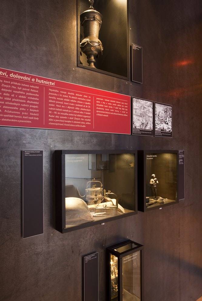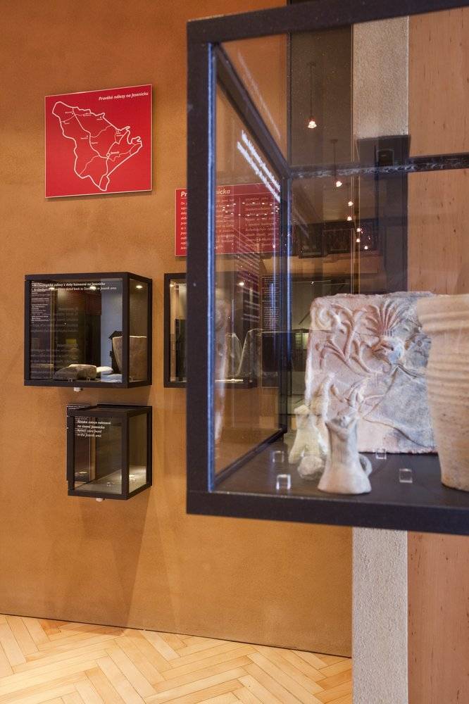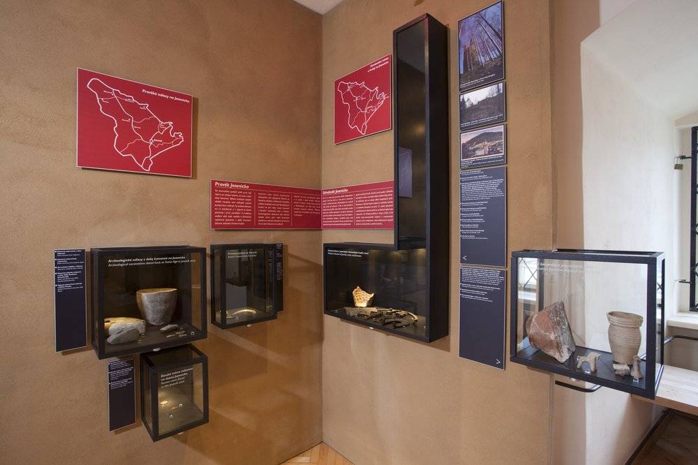 Historie a archeologie JesenickaVe své nynější podobě představuje Historie a archeologie Jesenicka nejstarší stálou expozici v prostorách Vodní tvrze v Jeseníku. Návštěvníky čekají celkem tři místnosti. První z nich prezentuje zájemcům výsledky bádání a archeologických výzkumů od pravěku až do 19. století. Dozvíte se tak informace nejen o sídelních strukturách Jesenicka, ale i o rozvoji řemesel, těžbě nerostného bohatství či někdejší lidové zbožnosti. Ústředním bodem prostoru je skleněný tubus ukrývající polychromovanou dřevěnou plastiku Pražského Jezulátka pravděpodobně z 18. století, jež pochází z kláštera sester sv. Kláry ve Vratislavi a na Jesenicko se dostala v důsledku sekularizační politiky pruského státu. Po zrušení vratislavského kláštera přešla soška do rukou sester řádu sv. Voršily, které v roce 1882 založily klášter v Jeseníku. Pozornost návštěvníků si jistě zaslouží i nádherné malované obrázky na skle, model hamru a stoupy nebo cechovní cínový vítací pohár z roku 1784. Druhá místnost přibližuje návštěvníkům, že Jesenicko neprocházelo jen obdobími rozkvětu a nerušeného koloběhu života, ale s jeho historií jsou spjaté i četné války a katastrofy. Prakticky každý konflikt od doby husitských válek v 15. století do místních dějin více či méně zasáhl. Ukázky sbírkových předmětů a fotografických dokumentů v této místnosti připomínají nejen přímou bojovou aktivitu armád na zdejším území, ale vysvětlují i následné správní, hospodářské či společenské změny. Vedle válek město i okolí trápily také přírodní katastrofy jako požáry či povodně, které za sebou často zanechaly jen spoušť a zmařené lidské životy či sny. V jednom z takových požárů v 18. století, který poničil i samotnou Vodní tvrz, bychom našli i kořeny současného vzhledu objektu. Stavební vývoj Vodní tvrze je přiblížen na třech interaktivních modelech. Na doprovodných panelech je pak představena historie tvrze i samotného jesenického muzea. Třetí a poslední místnost přibližuje slavnou hudební a lázeňskou minulost kraje, spjatou se jmény hudebního skladatele Karla Ditterse z Ditterdorfu nebo zakladatelů vodoléčby Vincenze Priessnitze a Johanna Schrotha. Řada fotografií na stěnách zobrazuje malebnou jesenickou přírodu i četné kulturní památky zdejšího kraje a poskytne návštěvníkům inspiraci k dalším zajímavým výletům po Jesenicku.