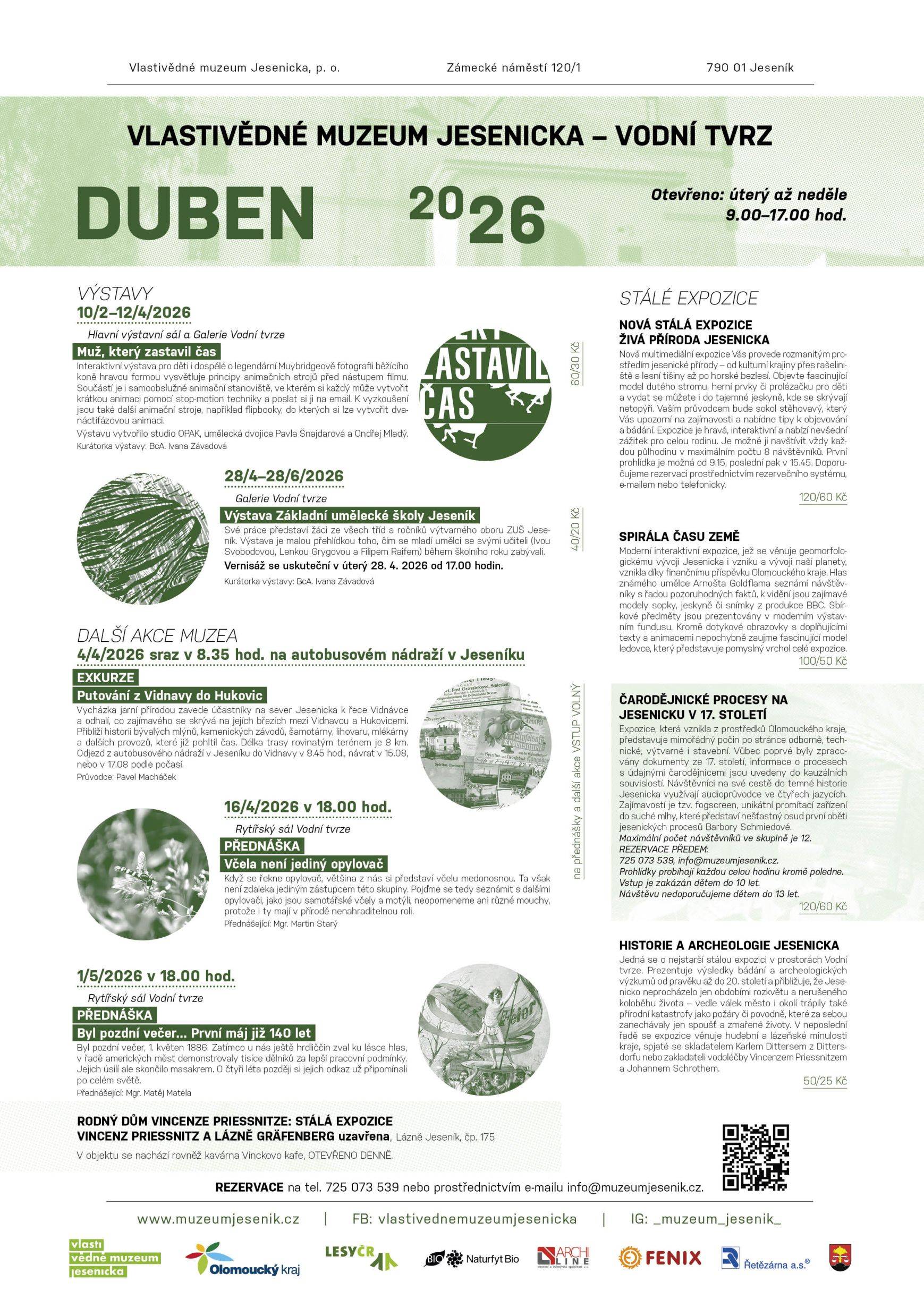 MUŽ, KTERÝ ZASTAVIL ČAS10. února až 12. dubna 2026, Hlavní výstavní sál a Galerie Vodní tvrze Interaktivní výstava pro děti i dospělé o legendární Muybridgeově fotografii běžícího koně hravou formou vysvětluje principy animačních strojů před nástupem filmu. Součástí bude i samoobslužné animační stanoviště, ve kterém si každý může vytvořit krátkou animaci pomocí stop-motion techniky a poslat si ji na email. K vyzkoušení budou také další animační stroje, například flipbooky, do kterých si lze vytvořit dvanácti fázovou animaci. Výstavu vytvořilo studio OPAK, umělecká dvojice Pavla Šnajdarová a Ondřej Mladý. Mediálním partnerem je Rádio Haná. Kurátorka výstavy: BcA. Ivana Závadová Vstupné: 60/30 Kč