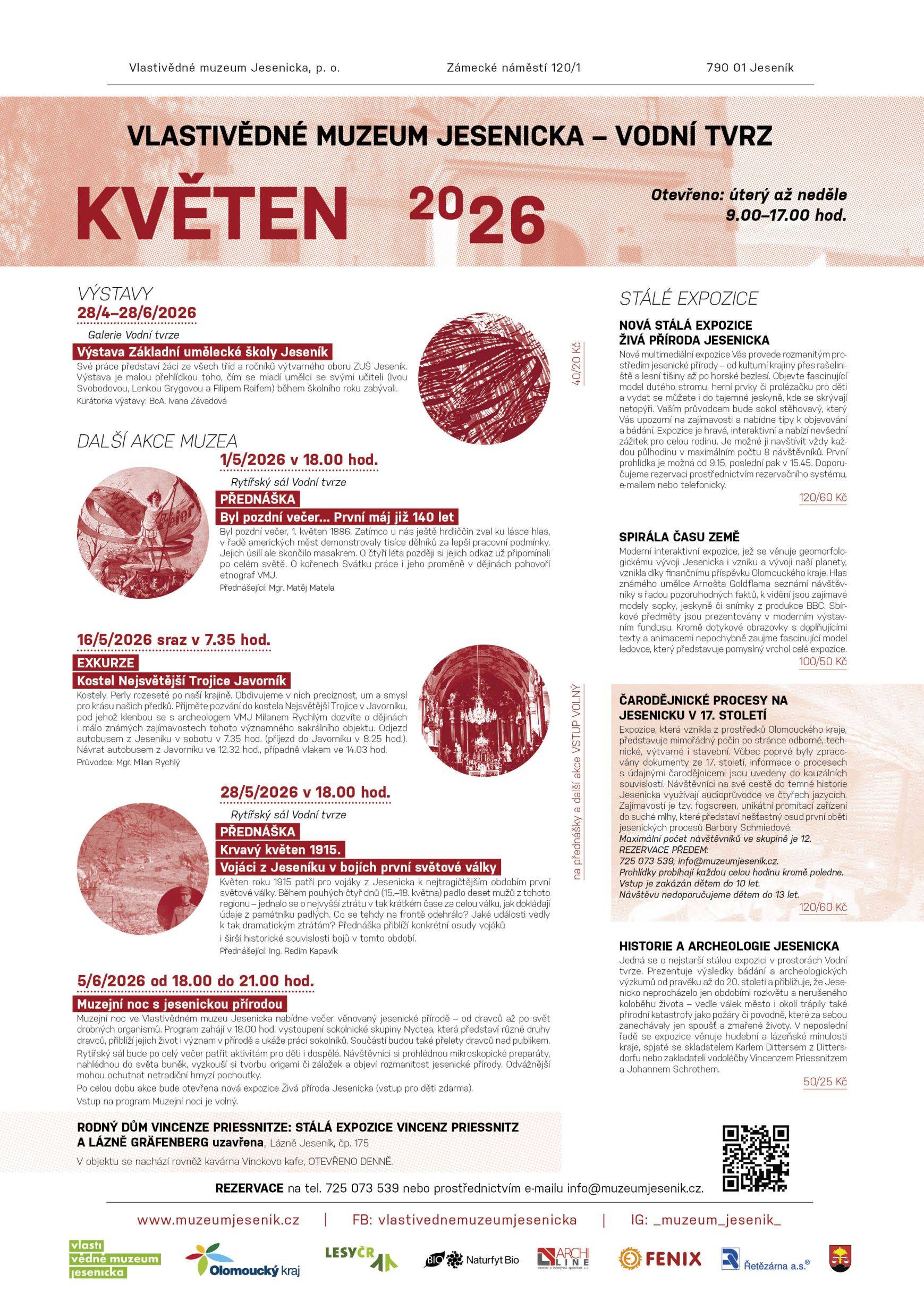 VÝSTAVA ZÁKLADNÍ UMĚLECKÉ ŠKOLY JESENÍK28. dubna až 28. června 2026, Galerie Vodní tvrze Své práce představí žáci ze všech tříd a ročníků výtvarného oboru ZUŠ Jeseník. Výstava je malou přehlídkou toho, čím se mladí umělci se svými učiteli (Ivou Svobodovou, Lenkou Grygovou a Filipem Raifem) během školního roku zabývali. Vernisáž se uskuteční v úterý 28. 4. 2026 od 17:00 hod. Kurátorka výstavy: BcA. Ivana Závadová Vstupné: 40/20 Kč