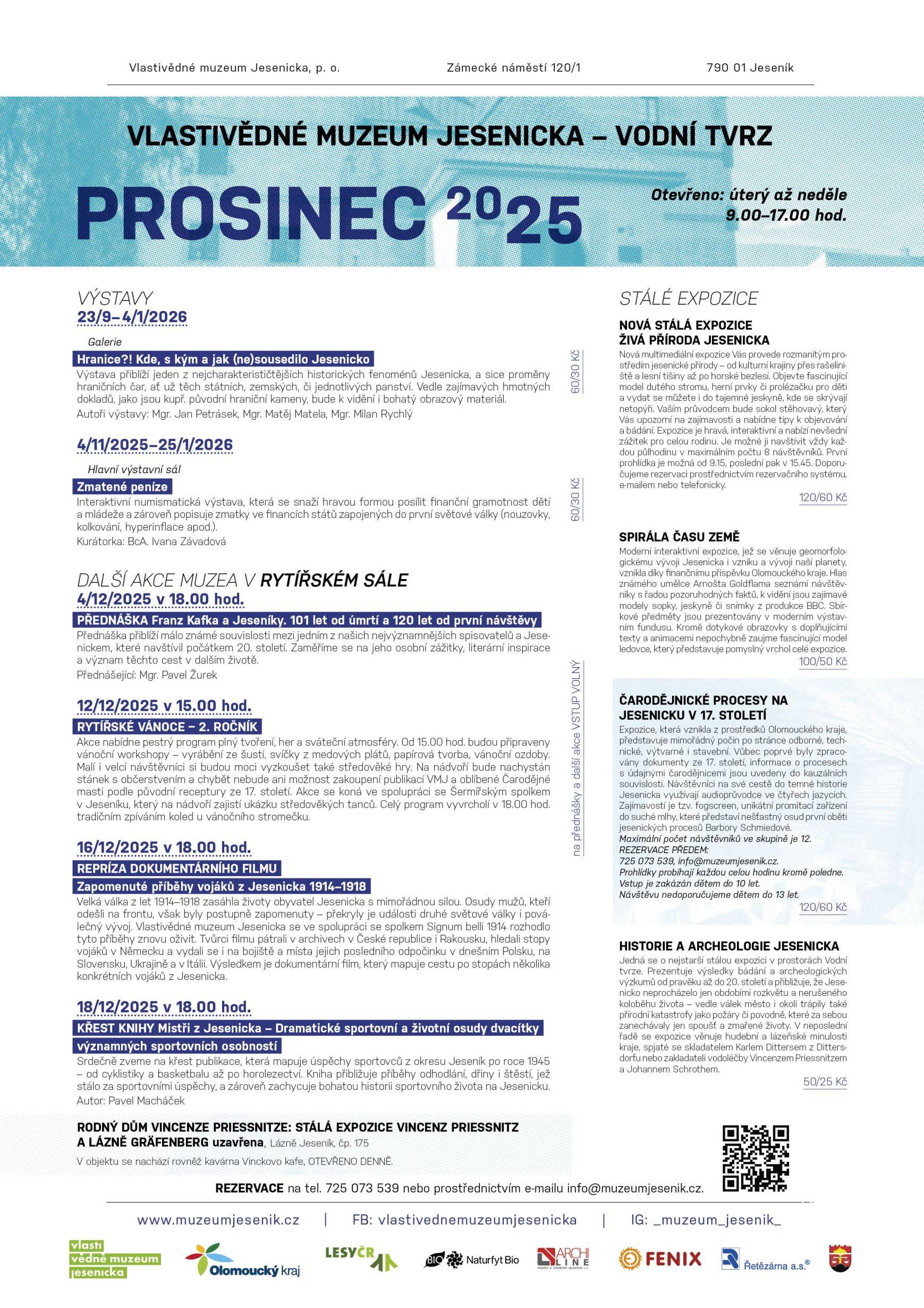 PŘEDNÁŠKA Franz Kafka a Jeseníky. 101 let od úmrtí a 120 let od první návštěvy 4. prosinec 2025, 18.00 hod. Rytířský sál Vodní tvrze Přednáška přiblíží málo známé souvislosti mezi jedním z našich nejvýznamnějších spisovatelů a Jesenickem, které navštívil počátkem 20. století. Zaměříme se na jeho osobní zážitky, literární inspirace a význam těchto cest v dalším životě. Přednášející: Mgr. Pavel Žurek Vstup volný