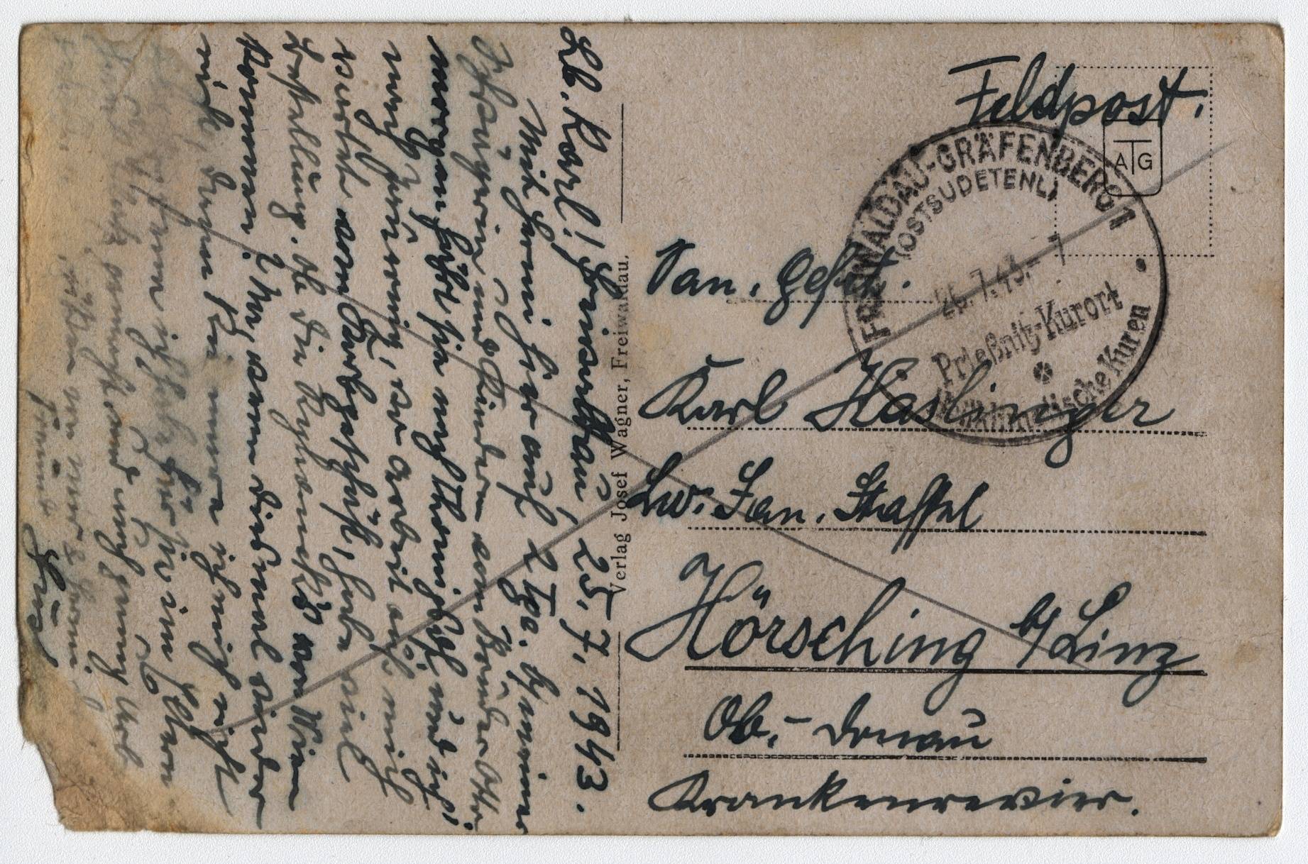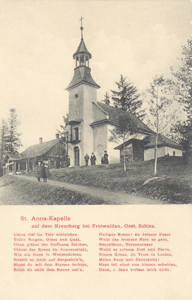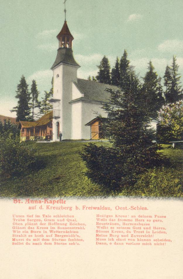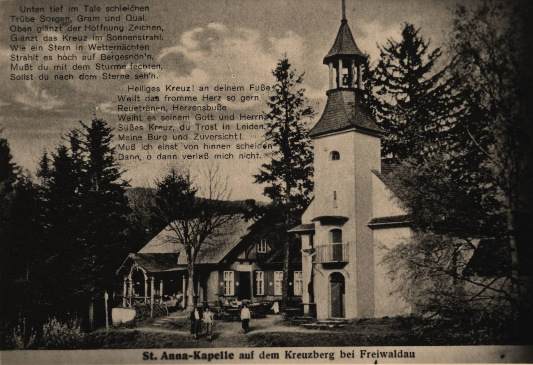 Díl šestačtyřicátý: Heiliges Kreuz! Duchovní poezie z Křížového vrchuPublikováno 16. prosince 2020 V jednom z přechozích dílů bylo představeno (do českého jazyka přebásněné) poetické zachycení prožitku vídeňské návštěvnice Jeseníku. Emoční pohnutí v ní vyvolal pohled na město z tzv. Priessnitzovy vyhlídky, jenž poté našel své místo na panoramatických pohlednicích. Ve sbírkách Vlastivědného muzea Jesenicka bychom však našli i další pohlednice, které jsou opatřeny básní a jejichž autor, bohužel neznámý, zaznamenal své dojmy na totožném místě. Své pocity však nevyjádřil formou poetického popisu okolí, ale do veršů zachytil svůj náboženský prožitek z návštěvy kaple sv. Anny. Svatostánek s kořeny sahajícími až do 17. století, jehož současná podoba vznikla již v roce 1847, stojí na známém místě Křížový vrch, nazvaném podle procesí, při kterém byl nesen na kopec kříž. Právě motiv kříže posloužil autorovi básně hledajícímu útěchu od svých pozemských strastí k alegorickému ztotožnění Boha a víry s tímto nejznámějším symbolem křesťanství. Stejně jako autora nejsme schopni přesně datovat ani dílo, dle formálních znaků však lze vznik pohlednic vročit nejdříve k roku 1906. Pravděpodobně však byly vydávány až později, jedna z poštovních dopisnic byla dokonce zaslána jako tzv. polní pošta (feldpost) v roce 1943 vojákovi sloužícímu v německé armádě v druhé světové válce. Vine se nížinou hluboko dole (Unten tief im Tale schleichen) Jako v noci bouřné hvězdný roj (Wie ein Stern in Wetternächten) Svatý kříži! U tvých nohou (Heiliges Kreuz! an deinem Fusse) Líbezný kříž, bolesti má útěcha. (Süsses Kreuz, du Trost in Leiden.) Jan Petrásek |