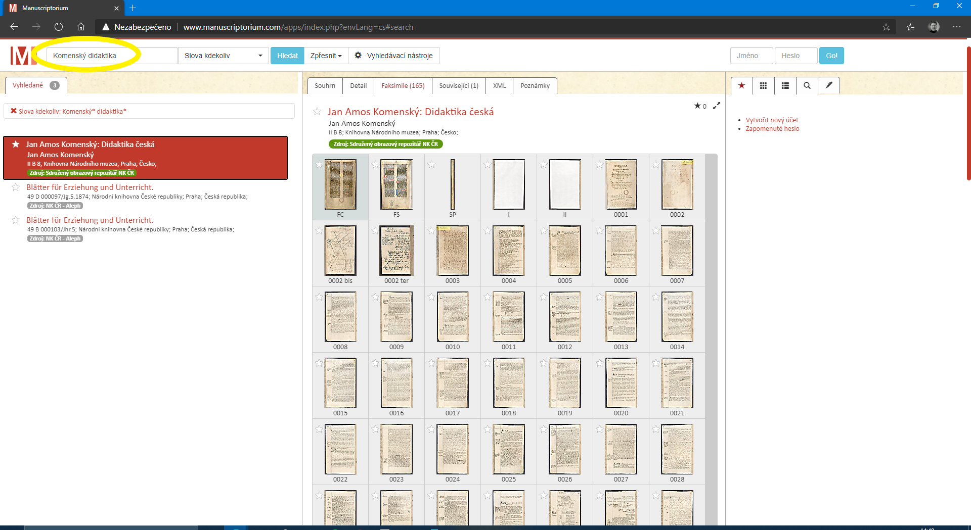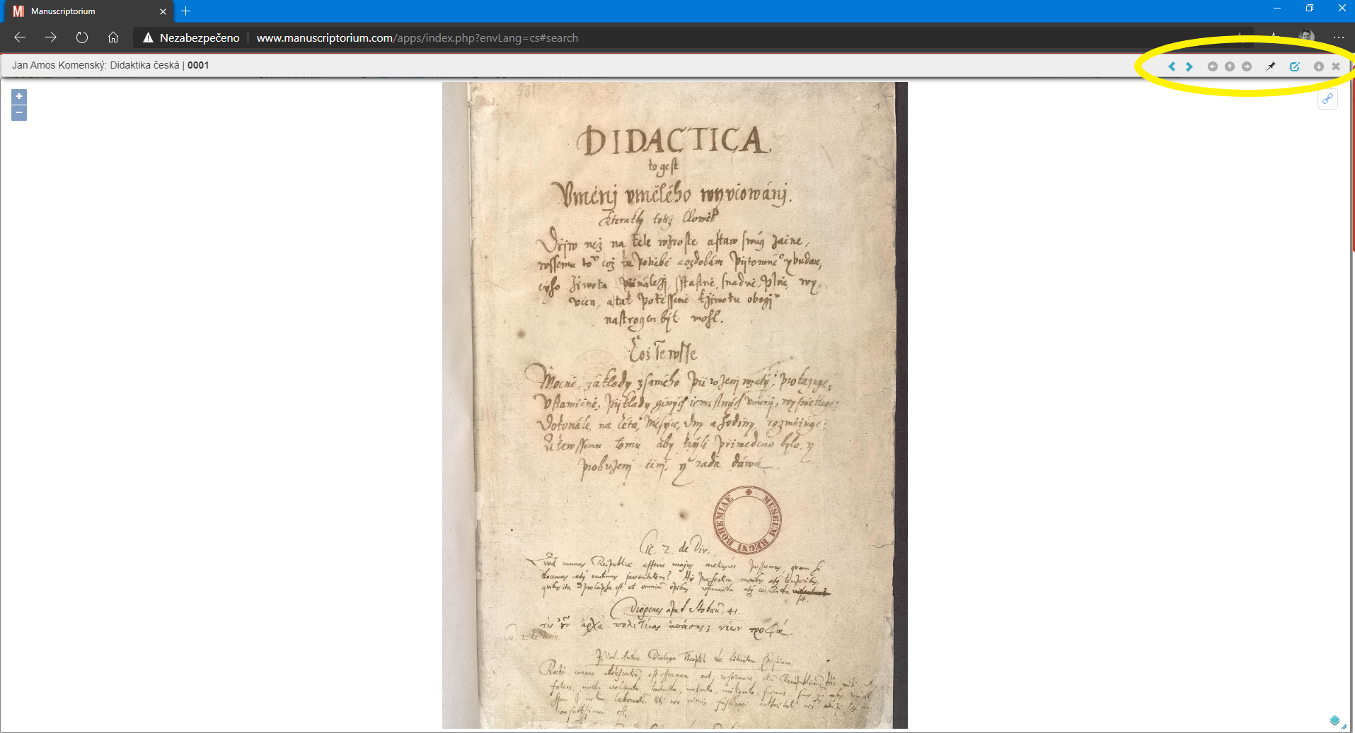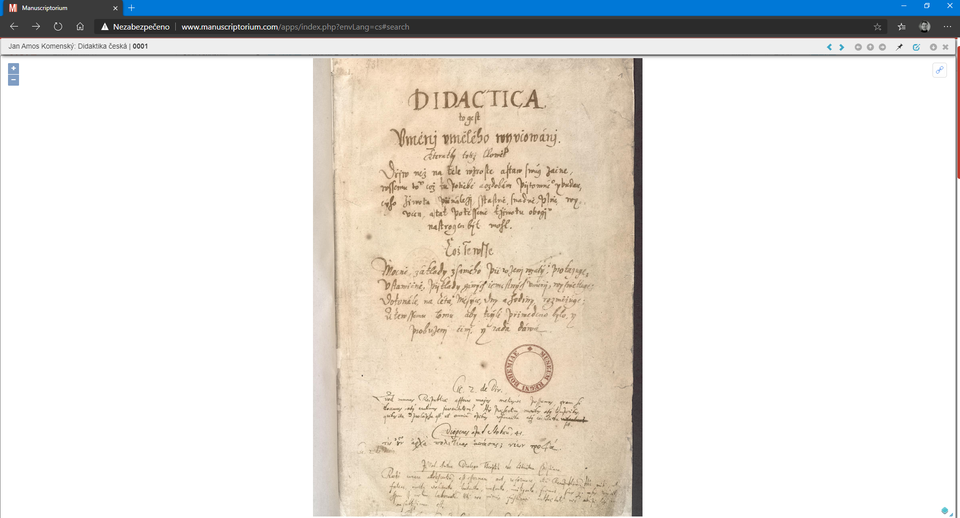 Díl devátý: Nebojme se hledat v digitalizovaných tiscích IIPublikováno 31. března 2020 Již od dob vzniku moderních muzeí (18. století) probíhá spor kurátorů, kteří se snaží jak o ochranu, tak také o maximální zpřístupnění sbírek. Sladit oba požadavky bývá komplikované. Výjimečné případy, kdy se sbírkový předmět ztratí, ukradne či poničí, dávají za pravdu těm, kteří se mnohdy úzkostlivě bojí o své poklady. Staré tisky ale možnost digitalizace nabízejí, čímž je výzkum umožněn takříkajíc komukoliv. Manuscriptorium je volně dostupná digitální knihovna, jež soustředí historické fondy zahrnující řadu institucí nejen v EU. Najdeme zde vzácné rukopisy, tisky, mapy. Smyslem projektu není jen shromažďovat, ale též nabízet kontext doby, jenž může zaujmout učitele, historiky, ale i zvídavé laiky. Přístup do webové aplikace vede buď zadáním pojmu „Manuscriptorium“ do vyhledávače, případně obdobně jako u Krameria přes stránky Národní knihovny v Praze/Digitální knihovna, kde zvolíme položku Manuscriptorium (obr. 1). Přivítá nás úvodní stránka (obr. 2). Můžeme si založit i vlastní bezplatný účet, který nabízí další bonusy a možnosti využití (např. založení osobní virtuální knihovny, vlastní poznámky atd.). V nižší části stránky jsou pak aktuality (uvedeno jako Z našeho blogu), bližší návody atd. (obr. 3) Tlačítkem Digitální knihovna, ať už na horní liště nebo níže položeným tlačítkem, vstoupíme přímo do databáze knihovny (obr. 4). Prostá stránka nabízí zejména vyhledávání (obr. 5) dle zvolených filtrů. Příkladem pro dnešní lekci bude práce jednoho z největších myslitelů našich dějin, J. A. Komenského, jehož dílo je (přestože se zachovalo jen torzo) dosud neuvěřitelnou studnicí vědomostí. Při zadání slova „Komenský“ do vyhledávání nám databáze nabídne 1 687 nálezů (!) včetně nejznámějších děl (obr. 6), avšak v případě specifikace dotazu je vyhledávání již lépe využitelné (obr. 7). V našem případě jsme „vypátrali” opis České didaktiky pocházející z doby kolem roku 1630 s Komenského vlastnoručními úpravami a poznámkami, jehož originál se nachází v Národním muzeu v Praze (obr. 8). Manuscriptorium nabízí několik nástrojů, bohužel na rozdíl od Krameria zde není možnost přepisu ani překladu (obr. 9). Pavel Žurek |