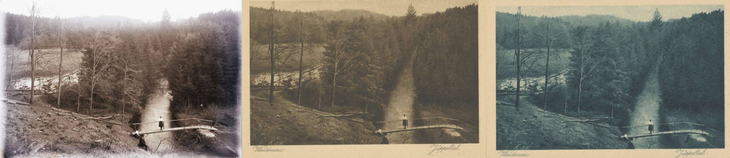 PexesoZázraky se tu a tam dějí, a tak se i v našem depozitáři klikatými cestami osudu ocitly snímky, které vzešly z jednoho dávného společného základu. Výbuch emocí nastává zejména v okamžiku, kdy se podaří objevit primární negativ, který posloužil jako matrice pro vytvoření nesčetných kopií v podobě tisků, diapozitivů či pohlednic. Takové mateřské či sesterské pouto je samozřejmě zapotřebí řádně zaznačit do databáze. Započíná se tedy usilovné vzpomínání, kdeže byl onen výjev spatřen. Je-li ono rozvzpomínání korunováno úspěchem, získáme pozoruhodný srovnávací soubor, jako je tomu kupříkladu v případě snímku Černého potoka u Vidnavy z 1. poloviny 20. století (obr. 14).