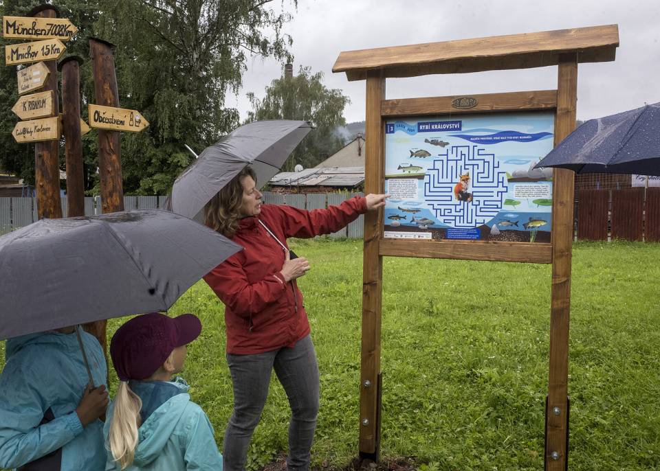 Slavnostní otevření naučné stezky Cesta kolem vody ve Vrbně pod Pradědem06.08.2020 V sobotu 11. července proběhlo ve Vrbně pod Pradědem otevření další z jesenických naučných stezek. Vede z Vrbna do Karlovic podél řeky Opavy a na celkem deseti hlavních zastaveních seznamuje veřejnost jak s celou řadou přírodovědných poznatků, tak také s historickými zajímavostmi spojenými s tímto tokem a celkově regionem Vrbenska. Iniciativa propojit obě obce příjemnou trasou, na níž se návštěvníci zároveň i leccos dozví, se zrodila v řadách spolku „Actaea – společnost pro přírodu a krajinu“, konkrétně jeho předsedkyně Kateřiny Kočí, jíž se projekt po několika letech práce podařilo – i díky četným dobrovolníkům hrdinně klestícím neprostupná houští – realizovat. Průvodkyní naučnou šestikilometrovou cestou se stala zrzavá liška, která si odskočila z městského znaku Vrbna, aby život kolem řeky Opavy zábavnou formou přiblížila. Základ stezky tvoří klasické naučné tabule, na nichž se vedle odborníků ze spolku Actaea, Masarykovy univerzity v Brně či Povodí Odry textově podílel i pracovník našeho muzea Matěj Matela (např. tabule Řeka Opava, Zlato či Síla vody). Kolemjdoucí si dále přečtou o živočiších, jež ve vodě a okolo ní žijí, či o rostlinách, které najdeme v rybnících a řekách. Trasu krášlí rovněž vyvedené makety zvířat (bobr, liška či jezevec), vyzkoušet si můžete chodník bosých nohou, houpačku, lesní dřevěné pexeso, doskočiště a mnoho dalších interaktivních prvků. Stezka končí ve Vzdělávacím centru VÍCE Ve mlýně Karlovice. | |