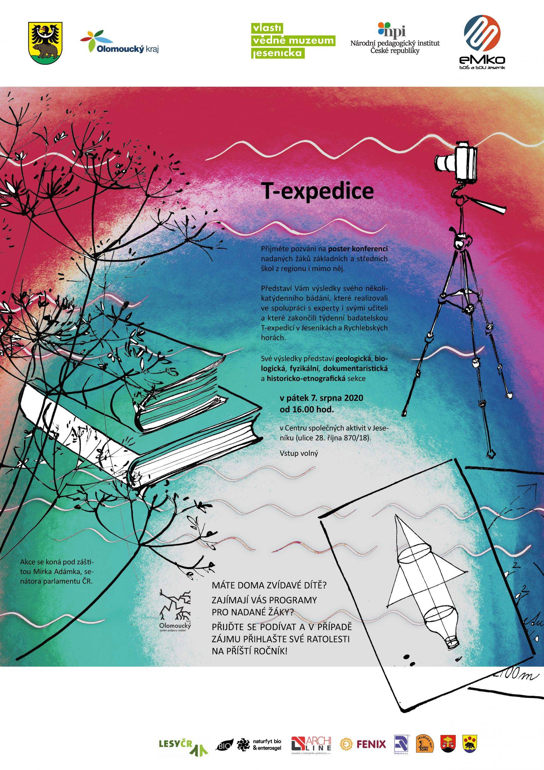 T-expedice Jeseníky07.08.2020 Prezenční část letošní T-expedice Jeseníky byla ukončena v pátek 7. 8. v Centru společných aktivit formou poster konference, na které badatelé z pěti sekcí (botanika, hydrogeologie, dokumentaristika, fyzika a historie-etnografie) představili výsledky svého výzkumu. Mezi nejvýznamnější výsledky patří např. nalezení zdaleka nejradioaktivnějšího pramene na Jesenicku, prostorový popis dávné tradice Saatenreiten v Javorníku či odmítnutí hypotézy o potenciálu využitelnosti vodních raket v kosmonautice. Při mapování invazivních rostlin došlo k rovněž k náhodnému objevu kriticky ohroženého jednokvítku velekvětého. Výsledky budou vystaveny na posterech na základní škole Jeseník a Javorník a na SPŠJ EMKO za několik dnů. S výsledky Vás také seznámí trailer natočený samotnými studenty, na který brzy umístíme odkaz na webu a facebooku muzea, a protože většina témat souvisela s vodou, tak hlavní výsledek dokumentaristické sekce - patnáctiminutový dokumentární film - budete moci shlédnout na svatováclavském sympoziu dne 29. září. Ke stažení