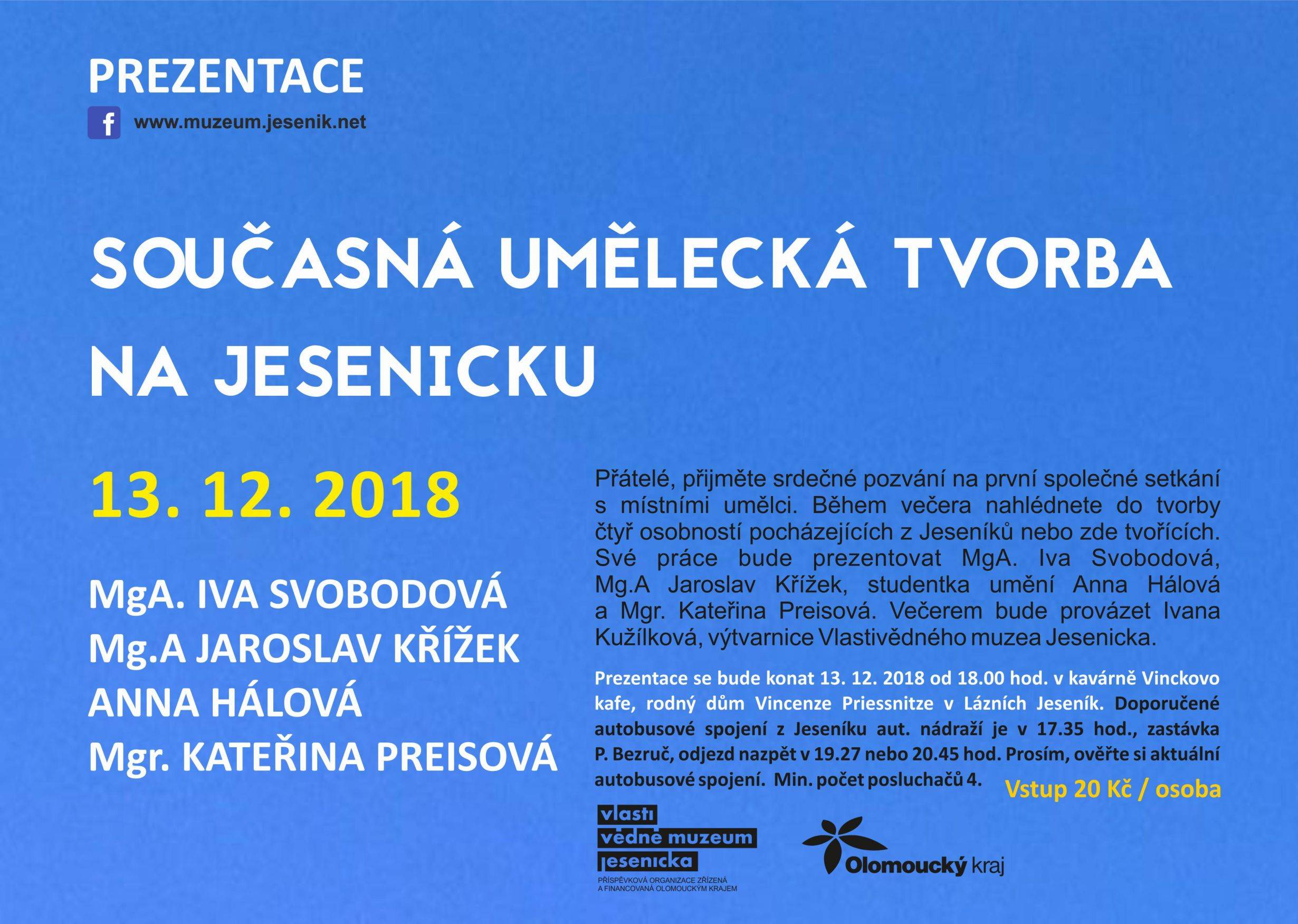 Současná umělecká tvorba na Jesenicku (přednáška)13.12.2018 13. prosince 2018, Rodný dům Vincenze Priessnitze, kavárna Vinckovo kafe Během večera měli návštěvnící možnost nahlédnout do tvorby čtyř významných uměleckých osobností Jesenicka. Svou práci prezentovala MgA. Iva Svobodová, MgA. Jaroslav Křížek, studentka umění Anna Hálová a Mgr. Kateřina Preissová. Moderovala výtvarnice VMJ BcA. Ivana Kužílková. | |