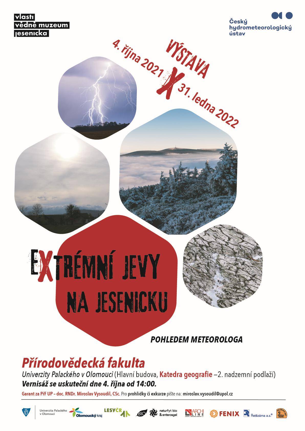 Výstava o meteorologických extrémech na Jesenicku bude k vidění v prostorách Univerzity Palackého v Olomouci05.10.2021 Dne 4. října ve 14.00 hod. byla slavnostní vernisáží zahájena výstava „Extrémní jevy na Jesenicku pohledem meteorologa“, jež bude tentokrát k vidění na půdě Přírodovědecké fakulty Univerzity Palackého v Olomouci. Mezi hosty nechyběl významný český klimatolog a meteorolog Dr. Radim Tolasz, pedolog prof. Bořivoj Šarapatka, botanik prof. Aleš Lebeda či geografové prof. Radomír Halás, doc. Václav Toušek a doc. Irena Smolová. Celkově se vernisáže zúčastnilo 49 návštěvníků. Výstava bude zpřístupněna ve druhém nadzemním podlaží (Katedra geografie) hlavní budovy Přírodovědecké fakulty UPOL (Envelopa) do konce ledna roku 2022. Pro komentované prohlídky je možné kontaktovat doc. Miroslava Vysoudila na e-mailové adrese miroslav.vysoudil@upol.cz. Výstavu navštívila i skupina vozíčkářů a hendikepovaných ze zařízení JITRO/CREDO Olomouc, které pečuje o postižené od roku 1991. | |