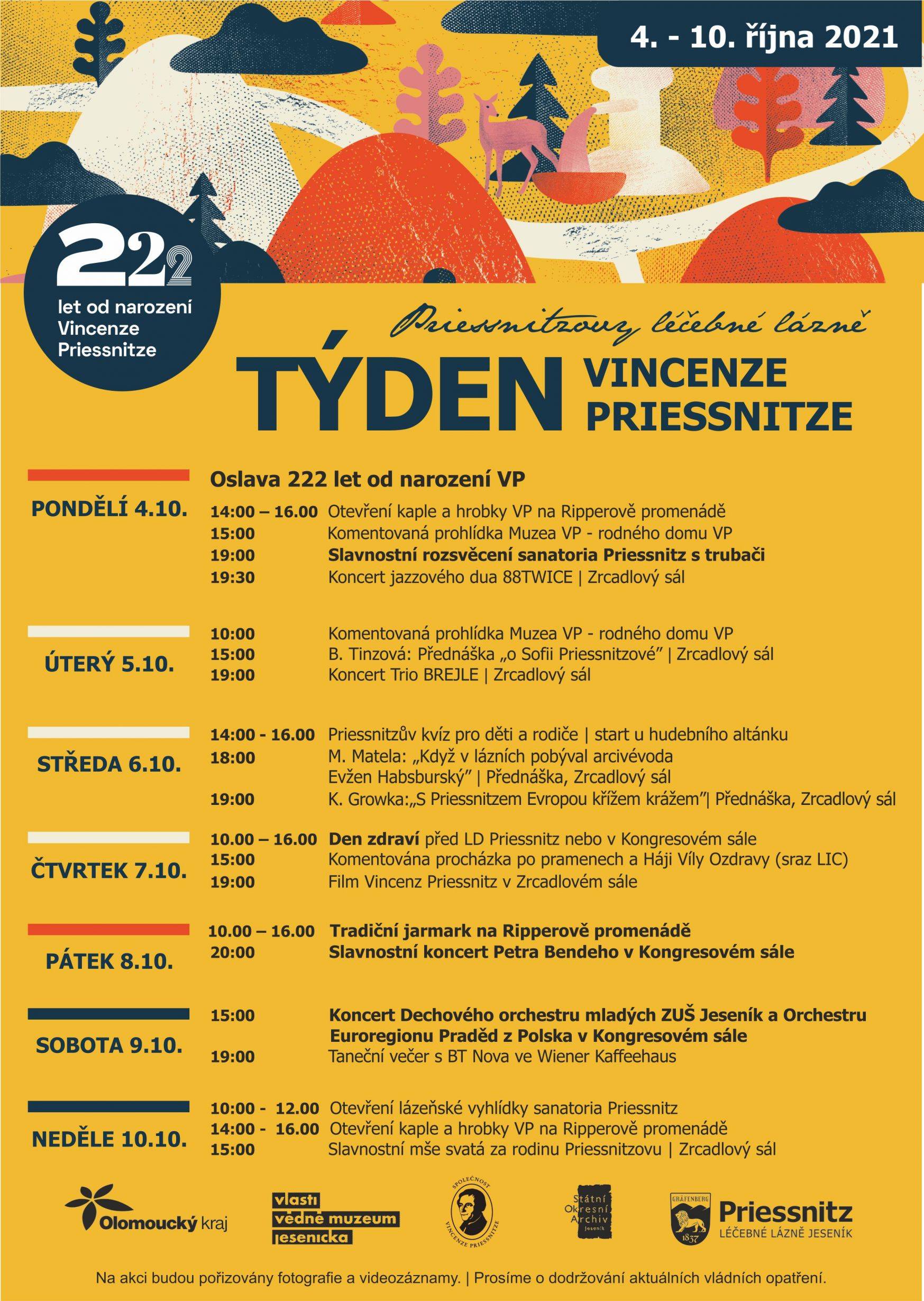 Vlastivědné muzeum Jesenicka zve k Týdnu Vincenze Priessnitze04.10.2021 Vlastivědné muzeum Jesenicka se i v roce „dvojkového“ výročí Priessnitzova narození (222 let) zapojuje do příprav Týdne Vincenze Priessnitze, který proběhne od 4. do 10. října. Hlavní organizátor akce – Priessnitzovy léčebné lázně – nabízí širokou škálu aktivit. Za VMJ budou nabídnuty přednášky k tématu a komentovaná prohlídka stálé expozice Vincenz Priessnitz a Lázně Gräfenberg. | |