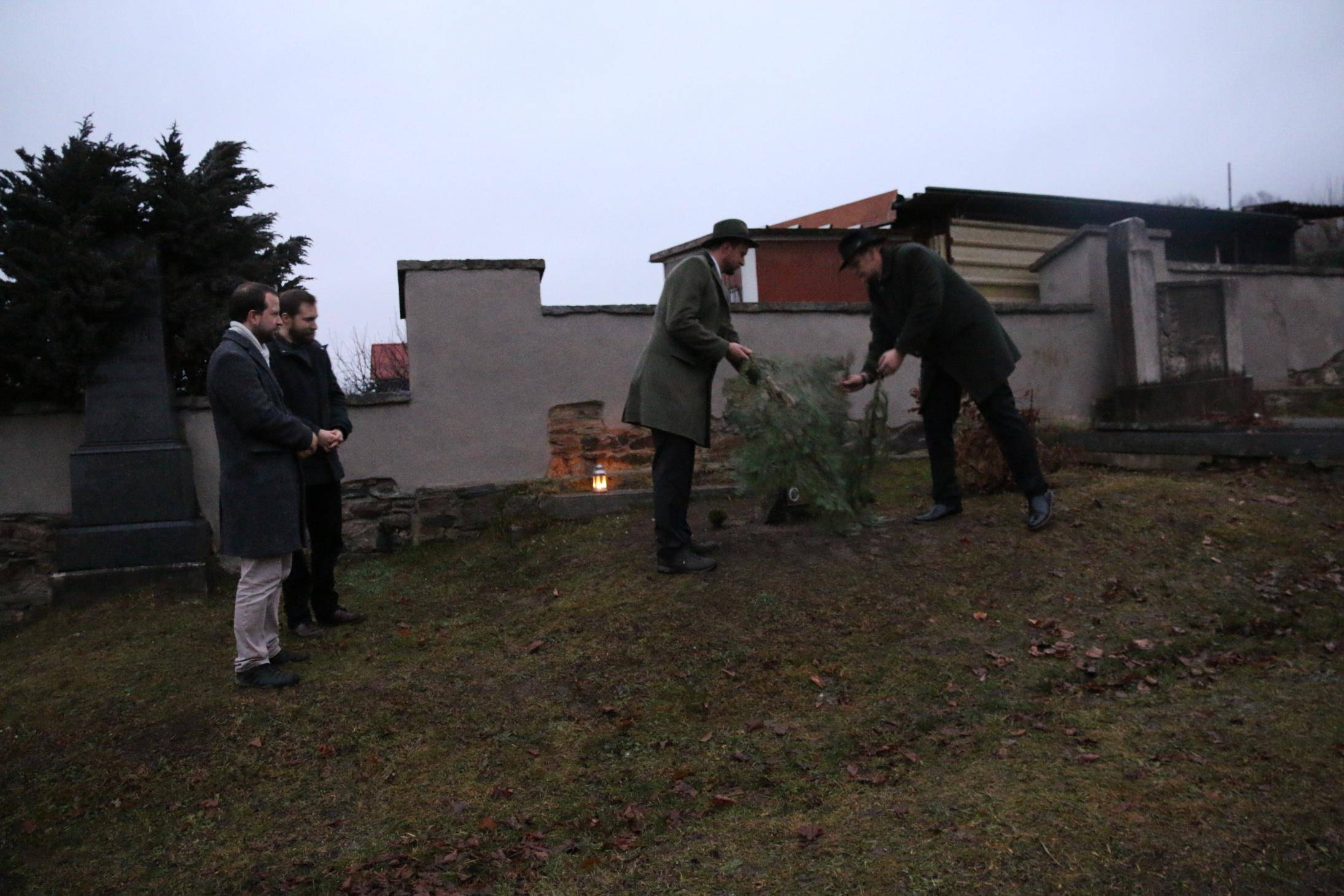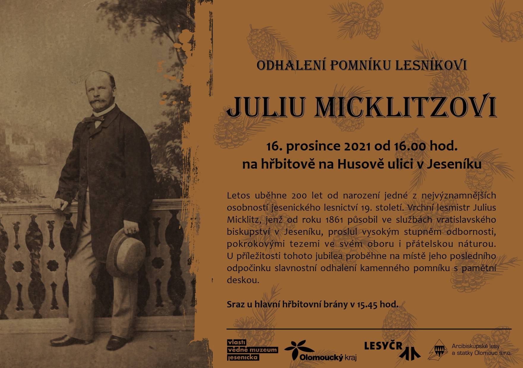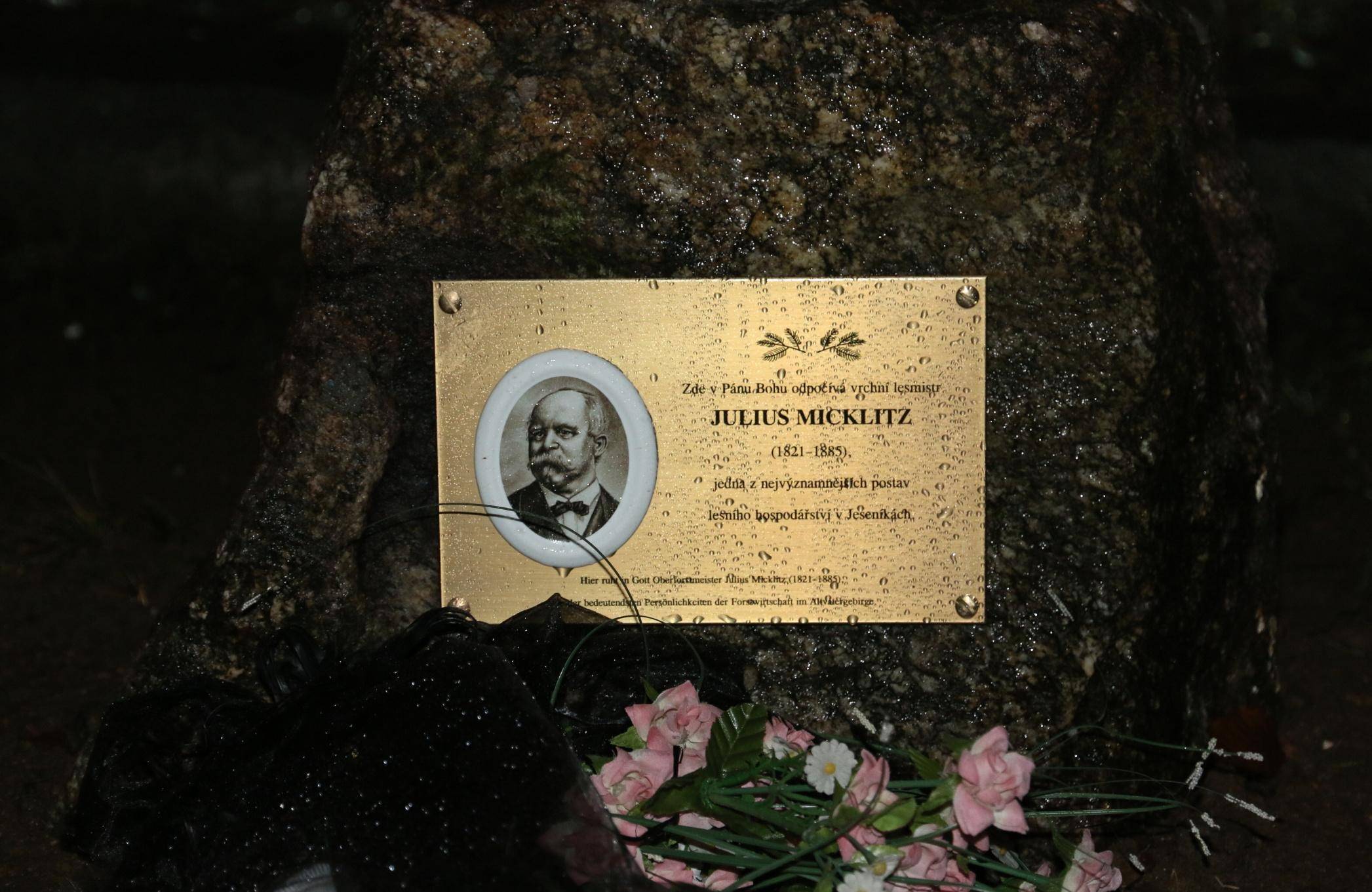 Pomník vrchnímu lesmistru Micklitzovi slavnostně odhalen17.12.2021 „Činnost tohoto muže, jenž je znám daleko za hranicemi našich zemí, se v krásném Slezsku stala mezníkem ve vývoji lesnictví,“ prohlásil v dubnu 1885 předseda Moravsko-slezského lesnického spolku hrabě Serényi nad rakví zesnulého vrchního biskupského lesmistra Julia Micklitze. Tohoto velkého muže jesenického lesnictví připomíná od 16. prosince 2021, kdy uběhlo přesně 200 let od jeho narození, kamenný pomník na místním hřbitově. O dráze lesníka snil Julius Micklitz již v dětství, které prožil ve Slezských Pavlovicích. Jeho sen mu byl umožněn. Po praxi na panství Řádu německých rytířů v Hrabyni studoval na lesnické akademii v Mariabrunn a roku 1846, v pouhých pětadvaceti letech, se stal nadlesním v Karlově Studánce. Díky jeho mimořádným schopnostem a energickému vedení doznaly zdejší lesy nebývalého rozvoje, vedle toho se stihl zapojit do celé řady aktivit a napsat zásadní dílo o vegetačních podmínkách v lesích Hrubého Jeseníku. Když roku 1861 přijal místo vrchního lesmistra vratislavského biskupství a s rodinou přesídlil do Jeseníku, dostalo se mu ještě o něco větší míry nezávislosti. Biskupství záhy seznalo, že do tohoto úřadu nemohlo dosadit povolanějšího člověka – jen čistý příjem z lesních ploch vratislavské diecéze vystoupal za dvě desetiletí Micklitzova působení na téměř dvojnásobek. Vedle neuvěřitelného pracovního nasazení a znalostí byl však rovněž ctěn pro svou upřímnou a dobrosrdečnou povahu i nadčasově demokratický přístup k zaměstnancům. Zemřel 3. dubna 1885 v náručí své milované manželky Klotildy. S iniciativou připomenout 200. výročí Micklitzova narození pomníkem na místě jeho posledního odpočinku přišel odborný pracovník jesenického muzea Matěj Matela, který se dlouhodobě zabývá výzkumem dějin místního předválečného lesnictví. Po schválení tohoto návrhu byl na západním svahu Zlatého chlumu za účasti revírníka státního podniku Lesy ČR Tomáše Baiera vybrán kámen, který pracovníci VMJ pod vedením technika Miroslava Osmančíka zabetonovali počátkem listopadu na příslušné hrobové místo. Pamětní desku pak graficky navrhla a nechala vytvořit Markéta Kobierská, která rovněž upravila okolí pomníku. Slavnostní akt 16. prosince v 16.00 hod., na němž se sešly zhruba dvě desítky účastníků, zahájili jeseničtí trubači. Po nich si vzal slovo ředitel VMJ Pavel Rušar, který mimo jiné připomněl, že projekty tohoto typu patří neodmyslitelně k muzejnické činnosti. Poté předal slovo Matěji Matelovi, jenž přítomným představil život, dílo a odkaz Julia Micklitze. Následně již k místu přistoupil zástupce státního podniku Lesy ČR Filip Beneš a zástupce Arcibiskupských lesů a statků, s. r. o., Jan Ťulpík, kteří z kamene společně odejmuli jedlové chvojí, a pomník tak za potlesku účastníků slavnostně odhalili. Po přípitku slivovicí a přátelských rozhovorech se účastníci, již za tmy, pozvolna rozešli. Děkujeme tímto našim dvěma partnerům, Lesům ČR a Arcibiskupským lesům, za pomoc při realizaci tohoto projektu, který – jak věříme – přispěje k větší známosti jména Micklitz v řadách místní veřejnosti. O jeho osobě si budete moci obšírně přečíst v připravovaném sborníku Jesenicko 2022. | |