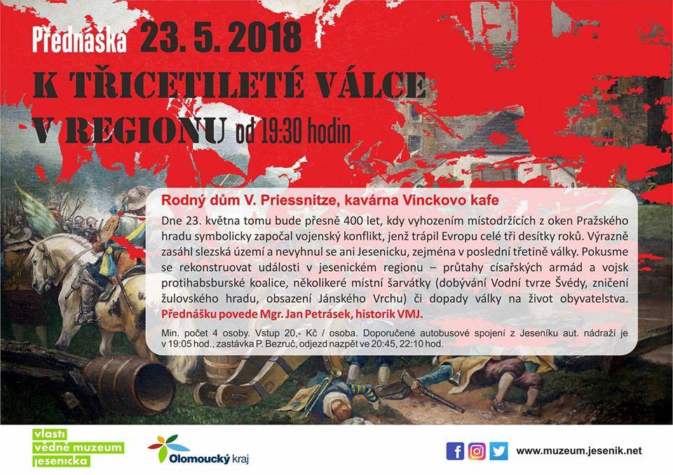 K Třicetileté válce v regionu (přednáška)23.05.2018 23. května 2018, Rodný dům Vincenze Priessnitze, kavárna Vinckovo kafe, přednášel Mgr. Jan Petrásek Fotografie