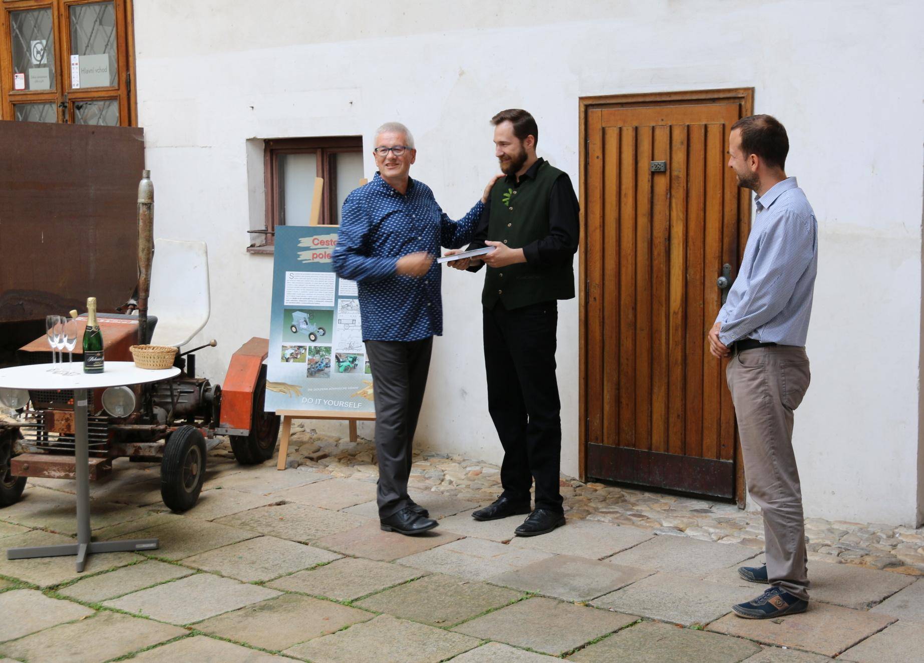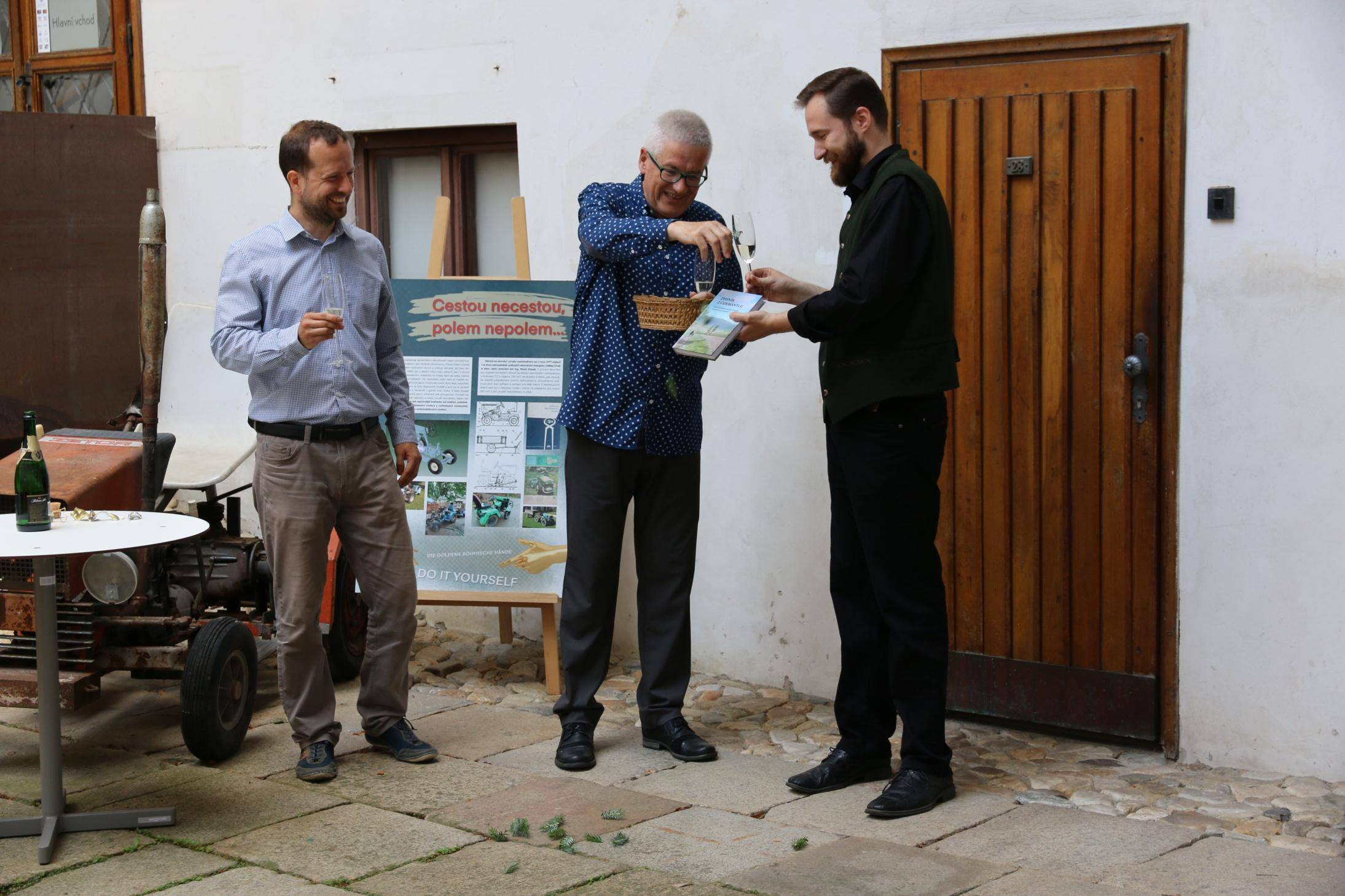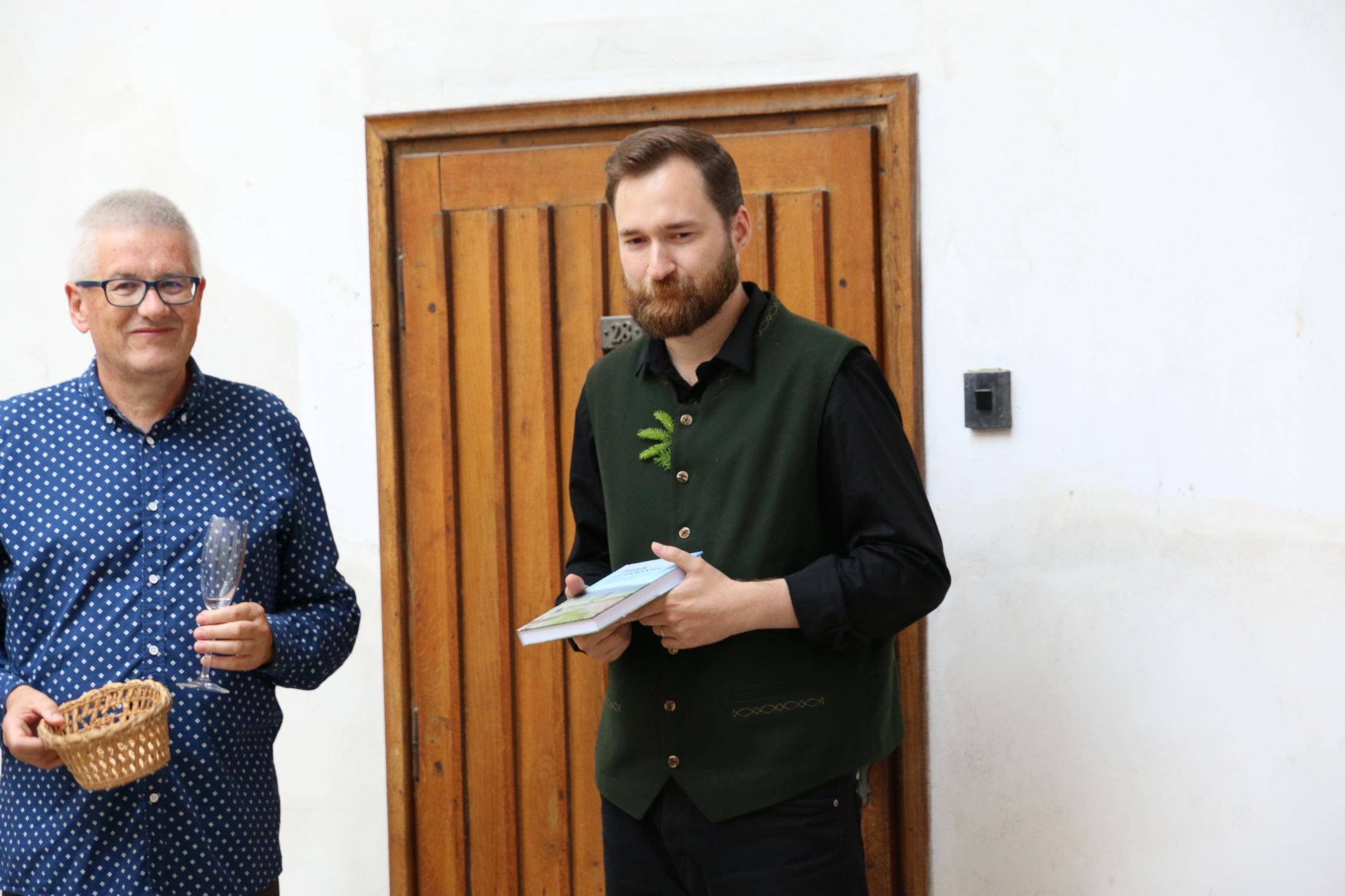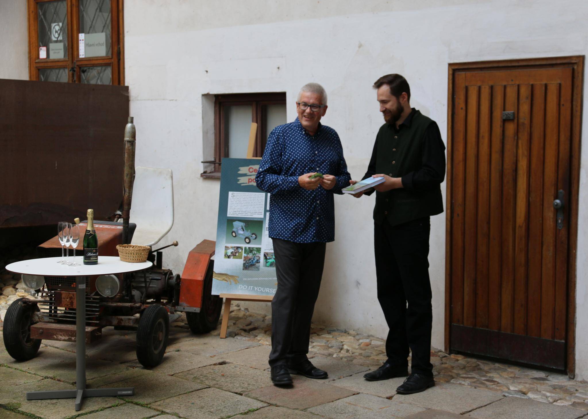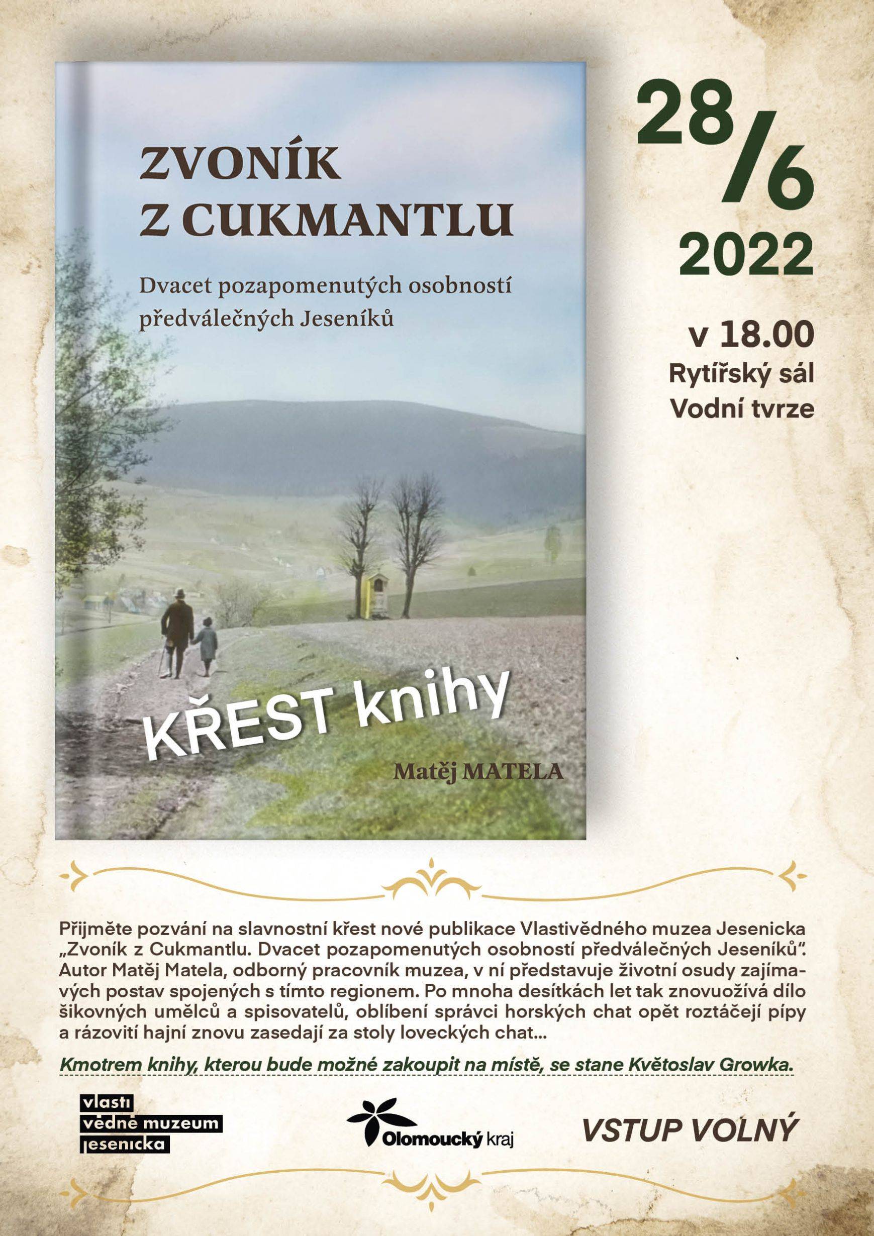 Kniha Zvoník z Cukmantlu slavnostně pokřtěna29.06.2022 V podvečerních hodinách 28. června proběhl za hojné účasti veřejnosti na nádvoří Vodní tvrze křest nejnovější publikace Vlastivědného muzea Jesenicka, pojednávající o dvou desítkách pozoruhodných životních osudů spjatých s Jeseníky. Slavnostní akt zahájil ředitel VMJ Pavel Rušar přivítáním účastníků a reflexí vlastních pocitů z četby knížky. Následně předal slovo autorovi knihy, odbornému pracovníku muzea Matěji Matelovi, jenž se krátce podělil o svůj vztah k předválečným časům a k lidem, které do knihy zařadil, tedy věhlasným osobnostem i svérázným pábitelům. Poté poděkoval těm, kteří mu se vznikem díla nejvíce pomohli, a závěrečné slovo ponechal kmotrovi publikace. Tím se stal Květoslav Growka, někdejší archivář a výrazná postava jesenické vlastivědy, který při svém povídání vzpomněl na počátky znovuobjevování historie tohoto kraje v 90. letech a vyzdvihl, že se vlastivědná práce nástupem nové generace badatelů začíná stále více oprošťovat od resentimentů minulosti. Protože pětinu knihy tvoří vyprávění o starých hajných, rozhodl se kmotr pokřtít ji originálním způsobem – posypal ji smrkovým větvičkami, z nichž jednu vetkl autorovi do zelené lesnické vesty. Šampaňské samozřejmě nechybělo, avšak namísto obálky zchladilo hrdla tří zmíněných řečníků. Knihu si zájemci následně mohli zakoupit a u vedlejšího stolku nechat autorem podepsat. V současné době je titul k dostání ve: