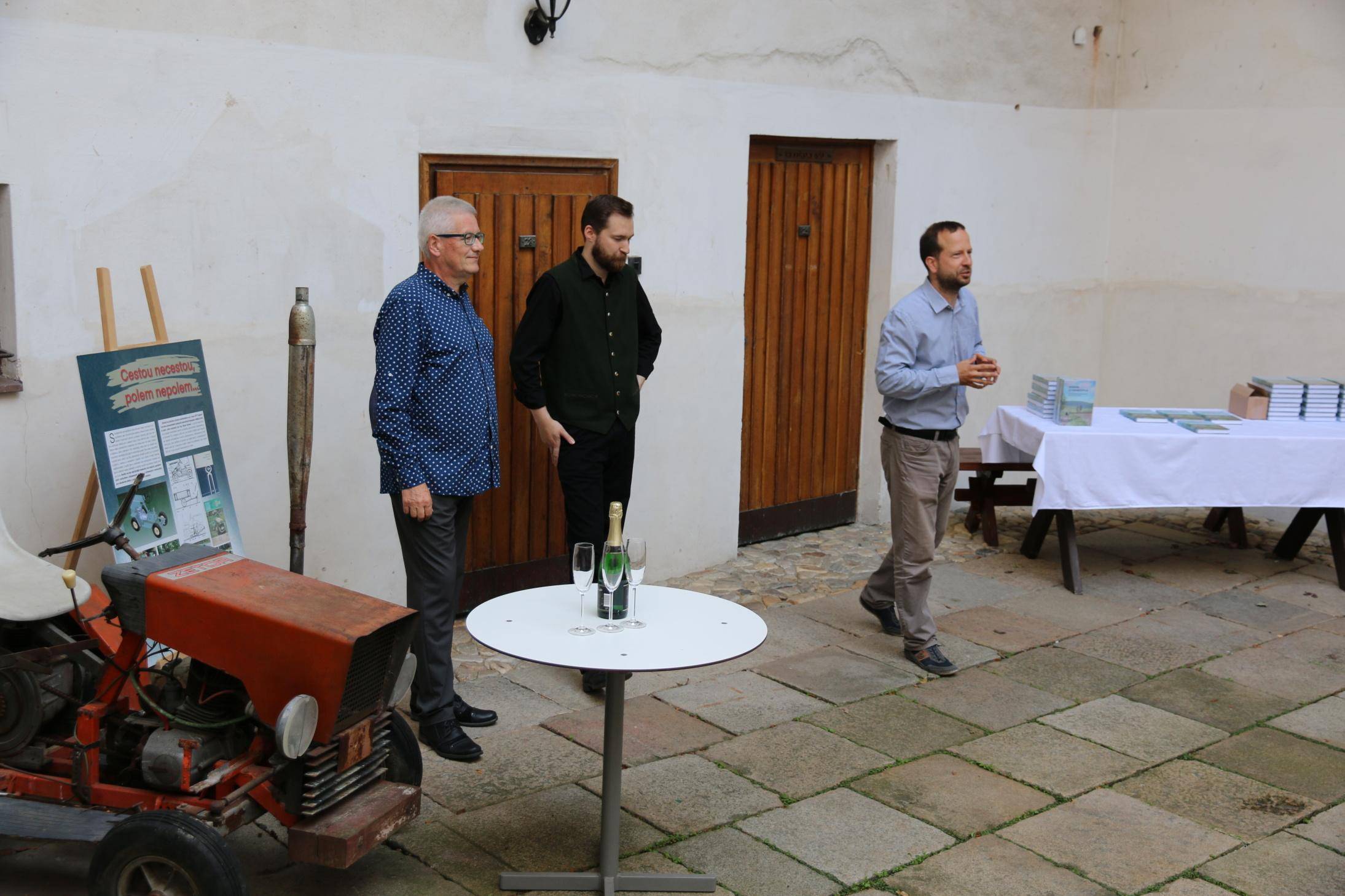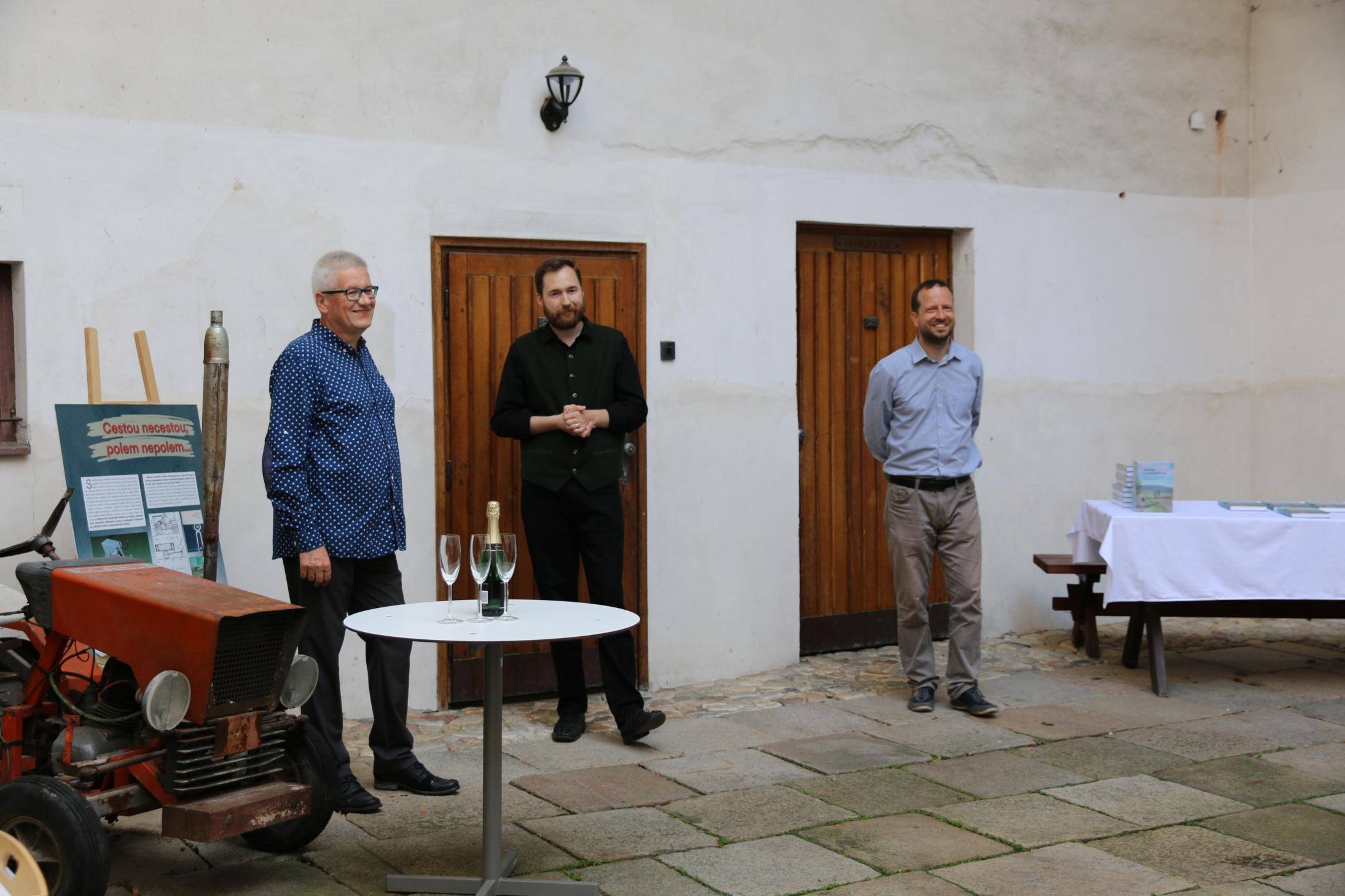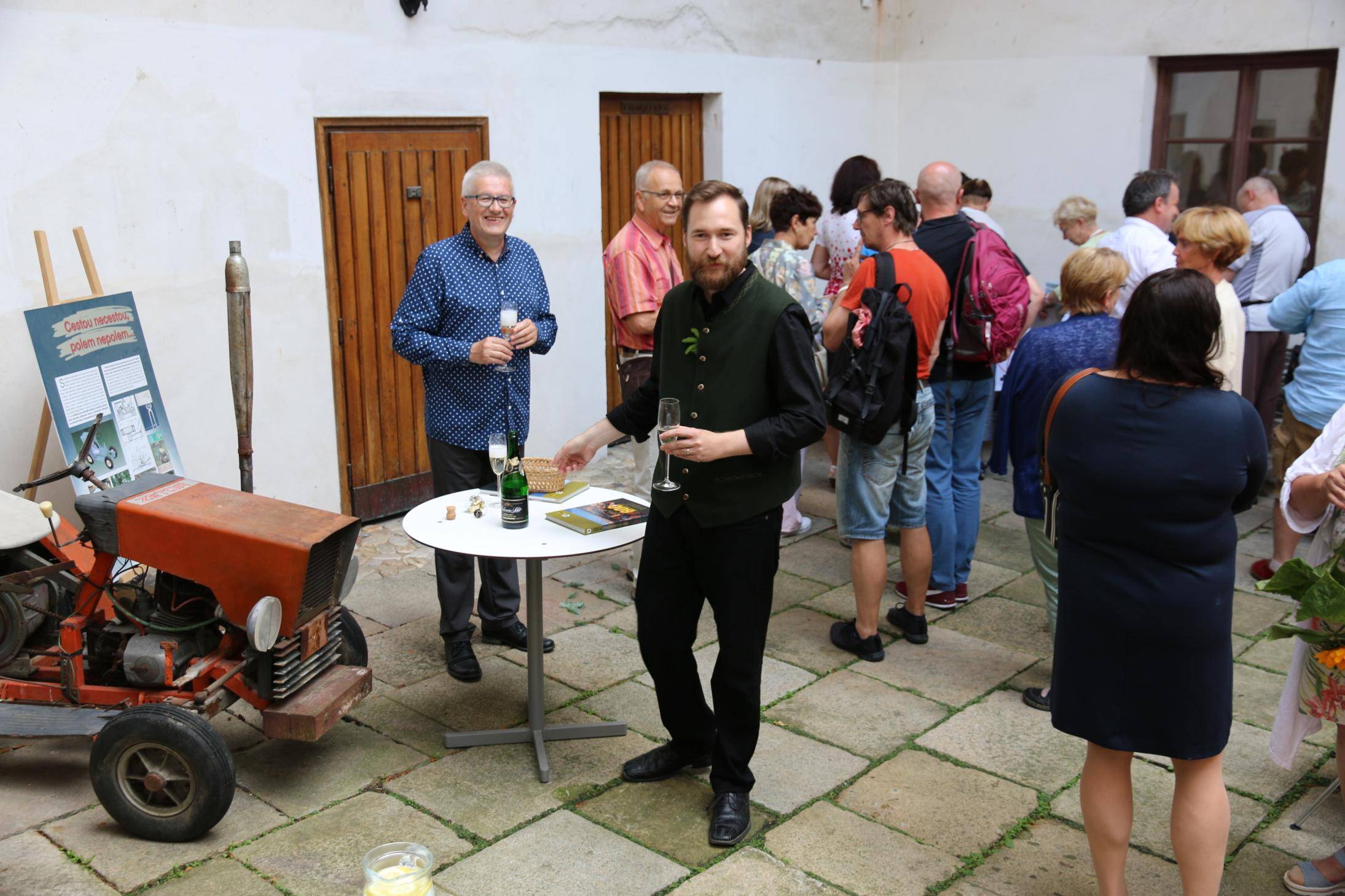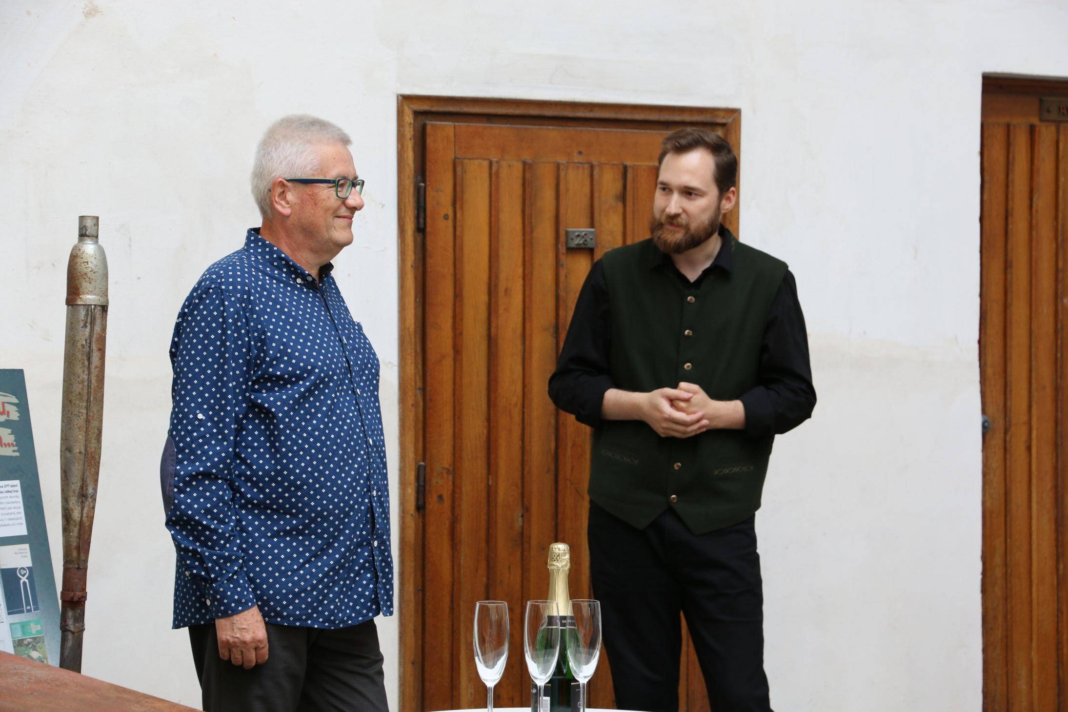Kniha Zvoník z Cukmantlu slavnostně pokřtěna29.06.2022 V podvečerních hodinách 28. června proběhl za hojné účasti veřejnosti na nádvoří Vodní tvrze křest nejnovější publikace Vlastivědného muzea Jesenicka, pojednávající o dvou desítkách pozoruhodných životních osudů spjatých s Jeseníky. Slavnostní akt zahájil ředitel VMJ Pavel Rušar přivítáním účastníků a reflexí vlastních pocitů z četby knížky. Následně předal slovo autorovi knihy, odbornému pracovníku muzea Matěji Matelovi, jenž se krátce podělil o svůj vztah k předválečným časům a k lidem, které do knihy zařadil, tedy věhlasným osobnostem i svérázným pábitelům. Poté poděkoval těm, kteří mu se vznikem díla nejvíce pomohli, a závěrečné slovo ponechal kmotrovi publikace. Tím se stal Květoslav Growka, někdejší archivář a výrazná postava jesenické vlastivědy, který při svém povídání vzpomněl na počátky znovuobjevování historie tohoto kraje v 90. letech a vyzdvihl, že se vlastivědná práce nástupem nové generace badatelů začíná stále více oprošťovat od resentimentů minulosti. Protože pětinu knihy tvoří vyprávění o starých hajných, rozhodl se kmotr pokřtít ji originálním způsobem – posypal ji smrkovým větvičkami, z nichž jednu vetkl autorovi do zelené lesnické vesty. Šampaňské samozřejmě nechybělo, avšak namísto obálky zchladilo hrdla tří zmíněných řečníků. Knihu si zájemci následně mohli zakoupit a u vedlejšího stolku nechat autorem podepsat. V současné době je titul k dostání ve: