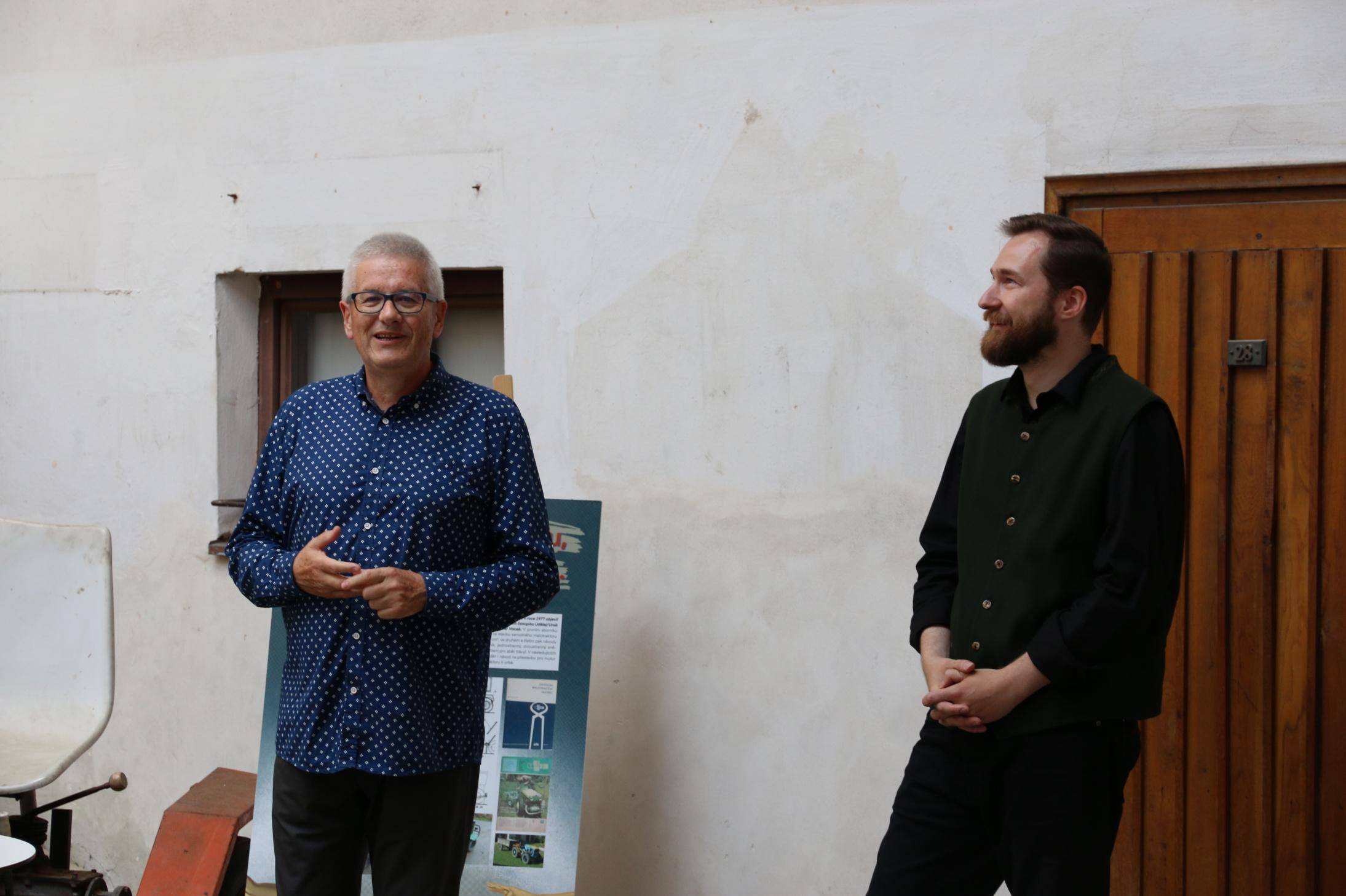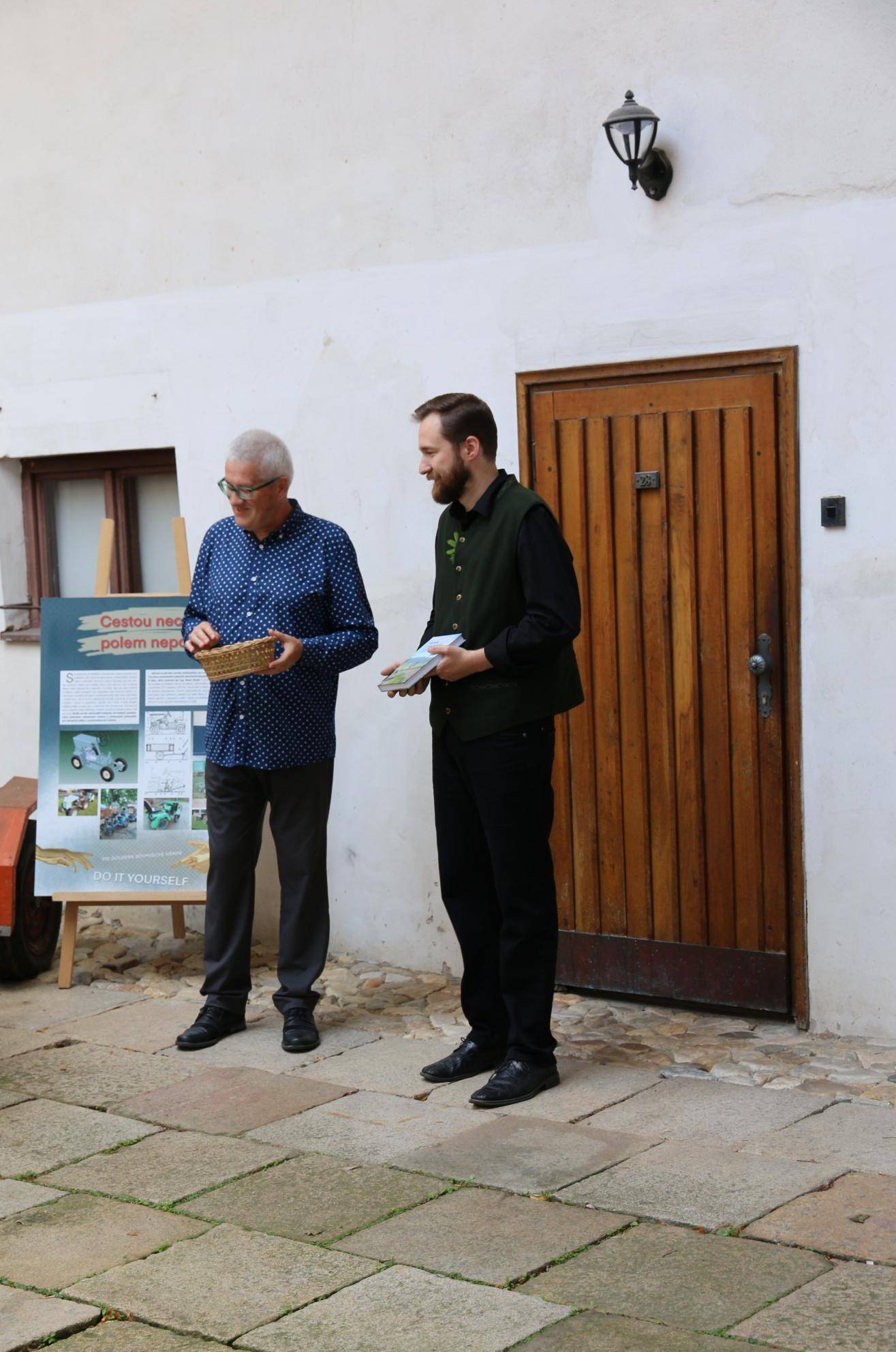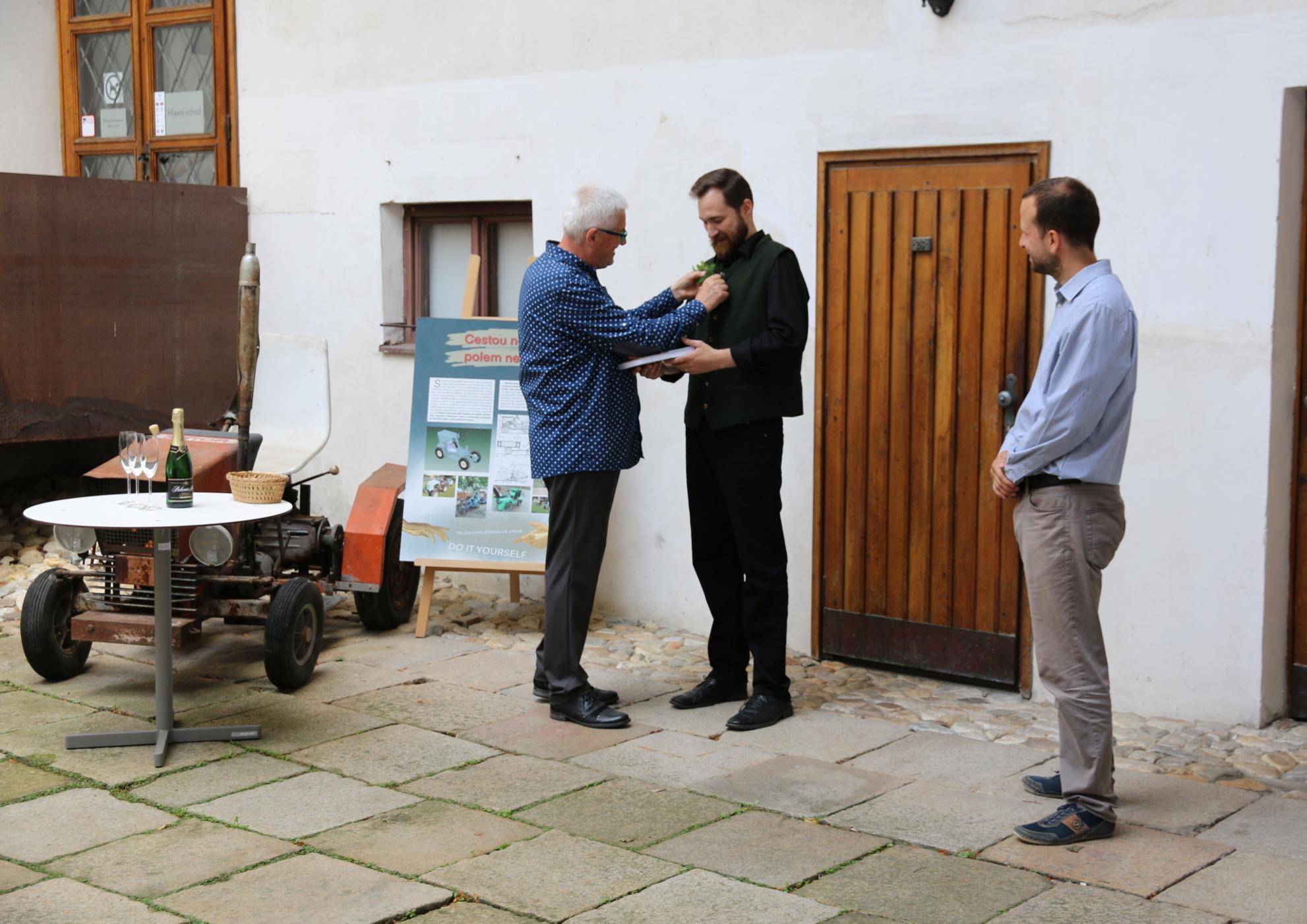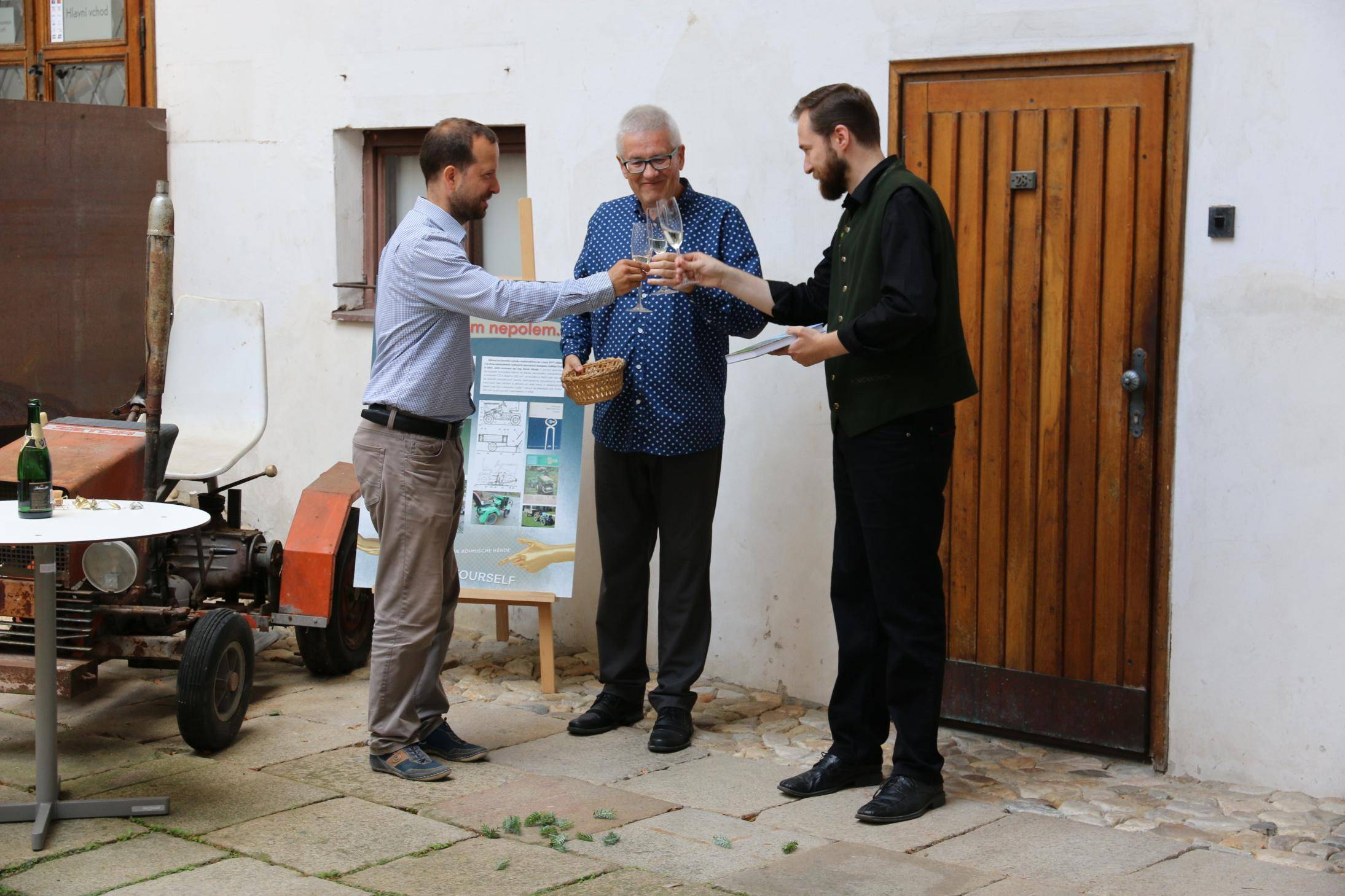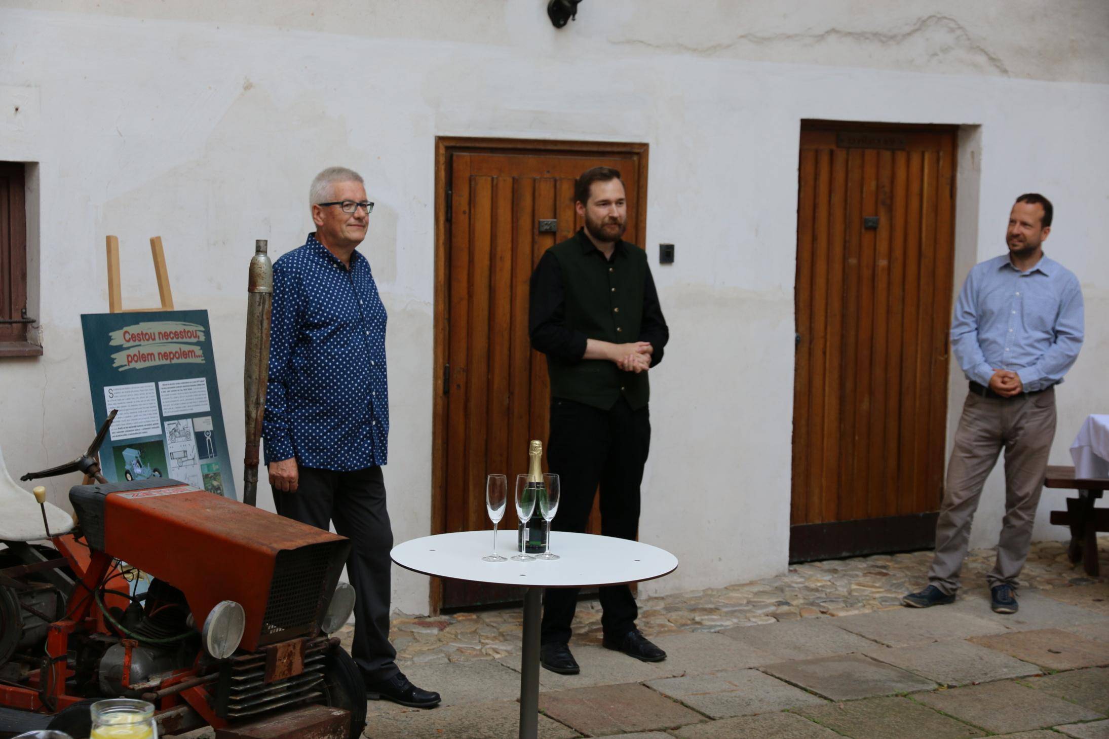 Kniha Zvoník z Cukmantlu slavnostně pokřtěna29.06.2022 V podvečerních hodinách 28. června proběhl za hojné účasti veřejnosti na nádvoří Vodní tvrze křest nejnovější publikace Vlastivědného muzea Jesenicka, pojednávající o dvou desítkách pozoruhodných životních osudů spjatých s Jeseníky. Slavnostní akt zahájil ředitel VMJ Pavel Rušar přivítáním účastníků a reflexí vlastních pocitů z četby knížky. Následně předal slovo autorovi knihy, odbornému pracovníku muzea Matěji Matelovi, jenž se krátce podělil o svůj vztah k předválečným časům a k lidem, které do knihy zařadil, tedy věhlasným osobnostem i svérázným pábitelům. Poté poděkoval těm, kteří mu se vznikem díla nejvíce pomohli, a závěrečné slovo ponechal kmotrovi publikace. Tím se stal Květoslav Growka, někdejší archivář a výrazná postava jesenické vlastivědy, který při svém povídání vzpomněl na počátky znovuobjevování historie tohoto kraje v 90. letech a vyzdvihl, že se vlastivědná práce nástupem nové generace badatelů začíná stále více oprošťovat od resentimentů minulosti. Protože pětinu knihy tvoří vyprávění o starých hajných, rozhodl se kmotr pokřtít ji originálním způsobem – posypal ji smrkovým větvičkami, z nichž jednu vetkl autorovi do zelené lesnické vesty. Šampaňské samozřejmě nechybělo, avšak namísto obálky zchladilo hrdla tří zmíněných řečníků. Knihu si zájemci následně mohli zakoupit a u vedlejšího stolku nechat autorem podepsat. V současné době je titul k dostání ve: