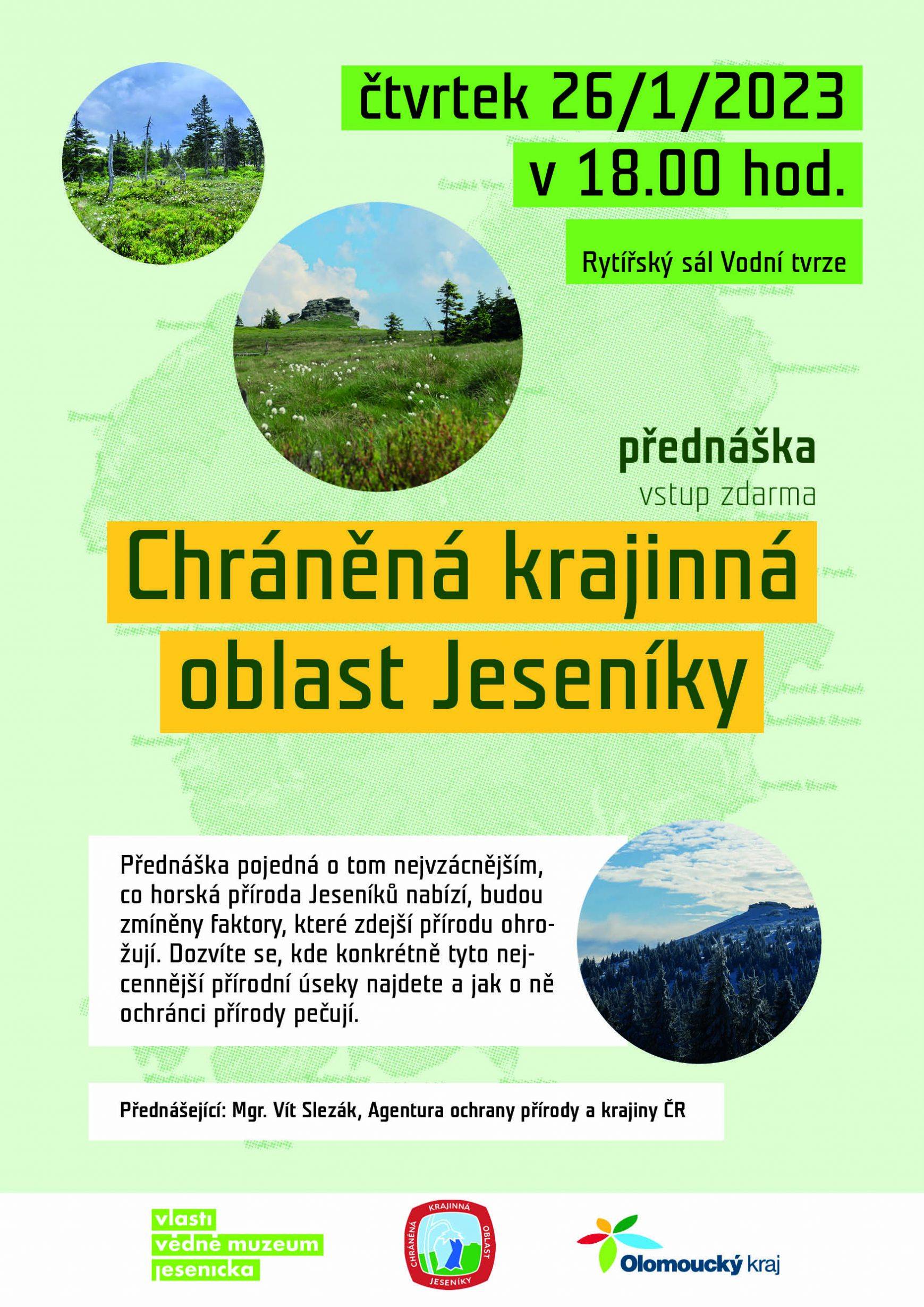 Chráněná krajinná oblast Jeseníky (přednáška)26.01.2023 Ve čtvrtek 26. ledna v Rytířském sále Vodní tvrze, přednášel Mgr. Vít Slezák (Agentura ochrany přírody a krajiny ČR) Přednáška pojednávala o tom nejvzácnějším, co horská příroda Jeseníků nabízí, byly zmíněny faktory, které zdejší přírodu ohrožují. Dozvěděli jsme se, kde konkrétně tyto nejcennější přírodní úseky najdeme a jak o ně ochránci přírody pečují. | |