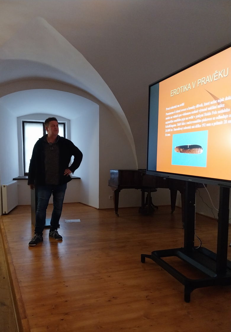Přednáška o dějinách sexu13.04.2023 V podvečerních hodinách 13. dubna proběhl v Rytířském sále Vodní tvrze v Jeseníku druhý díl netradičně zaměřené přednášky, tentokrát na téma Sex a erotika v dějinách lidstva. Po prvním díle, kdy byla představena historie záchodů v dějinách lidstva, se nyní účastníci přenesli k další lidské činnosti, která nás zásobuje endorfinem. Časově se vyprávění dotklo všech historických epoch, pravěkem počínaje a současností konče. Přednáška byla doplněna řadou fotografií z různých archeologických výzkumů či zpráv týkajících se této bohulibé lidské činnosti. Večerem provázel Mgr. Milan Rychlý, archeolog VMJ. | |