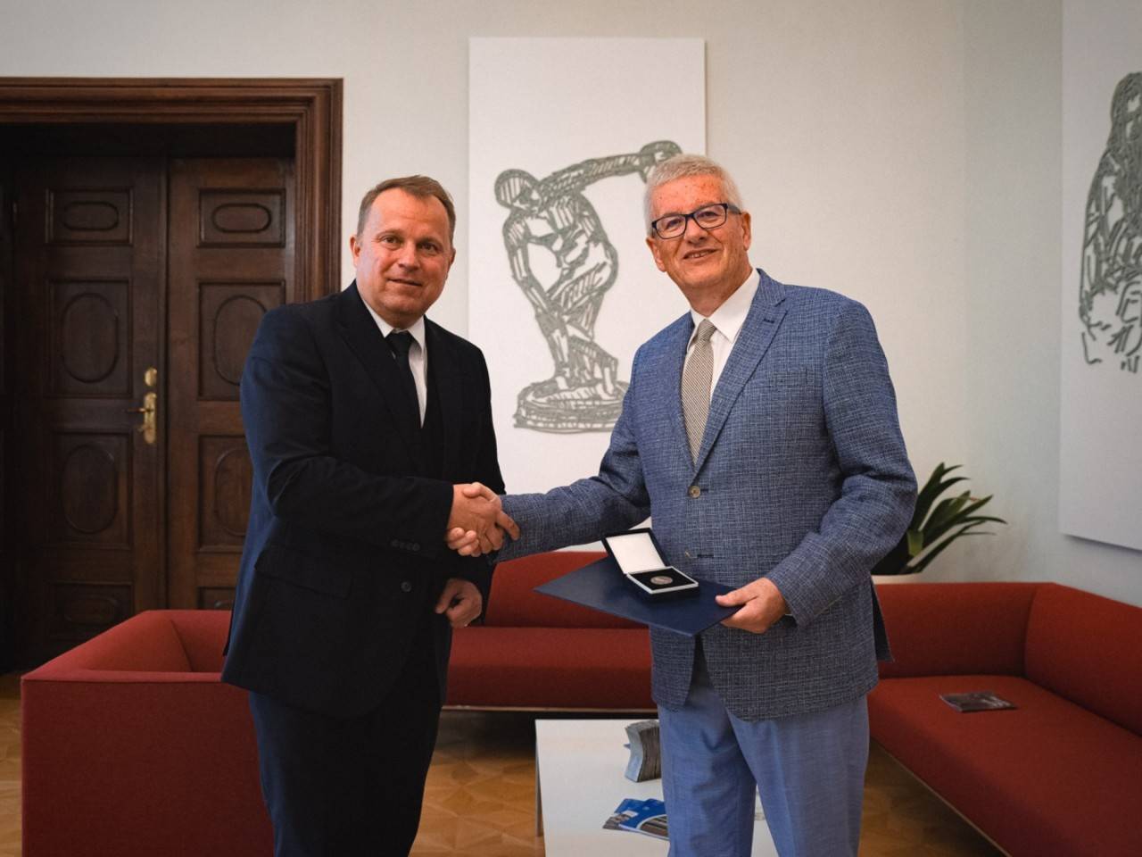 Dlouholetý spolupracovník muzea a bývalý archivář Květoslav Growka oceněn Univerzitou Palackého03.07.2023 Rektor Univerzity Palackého v Olomouci prof. Martin Procházka předal stříbrnou Pamětní medaili Univerzity Palackého v Olomouci Mgr. Květoslavu Growkovi za dlouhodobou odbornou práci v oblasti faleristiky, a to zejména při zmapování a kategorizaci univerzitních medailí. „Nutno podotknout, že Univerzita Palackého není jedinou institucí, která je panu Growkovi vděčná. I u nás v muzeu o tom něco víme," s úsměvem doplnil ředitel Vlastivědného muzea Jesenicka Pavel Rušar. K získání prestižního ocenění blahopřejeme! | |