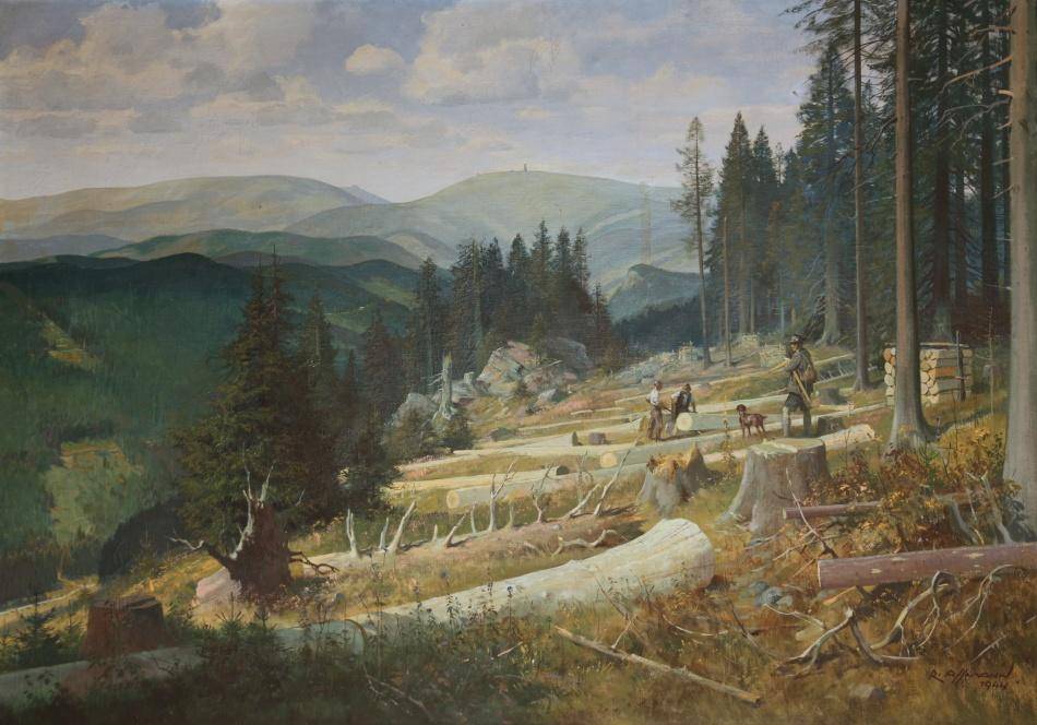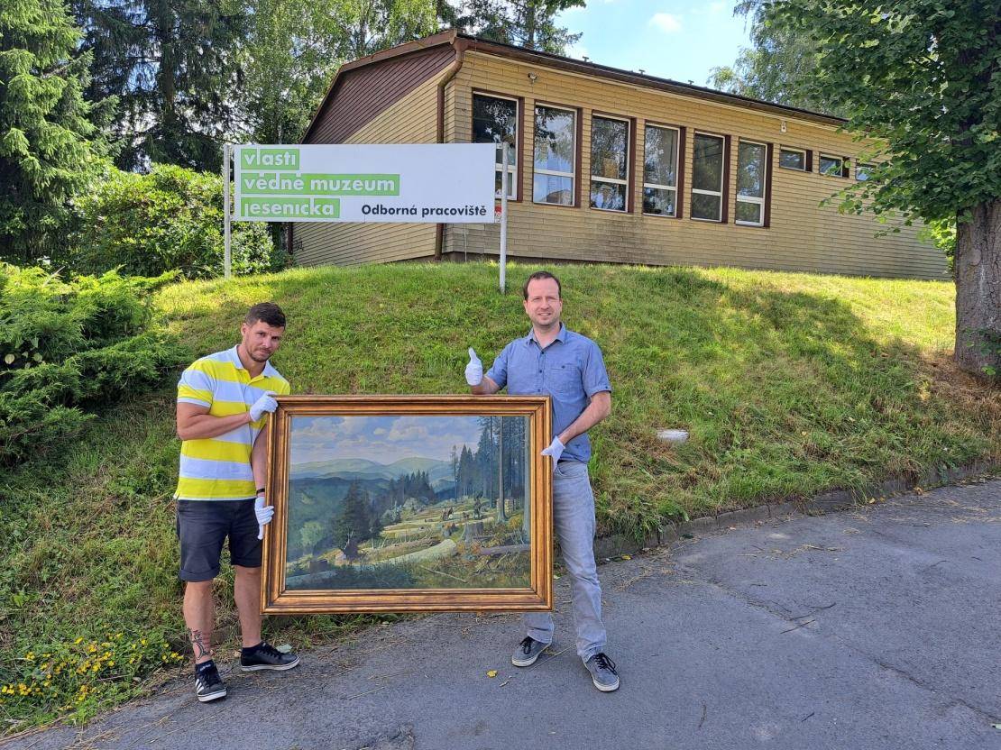 Assmannův Pohled na Praděd v muzejních sbírkách!03.07.2023 Po dlouhé snaze muzejních pracovníků získat obraz Pohled na Praděd (1944) od Richarda Assmanna do sbírek Vlastivědného muzea Jesenicka je nyní možné ohlásit úspěch. Velké poděkování patří majitelům, zejména panu Tomáši Herajtovi a paní Ivaně Herajtové, kteří souhlasili s prodejem obrazu do muzea za nižší než tržní cenu, a také Olomouckému kraji, který poskytl dotaci na nákup. Obraz bude v nejbližší době zrestaurován, čímž bude zachována a podtržena jeho historická hodnota. Richard Assmann (* 1887 † 1965) byl známý spíše svými naivně líbivými obrazy, avšak Pohled na Praděd je dílem sebevědomého malíře a je vpravdě uměleckým počinem, tematicky zachycujícím práci lesníků v horních partiích Hrubého Jeseníku. Posílení sbírek zajistil po zprostředkování Ondřejem Kolářem ředitel VMJ Pavel Rušar. Obraz do své podsbírky převezme historik VMJ, Jan Petrásek. Zmenšeninu obrazu i informace o malíři může zájemce získat v katalogové publikaci Barevná paleta Jesenicka, která je k dostání na recepci Vodní tvrze či v knihkupectví Domeček. | |