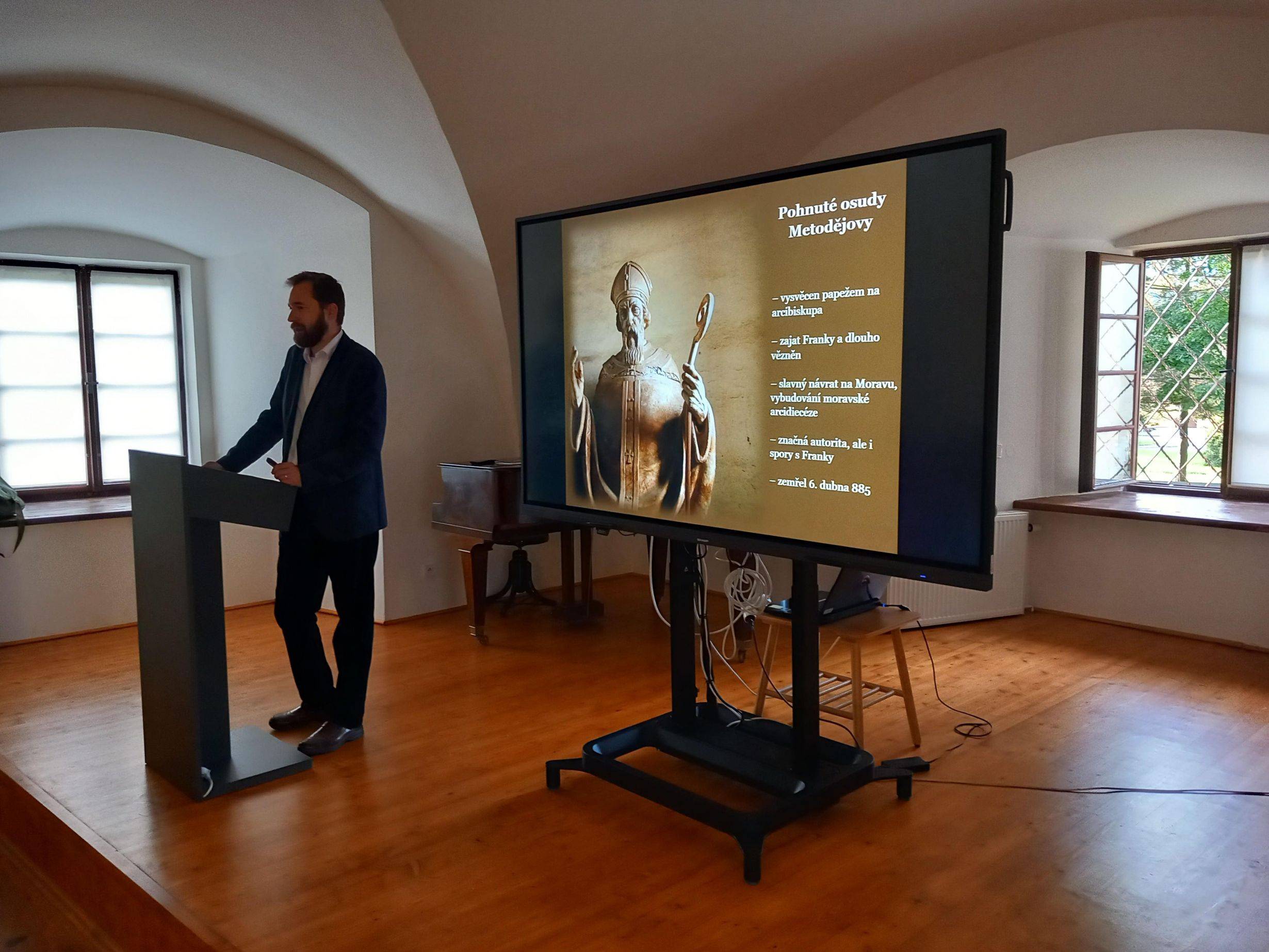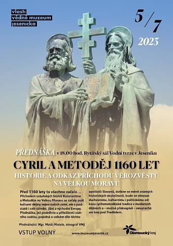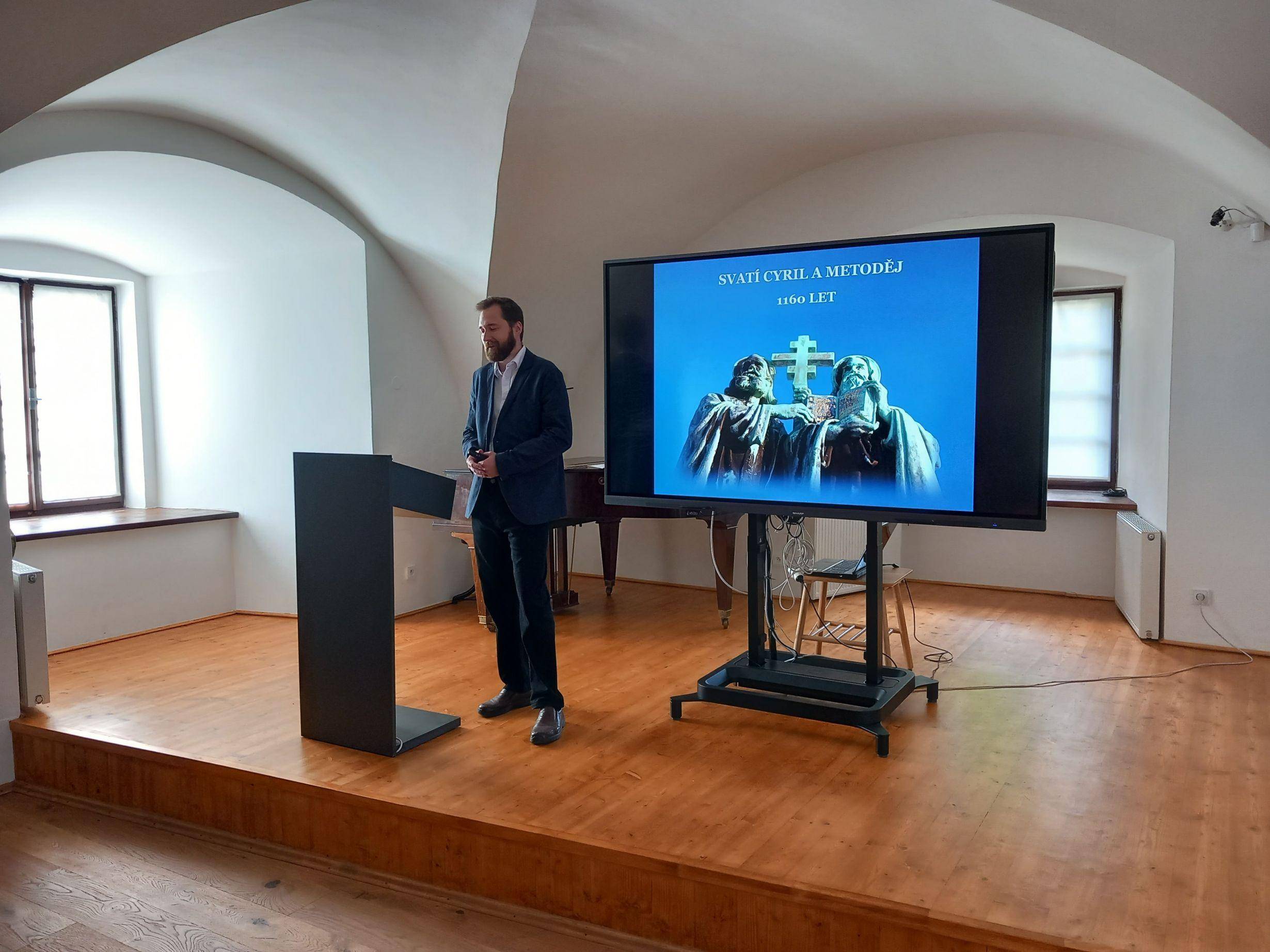 Přednáška připomněla velké dílo a odkaz svatých Cyrila a Metoděje05.07.2023 U příležitosti 1160. výročí příchodu soluňských bratrů Cyrila a Metoděje na Velkou Moravu proběhla v Rytířském sále jesenické Vodní tvrze přednáška, která se věnovala tomuto zásadnímu mezníku našich i evropských dějin a zároveň upozornila na mimořádně hluboký duchovní a kulturní odkaz cyrilometodějské tradice v moderních dějinách. „Každý národ se stává Národem ve chvíli, kdy vedle meče a pluhu vezme do ruky i pero a štětec. Před 1160 lety jsme tak díky misionářům z dalekého jihu učinili my a zařadili jsme se po bok kulturních evropských národů.“ Těmito slovy započal svou přednášku etnograf VMJ a vystudovaný balkanista Matěj Matela, který následně přítomným čtyřem desítkám účastníků povyprávěl inspirativní příběh těchto významných mužů od jejich raných let v Soluni přes misijní cesty k Chazarům a na Velkou Moravu až po završení jejich neobyčejné, ale značně obtížné životní pouti. Druhou část přednášky pak vyplnil výklad o proměnách cyrilometodějského odkazu v 19. a 20. století a jeho významu nejen pro formování moderních slovanských národů, ale i o síle, s jakou byl schopen čelit totalitním režimům (prostor byl mimo jiné věnován legendární velehradské pouti roku 1985, kdy věřící vypískali představitele strany a vlády). Na závěr se pak přednášející zmínil o hrstce příkladů toho, jak se cyrilometodějská tradice projevila v Jeseníkách. | |
