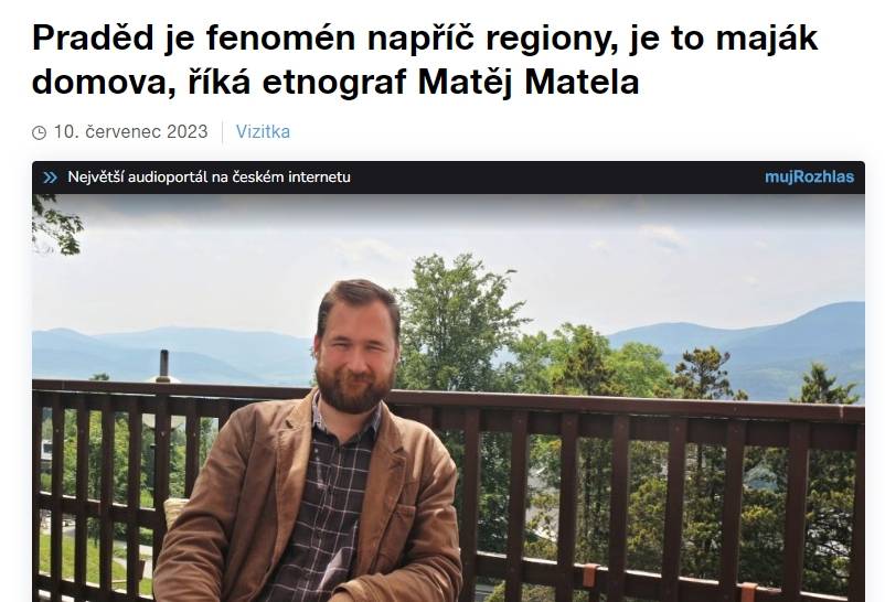 Muzejní etnograf Matěj Matela vyprávěl na vlnách Českého rozhlasu Vltava nejen o Jeseníkách10.07.2023 V oblíbeném pořadu Vizitka Českého rozhlasu Vltava vystoupil 10. července etnograf VMJ Matěj Matela. S redaktorem Alešem Spurným si povídal o svém vztahu k Jeseníkům a celkově práci regionálního vlastivědce, dostali se ale i k jiným tématům, mimo jiné kulturnímu ovzduší střední a jihovýchodní Evropy či vztahu k horám a rodinným kořenům. Pořad provází tematicky zvolené písně Roberta Křesťana, Vlasty Redla či Hradišťanu. Odkaz na pořad zde. | |