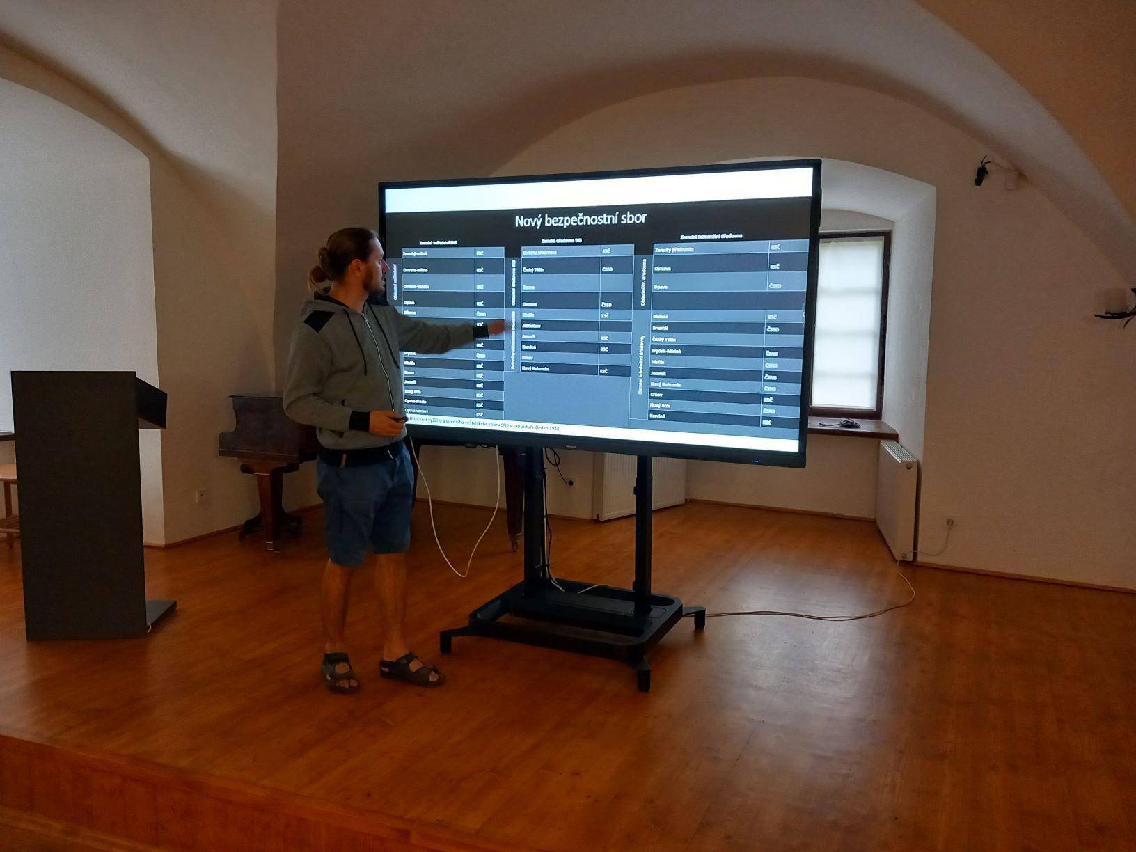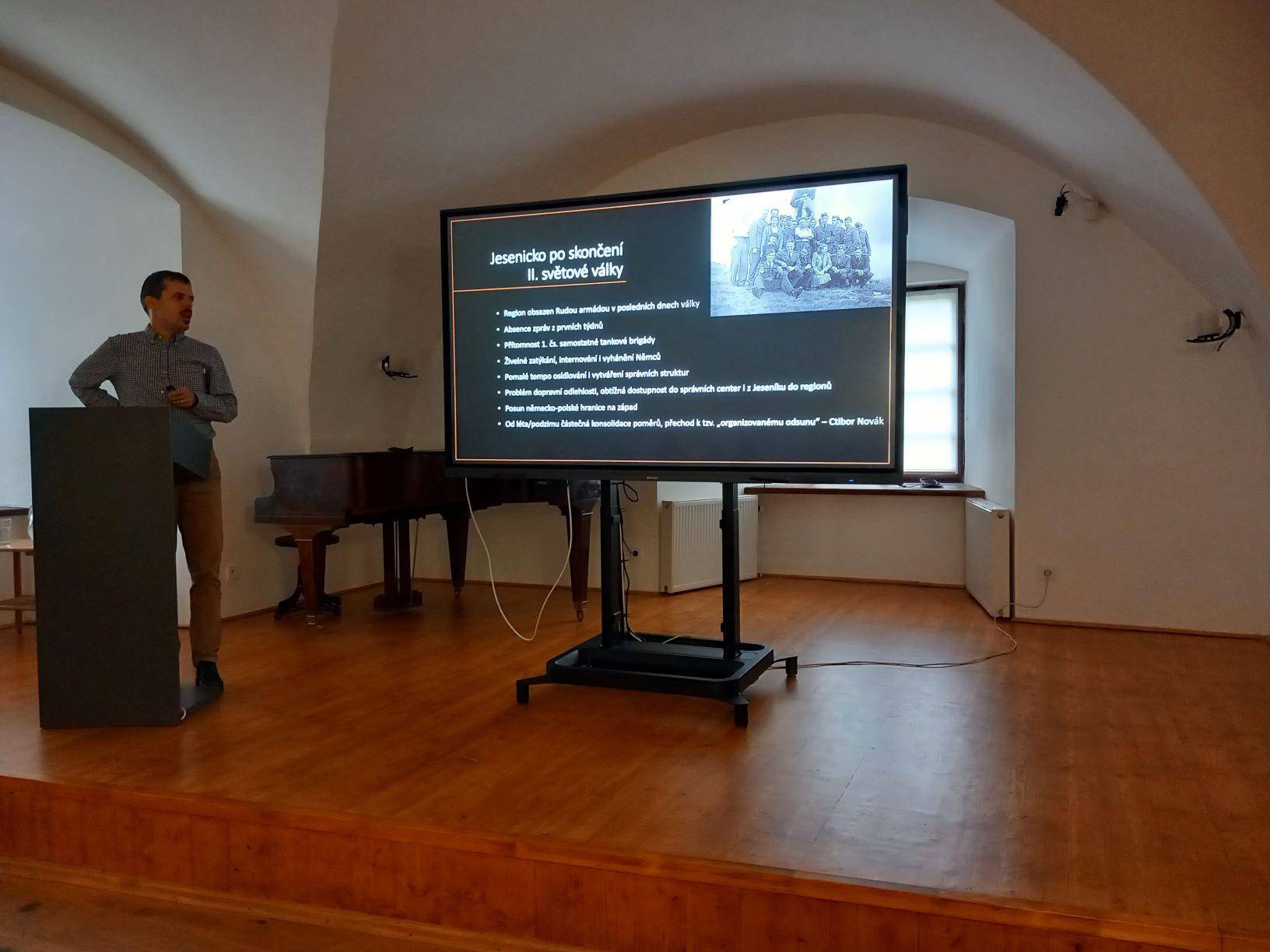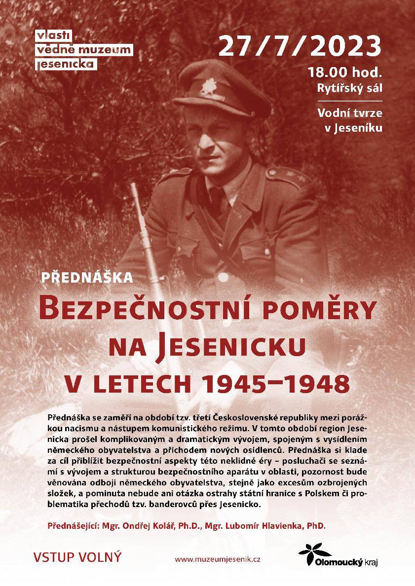 Přednáška přiblížila bezpečnostní poměry na Jesenicku v letech 1945–194827.07.2023 Ve čtvrtek 27. července v Rytířském sále Vodní tvrze v Jeseníku proběhla přednáška historiků Lubomíra Hlavienky a Ondřeje Koláře, zaměřená na bezpečnostní situaci na Jesenicku v prvních letech po druhé světové válce. V úvodní části přednášející popsali proces vytváření Sboru národní bezpečnosti a jeho postupné ovládnutí komunistickou stranou. Následoval výklad o situaci na nové československo-polské hranici. Dále se pozornost soustředila na často mytizované téma německého odboje proti československé správě a na činnost tzv. Werwolfu. Pominuty nebyly ani různé aspekty každodenního života příslušníků SNB v tehdejším neklidném pohraničí, který s sebou přirozeně přinášel i kázeňské problémy a prohřešky. Závěrečná část přednášky pak přiblížila přechody tzv. banderovců přes československé území v letech 1947 a 1948, které se okrajově dotkly i Jesenicka. | |