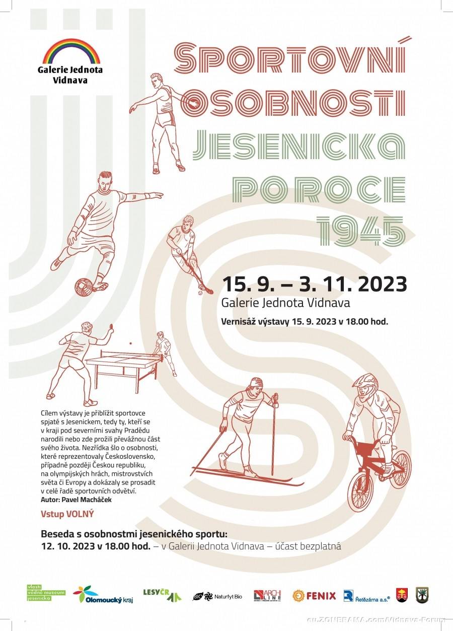 Výstava "Sportovní osobnosti Jesenicka po roce 1945" se přestěhovala do Vidnavy15.09.2023 V pátek 15. září 2023 se ve vidnavské galerii Jednota konala slavnostní vernisáž výstavy pracovníka Vlastivědného muzea Jesenicka Pavla Macháčka věnovaná sportovním osobnostem Jesenicka po roce 1945. Přibližuje více než sedm desítek sportovců, kteří proslavili region pod Pradědem a dokázali se prosadit nejen mezi republikovou, ale často i mezi evropskou a světovou elitou. Právě Vidnavou zahájila výstava plánovanou pouť po regionálních galeriích – na začátku příštího roku se zájemcům představí také ve Zlatých Horách a v Javorníku. | |