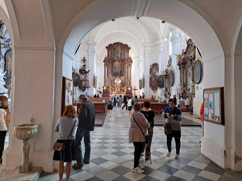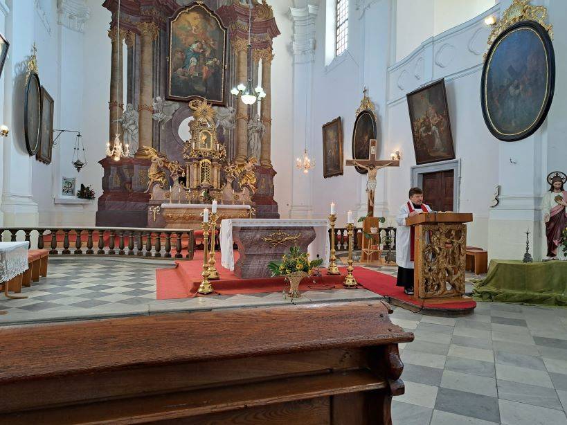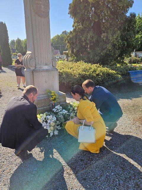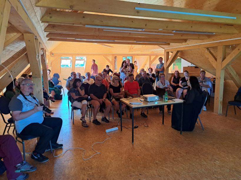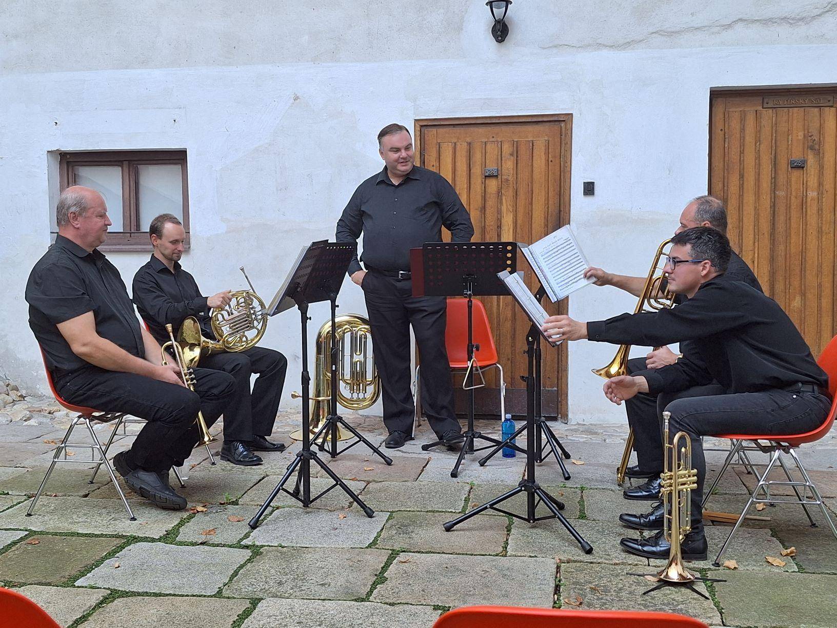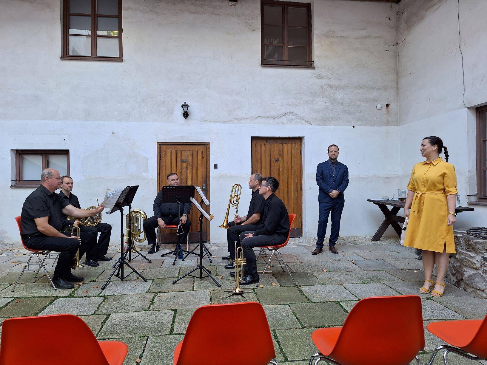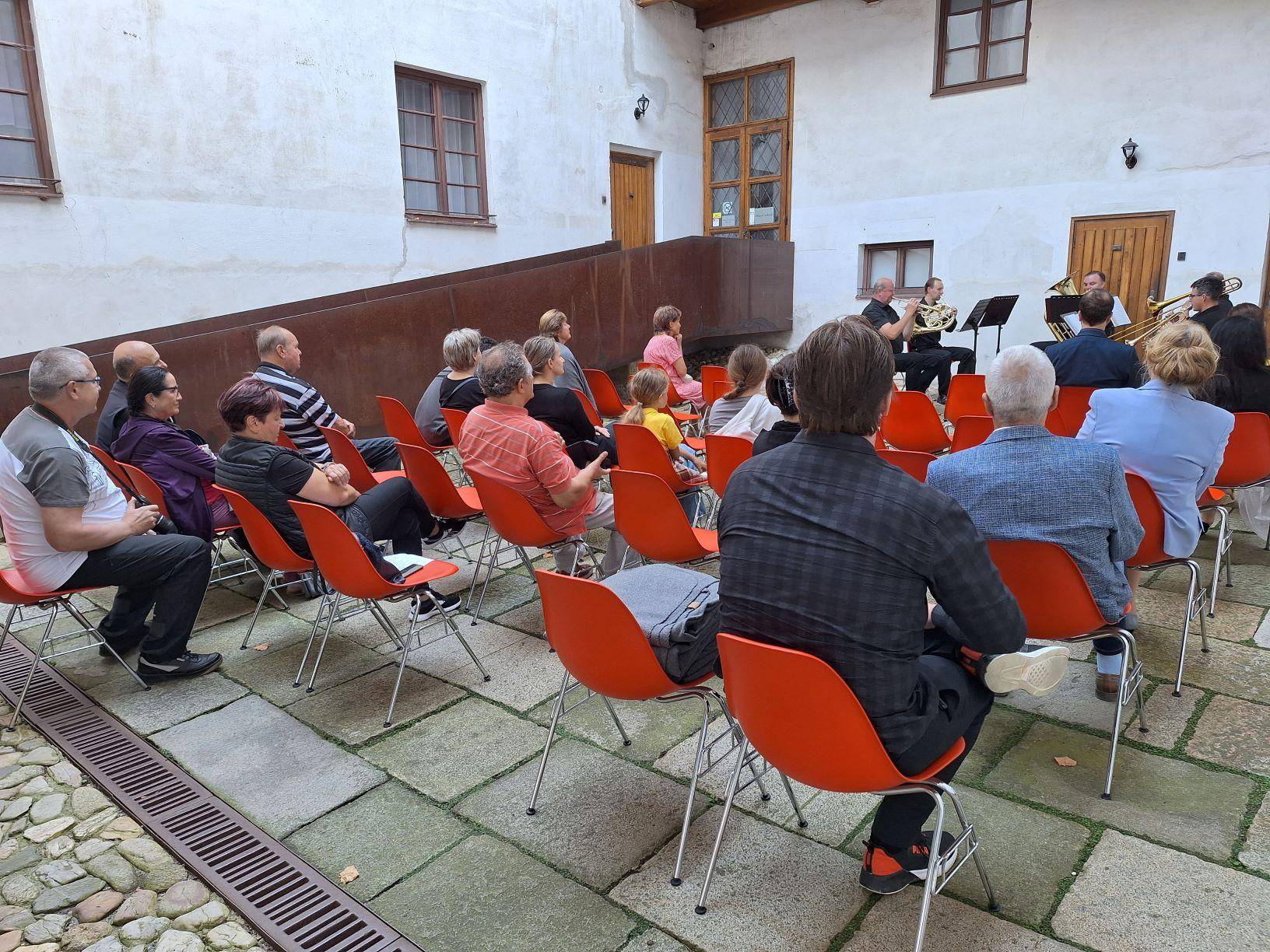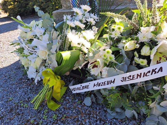 Druhou část svatováclavského setkání vyplnila komentovaná prohlídka, pietní akt a slavnostní koncert28.09.2023 Po skončení svatováclavského sympozia (psali jsme zde: odkaz) se zájemci o letošní tematiku, jíž byl Zločin a trest na Jesenicku, sešli v budově Policie ČR na Moravské ulici v Jeseníku. Zde proběhla krátká komentovaná prohlídka výstavy, věnované historii objektu policejní služebny (bývalých hraničářských kasáren) a také dějinám bezpečnostních sborů na Jesenicku. Návštěvníci si mohli prohlédnout rovněž ukázky policejních nášivek a přileb z různých zemí, které shromáždil autor výstavy, sběratel Jan Grund. Přítomné provedl výstavou historik VMJ Ondřej Kolář. Druhý, sváteční den setkání začal ranní bohoslužbou v kostele Navštívení Panny Marie v Bílé Vodě. Mše byla následována pietním aktem na nedalekém hřbitově, kde byla připomenuta násilná internace ze strany komunistické vlády v 50. letech 20. století. Věnce na památku řádových sester mnoha kongregací položili místostarosta města Jeseník Václav Urban, vedoucí Státního okresního archivu v Jeseníku Kateřina Jurková a ředitel Vlastivědného muzea Jesenicka Pavel Rušar. Historii místa a tématu následně podrobněji přiblížila ve své přednášce archivářka Michaela Neubauerová. XXIII. svatováclavské setkání bylo zakončeno koncertem ke Dni české státnosti, který se uskutečnil na nádvoří Vodní tvrze. Návštěvníci se nejprve zaposlouchali do vážných tónů Jesenických žesťů, následně však došlo i na úsměvné rozloučení s letošním ročníkem, neboť František Mech, šéfkapelník kvinteta, zavelel také k lidovějšímu a všem dobře známému repertoáru. | |