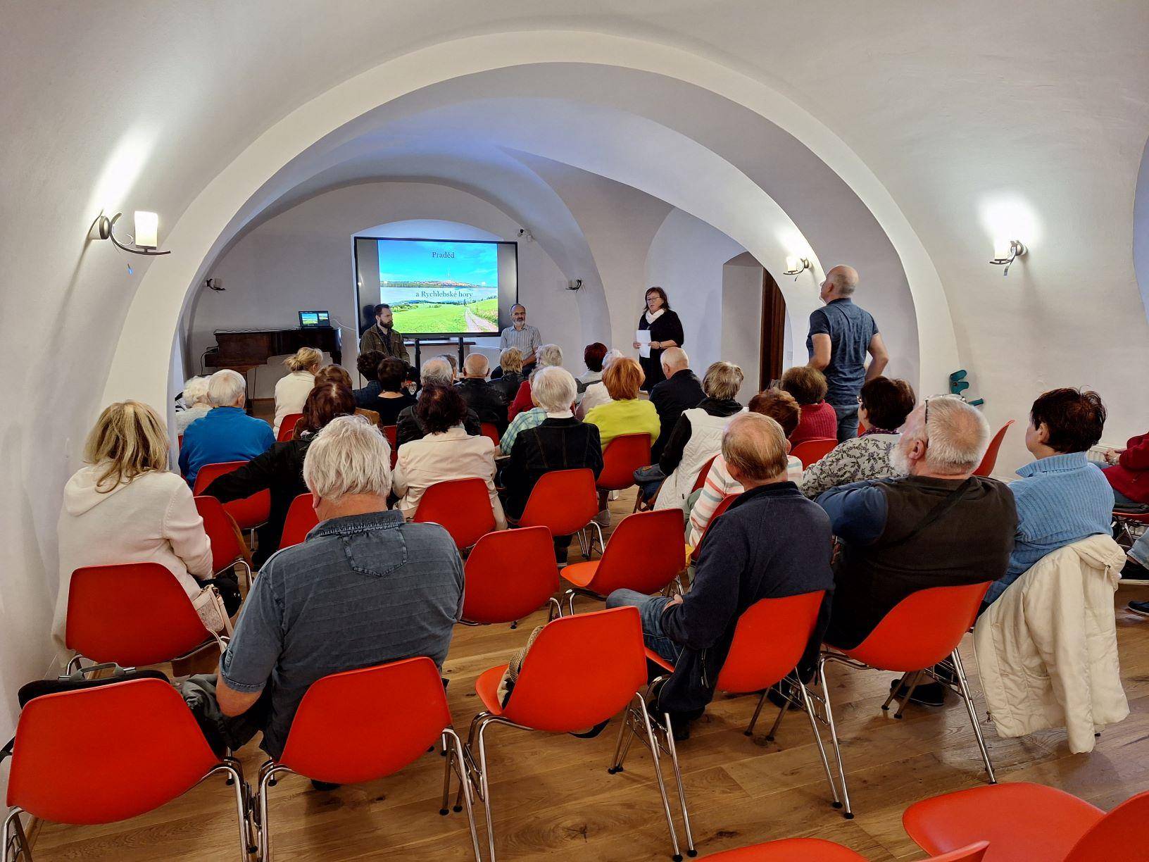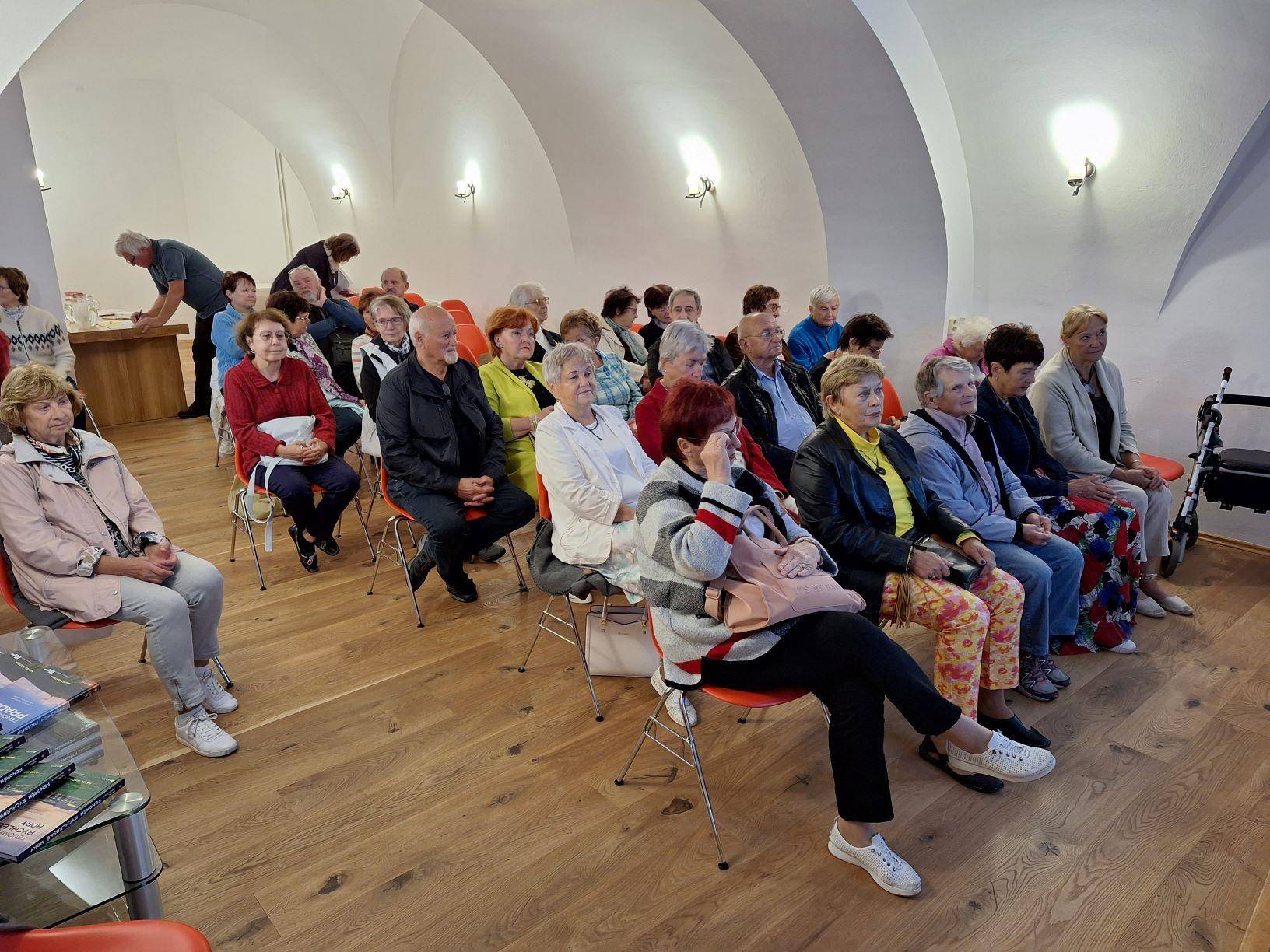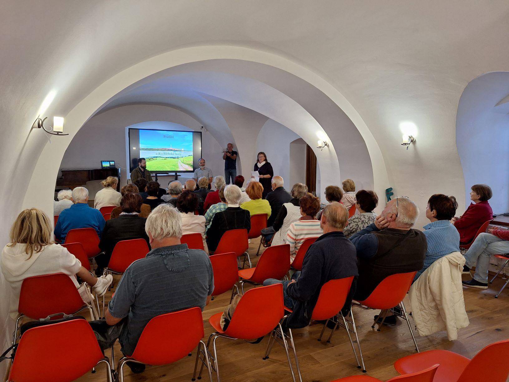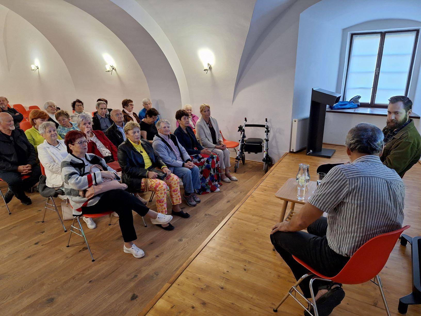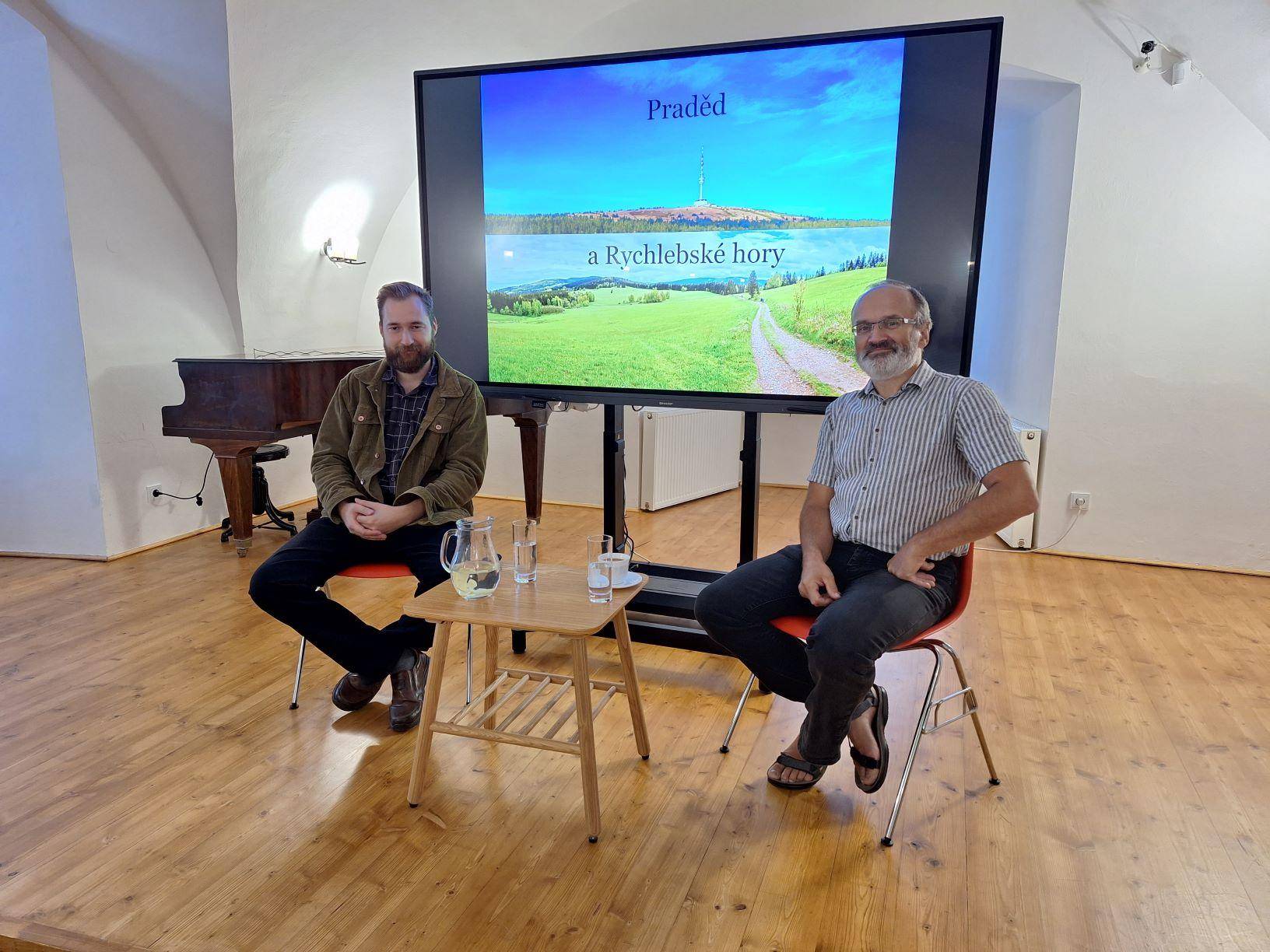 Beseda o horských fenoménech pro seniory měla úspěch05.10.2023 Ve čtvrtek dopoledne 5. října 2023 proběhlo v rámci Dnů seniorů města Jeseník v Rytířském sále Vlastivědného muzea Jesenicka slavnostní zahájení Akademie třetího věku 2023/2024, jehož součástí byla beseda s pracovníky Vlastivědného muzea Jesenicka nad dvěma tituly regionální literatury. Etnograf VMJ Matěj Matela a odborný pracovník muzea Pavel Macháček formou velkoplošné prezentace a poutavého vyprávění představili seniorům lokality, o něž se oba dlouhodobě zajímají a o kterých nedávno vydali publikace: M. Matela „Fenomén Praděd“, P. Macháček pak „Fenomén Rychlebské hory“. Jejich výklad byl okořeněn humorným přátelským špičkováním, díky kterému se přítomní zároveň pobavili. Přednášející následně odpovídali na dotazy z publika, které je ocenilo dlouhým potleskem. Závěr besedy pak patřil prodeji publikací a autogramiádě autorů. | |