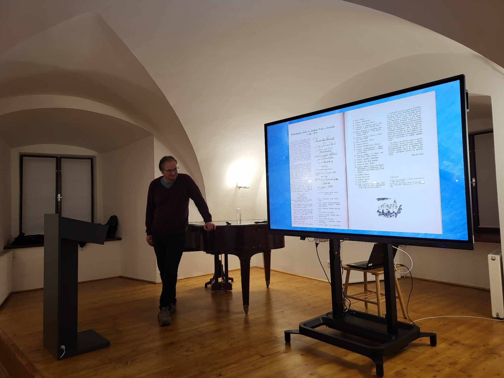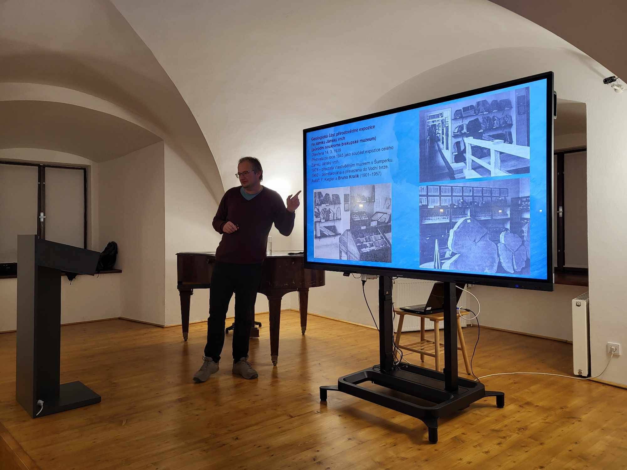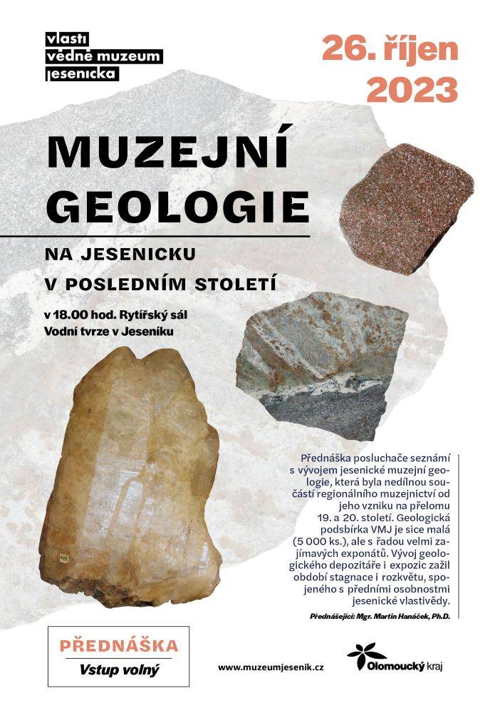 Přednáška připomněla historii jesenické muzejní geologie26.10.2023 Ve čtvrtek 26. října se od 18.00 hod v Rytířském sále Vodní tvrze uskutečnila přednáška geologa VMJ Martina Hanáčka, který přítomné seznámil s dějinami muzejní geologie na Jesenicku. Návštěvníci prošli spolu s přednášejícím všechny etapy 20. století a mimo jiné mohli porovnat současnou geologickou expozici VMJ, oblíbenou Spirálu času Země, s její předchůdkyní, která byla instalována v Galerii Vodní tvrze roku 1988. | |