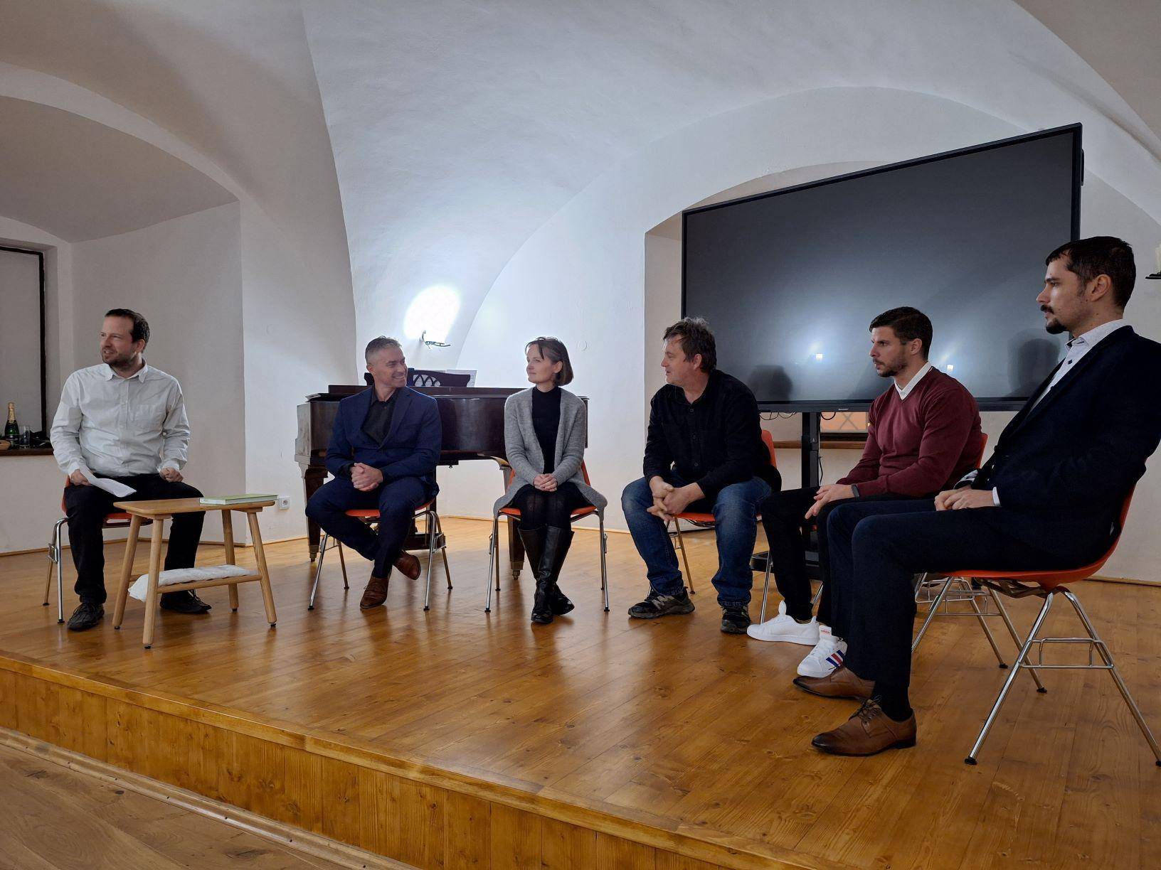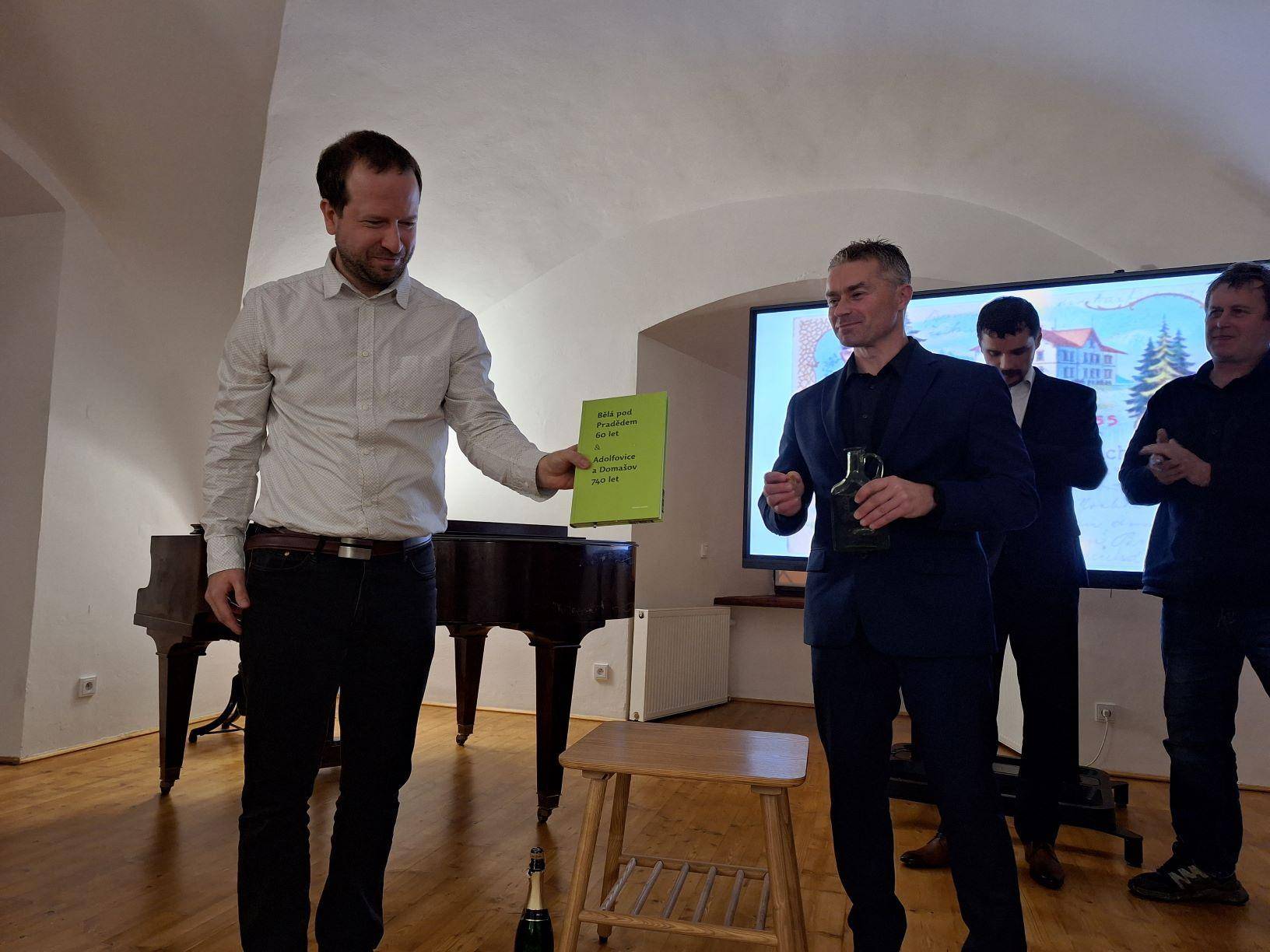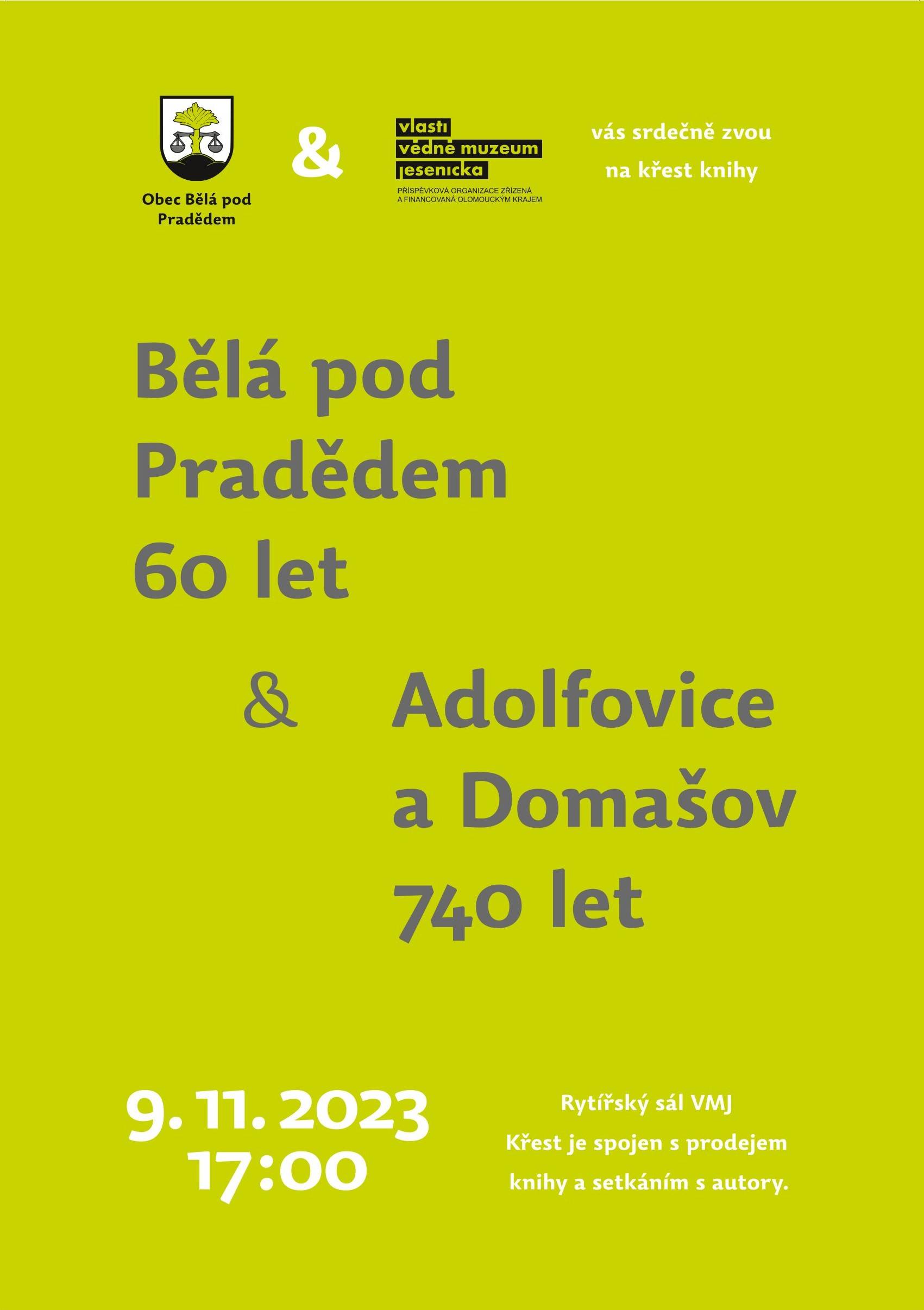 Křest knihy o dějinách obce Bělá pod Pradědem09.11.2023 V podvečerních hodinách ve čtvrtek 9. listopadu 2023 proběhl ve Vodní tvrzi křest knihy Bělá pod Pradědem 60 let & Adolfovice a Domašov 740 let, která syntetickým způsobem pojednává o dějinách obce Bělá pod Pradědem včetně všech jejích soudobých částí. Knihu několik let připravovali současní i bývalí pracovníci Vlastivědného muzea Jesenicka, externí spolupracovníci a zaměstnanci obecního úřadu, to vše za spolupráce s mnoha dobrovolníky a pamětníky z obce. Setkání zahájil ředitel muzea Pavel Rušar krátkou retrospektivou, zavzpomínal na několik pracovních setkání s bývalým starostou obce M. Kružíkem, s nímž začal před pěti lety návrh zpracování dějin obce projednávat, a za spolupráci poděkoval i současnému starostovi R. Neugebauerovi. Ten se vzápětí ujal slova a z jeho rukou také vylétl špunt slavnostní lahve šampaňského. Křtilo se však vodou z pramene řeky Bělé. Večer obohatila panelová diskuze s autory, promítání historických i současných fotografií a také tóny klavíru v podání Josefíny Jankové. Textovou část knihy vytvořili historikové Jan Petrásek, Božena Kaňáková, Kamil Tomášek a Jan Stejskal, pracovník popularizace regionální vlastivědy Pavel Macháček a archeolog Milan Rychlý. Kniha se zabývá historií obce od pravěkých nálezů až po soudobé dějiny. Zakoupit ji můžete ve Vodní tvrzi v Jeseníku či na obecním úřadě Bělé pod Pradědem. | |