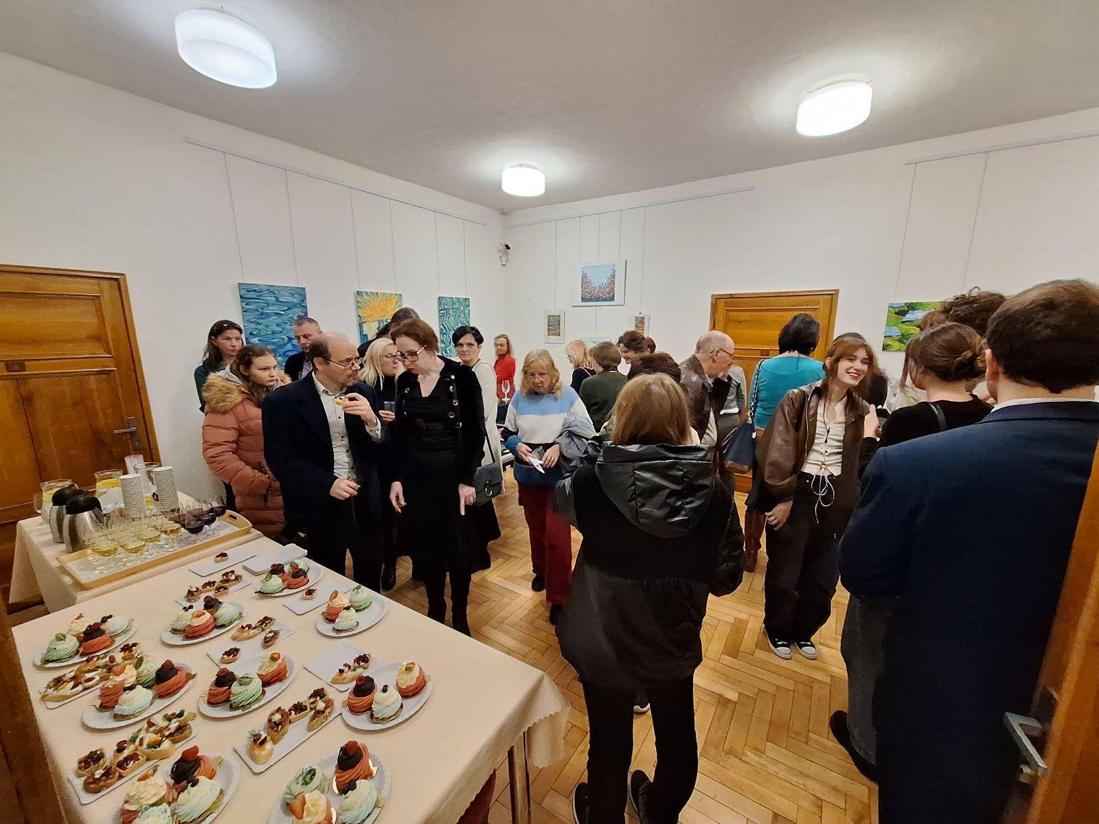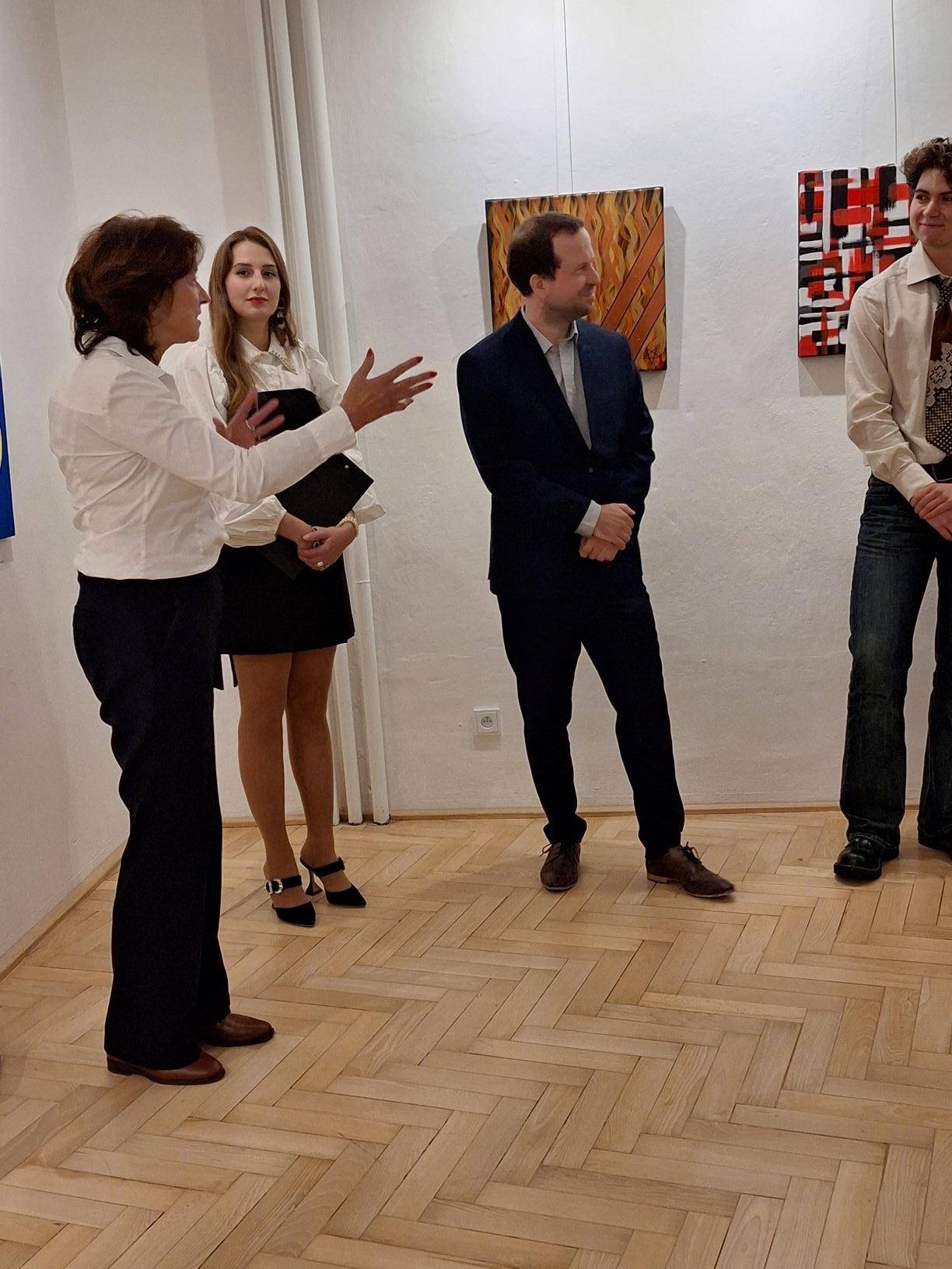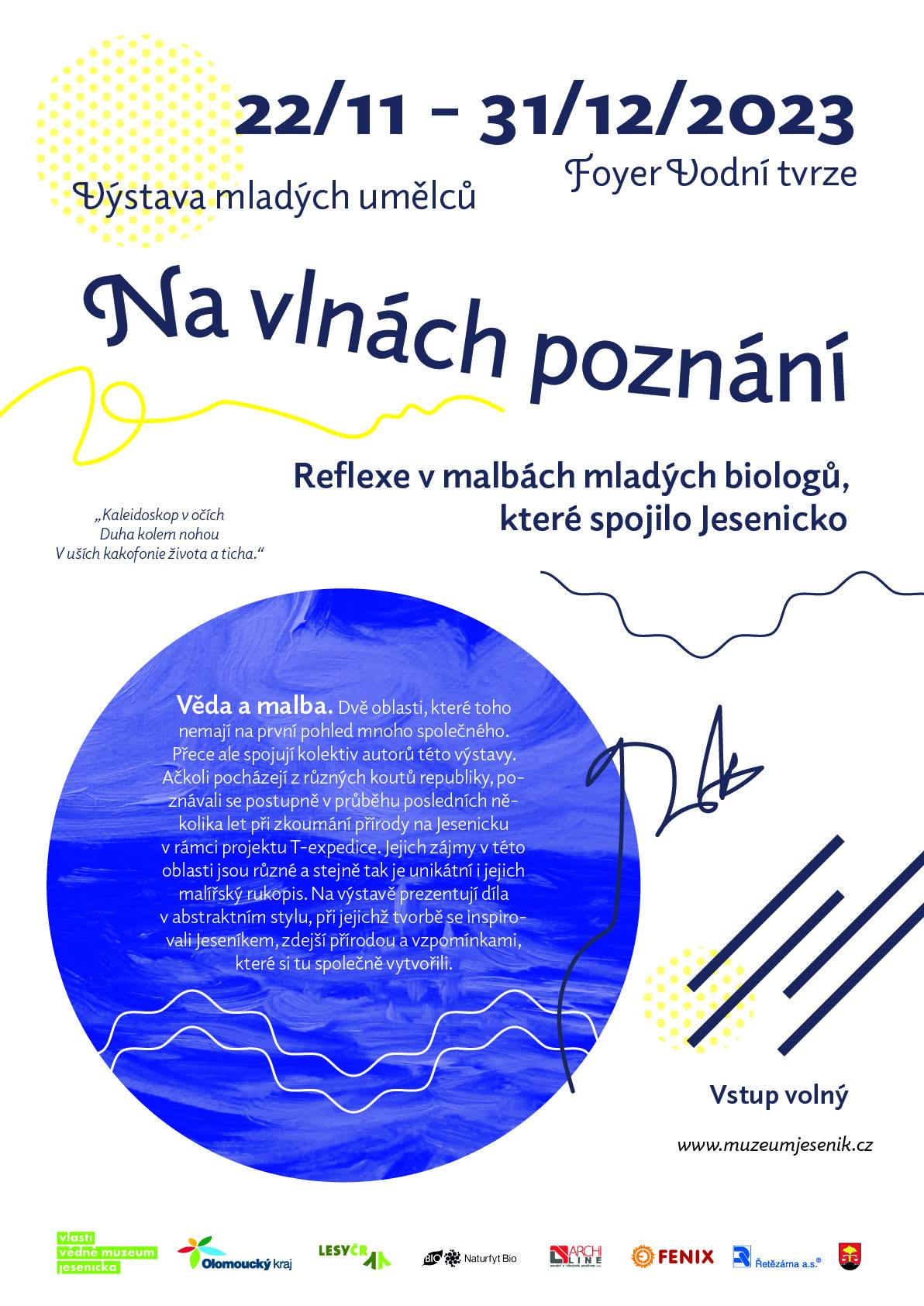 Výstavy abstraktních obrazů zahájeny21.11.2023 Dne 21. listopadu byly v podvečerních hodinách ve Vodní tvrzi společnou vernisáží zahájeny dvě výstavy abstraktního umění. Výtvarnice Janette de la Colette představila výstavu s názvem Čas magického kraje, jejíž součástí je kromě dalších autorčiných děl také série Jesenicko na abstraktní malbě. Šest obrazů této série navozuje atmosféru smělých i tragických jesenických příběhů či přírody horského regionu. Výstava Na vlnách poznání, která tvoří jakési entrée v předsálí hlavní výstavy, byla představena mladými biology, studenty, kteří se kromě exaktní vědy věnují také uměleckému řemeslu, rovněž abstraktnímu. Na vernisáži přivítal hosty ředitel muzea Pavel Rušar společně se starostkou města Jeseníku Zdeňkou Blišťanovou. Oba uvítali neobvyklé téma, zejména pokus o odraz krajiny a kulturní identity v malbě. Zatímco Pavel Rušar zproblematizoval možnosti abstraktního umění ve smyslu zrcadlení historie a přírody, Zdeňka Blišťanová se zaměřila na zapojení mladých umělců v podobě výstavky v předsálí. Výtvarnice Janette de la Colette vyzvala přítomné, aby se soustředili na emoce a intuici a aby potlačili touhu po rozumovém nahlédnutí obrazů. Mladí umělci zase prezentovali význam abstrakce a umění pro jejich život. Hudebně vernisáž doprovodila Veronika Kroupová ze Základní umělecké školy Jeseník, zazněly tóny saxofonu a flétny. Výstava mladých umělců je zpřístupněna ve Foyer Vodní tvrze, výstava umělkyně Janette de la Collete zase v Galerii téže budovy. Druhá zmíněná výstava je prodejní. | |