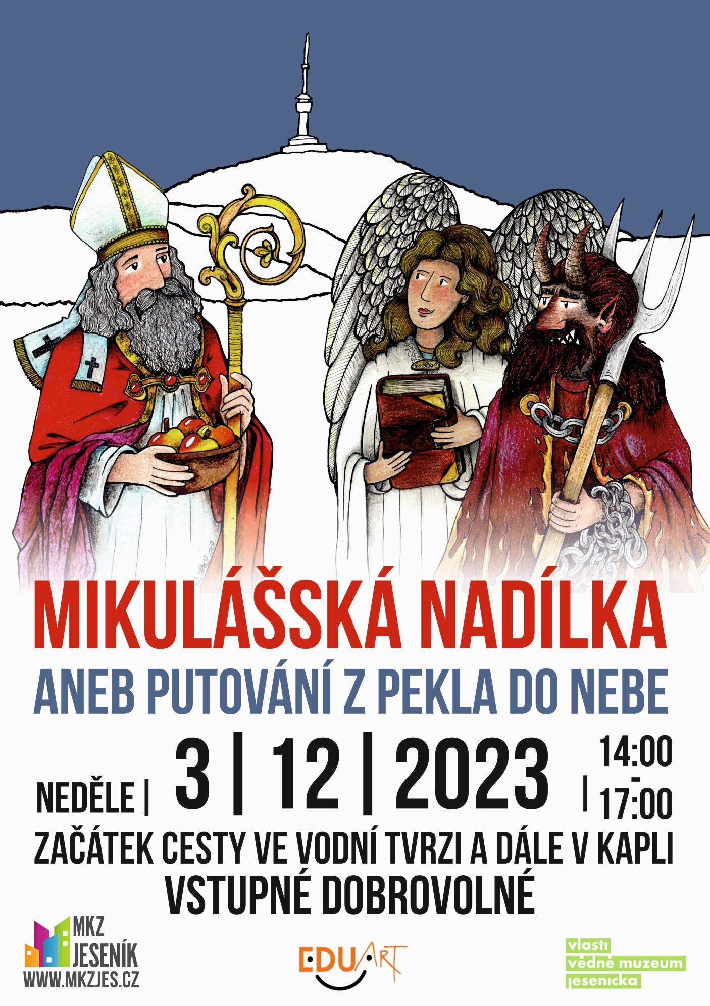 Mikulášská nadílka aneb putování z pekla do nebe začínala ve sklepní expozici muzea03.12.2023 Na malé návštěvníky čekali o první adventní neděli 3. prosince ve sklepení Vodní tvrze čerti, kteří byli sice hodní, avšak projekce a tajuplné nasvícení s kouřovými efekty dodaly expozici čarodějnických procesů opravdu pekelný charakter. V Rytířském sále si mohli s edukátorkami MKZ namalovat na černý papír čerta nebo společně vytvořit obraz toho, jak vypadá peklo. Při východu pak děti dostaly od anděla poutnický pas a vydaly se na další stanoviště do Kaple. Tam na ně čekala andělská kancelář, kde se účastníci vyfotili a nalepili si svoji fotku do pasu. Navštívit mohli i andělské dílničky a pak již hurá za Mikulášem. Celá akce proběhla ve spolupráci MKZ Jeseník, Spolku EduArt a Vlastivědného muzea Jesenicka, p. o. | |