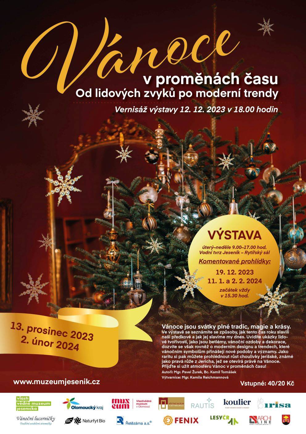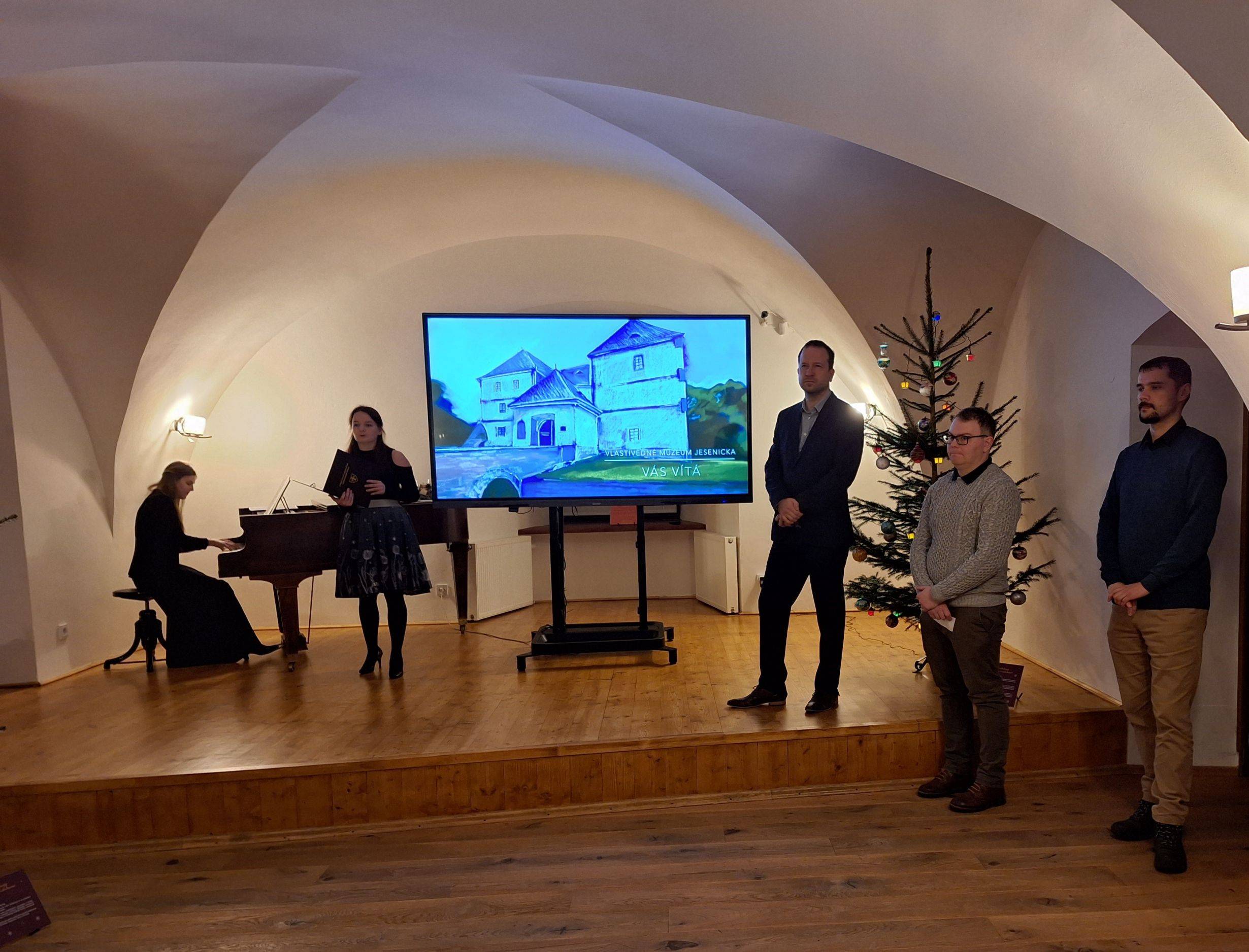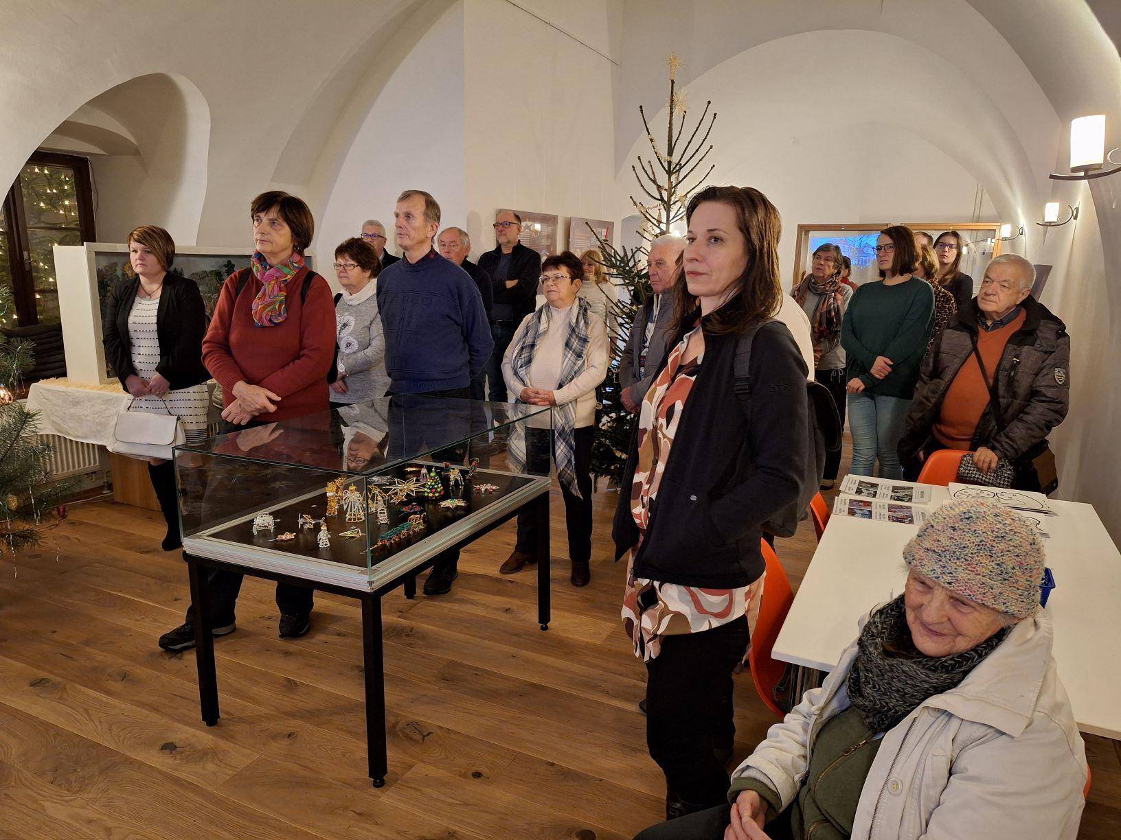 Vánoční výstava ve Vodní tvrzi zahájena12.12.2023 V podvečer 12. prosince proběhla v Rytířském sále Vodní tvrze slavnostní vernisáž výstavy „Vánoce v proměnách času. Od lidových zvyků po moderní trendy“, kterou připravili pracovníci Vlastivědného muzea Jesenicka. Po úvodním proslovu ředitele VMJ Pavla Rušara se návštěvníci od kurátorů Pavla Žurka a Kamila Tomáška dozvěděli zajímavosti o historii a současnosti vánočních tradic, zvyků, symbolů a nechybělo ani zajímavé povídání o současném designu vánočních ozdob. V prostorách výstavy měli návštěvníci rovněž možnost zhlédnout betlémy, vánoční ozdoby a dekorace. Raritou je pak choulivka jerišská, známá jako růže z Jericha, kterou je možné spatřit ve schouleném i rozevřeném stavu včetně semenáčů. Vernisáž hudebně doprovodila hrou na piano Natálie Husťáková a zpěvem vánočních písní v češtině, francouzštině a latině Eva Frenclová. V rámci výstavy budou organizovány tři komentované prohlídky, a to 19. prosince, 11. ledna a 2. února vždy od 15.30 hod. Výstavu bude možné navštívit do 2. února 2024. | |