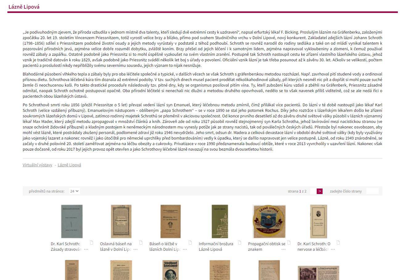 Virtuální výstava o lázních Dolní Lipová23.02.2024 Na platformě eSbírky je dostupná virtuální výstava věnující se dějinám Schrothových léčebných lázní v Dolní Lipové. Jesenicko se stalo místem působení pozoruhodného množství vlivných přírodních léčitelů, které vyústilo ve vznik řady proslulých lázeňských zařízení, z nichž mnohé poskytují pacientům své služby dodnes. Vedle vyhlášených Priessnitzových lázní na Gräfenberku zahájil v první polovině 19. století svou činnost z iniciativy Johanna Schrotha (1798–1856) také léčebný ústav v Dolní Lipové (dříve Nieder Lindewiese). Virtuální výstava Vlastivědného muzea Jesenicka s názvem „Lázně Lipová“ seznámí badatele s unikátními dokumenty spojenými s takřka dvousetletou historií dolnolipovských lázní. Na rozdíl od klasicky pojatých výstav umožňuje detailní studium dříve nepřístupných archiválií či obrazových materiálů v libovolný denní čas bez ohledu na provozní dobu badatelského místa. Začtěte se proto do korespondence Rochuse Schrotha nebo do četných dobových brožur o Schrothově léčebné metodě, pohlédněte do tváří důležitých osobností spjatých s provozem tohoto lázeňského ústavu nebo se jen kochejte měnící se podobou lázeňského areálu v proměnách času. Výstava bude po časově neomezenou dobu dostupná na platformě eSbírky. | |