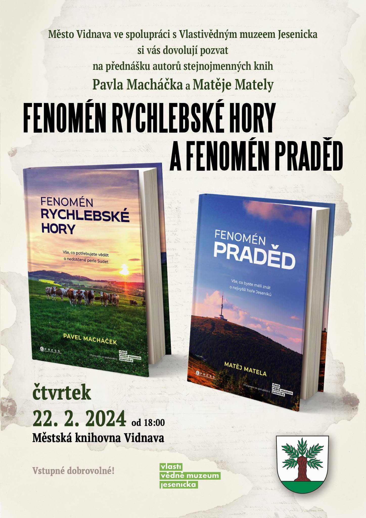 Srdečná atmosféra ve Vidnavě22.02.2024 Ve čtvrtek 22. února 2024 se ve Vidnavě uskutečnila beseda s autory knih Fenomén Praděd Matějem Matelou a Fenomén Rychlebské hory Pavlem Macháčkem. Příjemně vyhřátá místnost místní knihovny dala zapomenout na studený déšť venku a v průběhu večera se příchozí dozvěděli řadu zajímavostí nejen o nejvyšším vrcholu Jeseníků, ale také o pohoří, které je ještě dnes pro mnohé velkou neznámou. Autoři zavzpomínali na perličky z přípravy obou publikací i na to, jak se museli popasovat s požadavky vydavatele, jimž bylo nakladatelství Albatros Media. Na závěr přednášky proběhla živá komunikace s posluchači a autogramiáda. | |