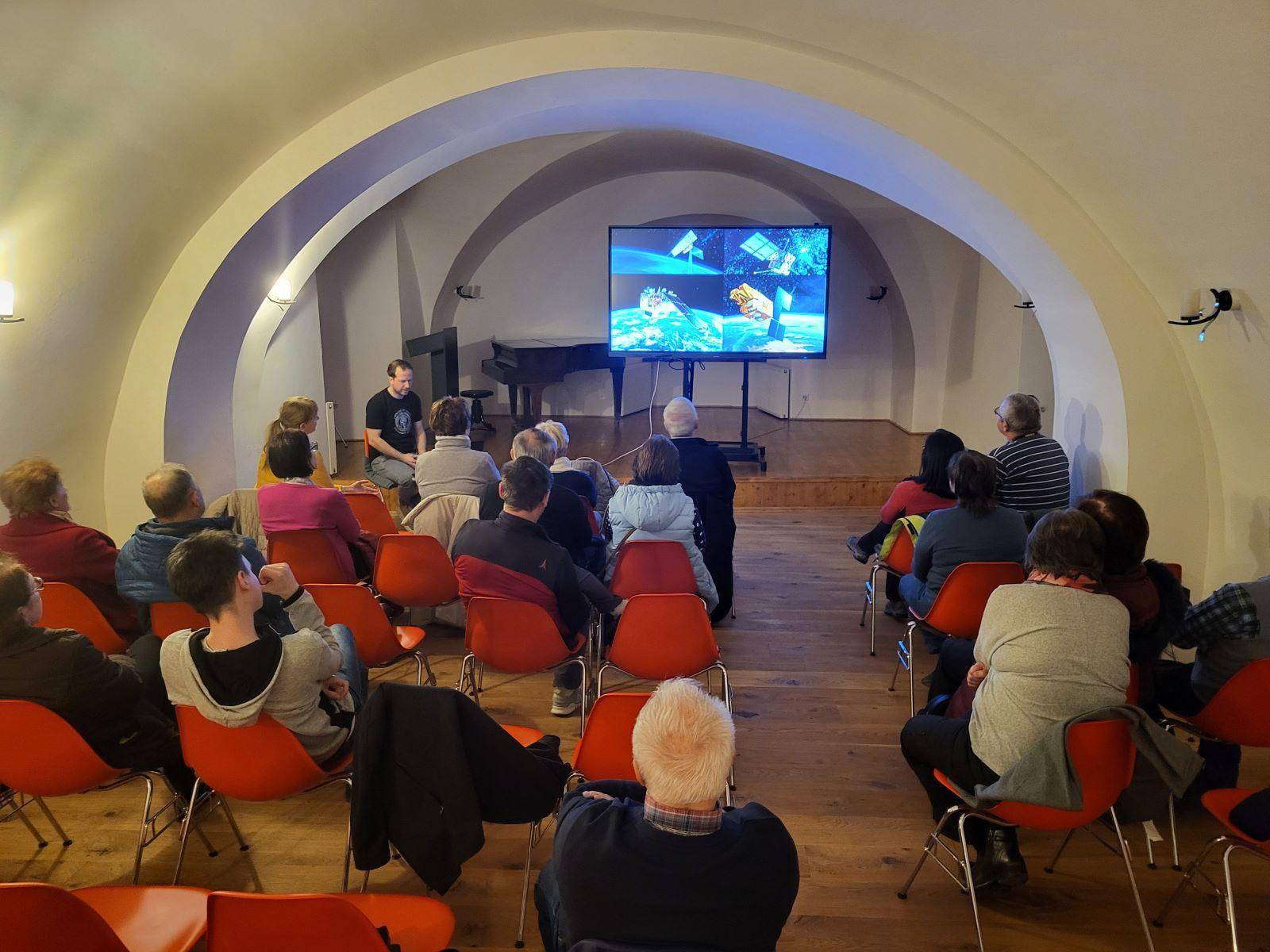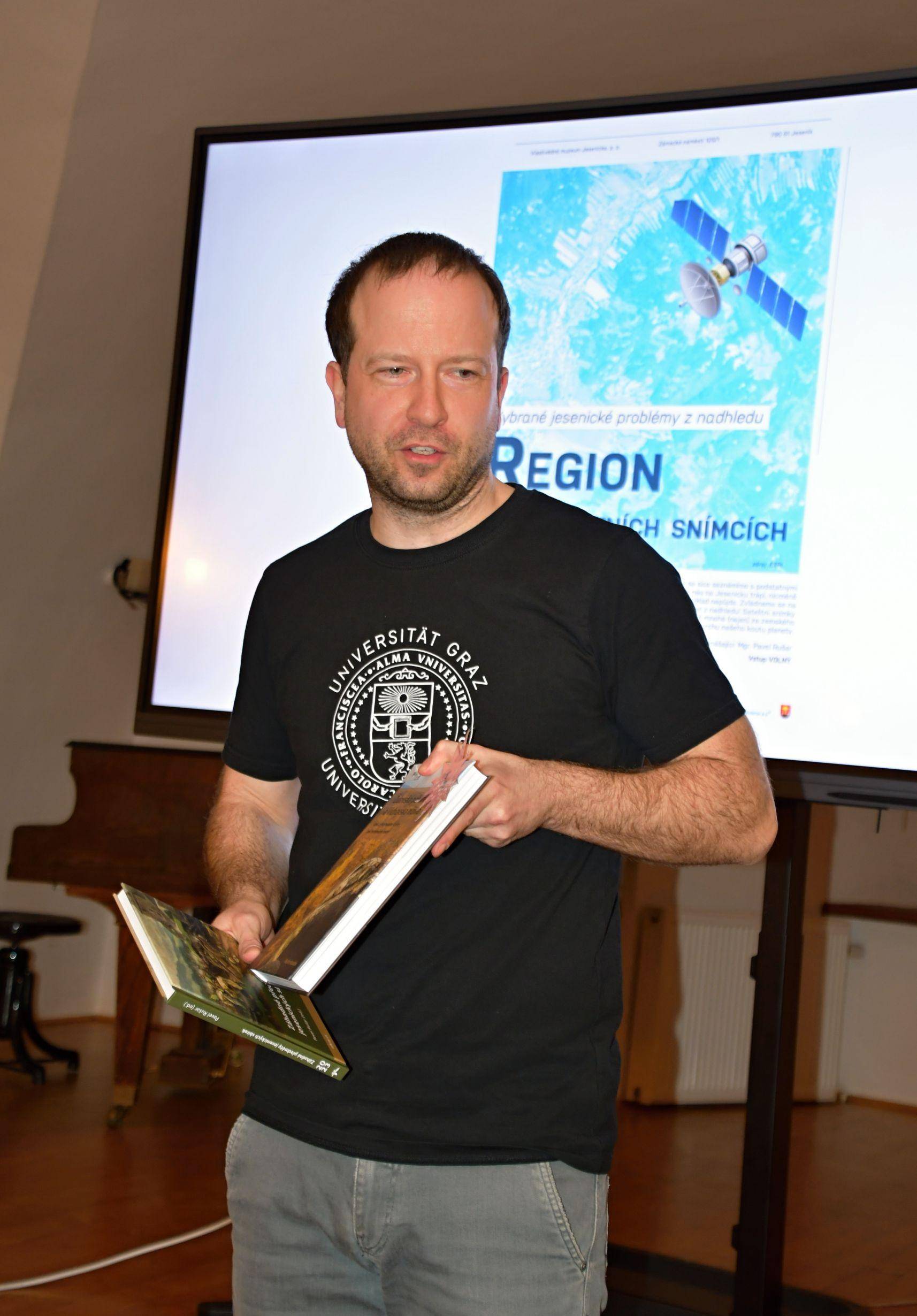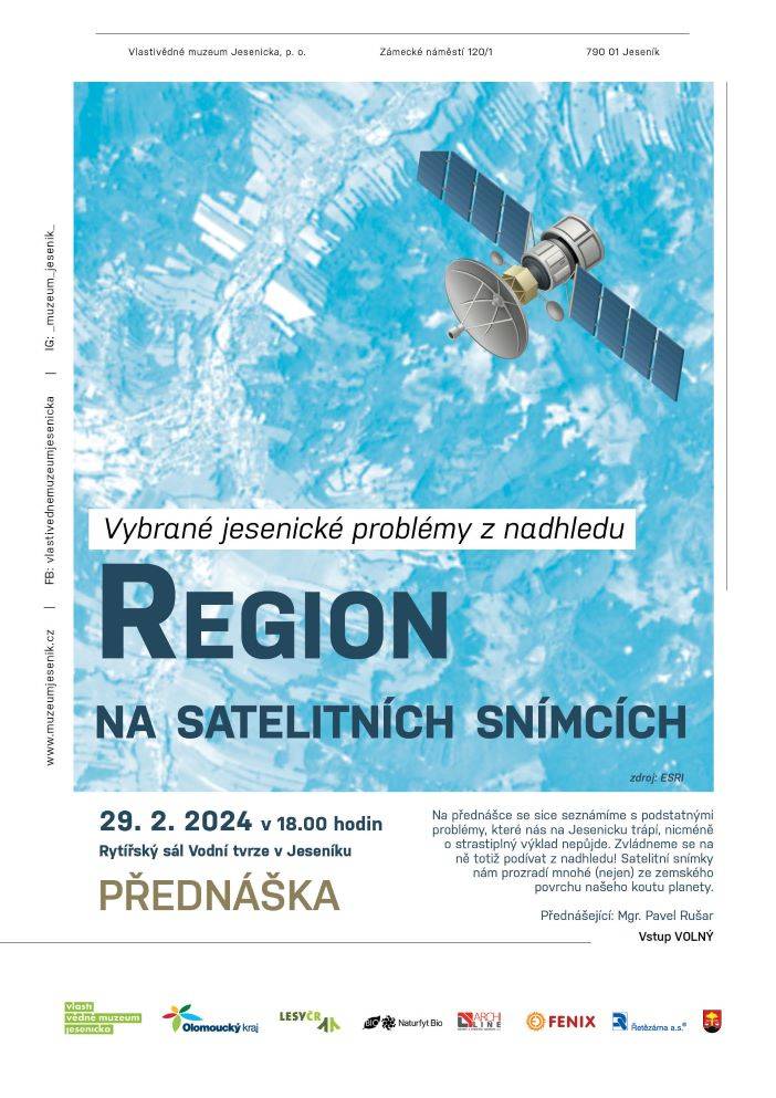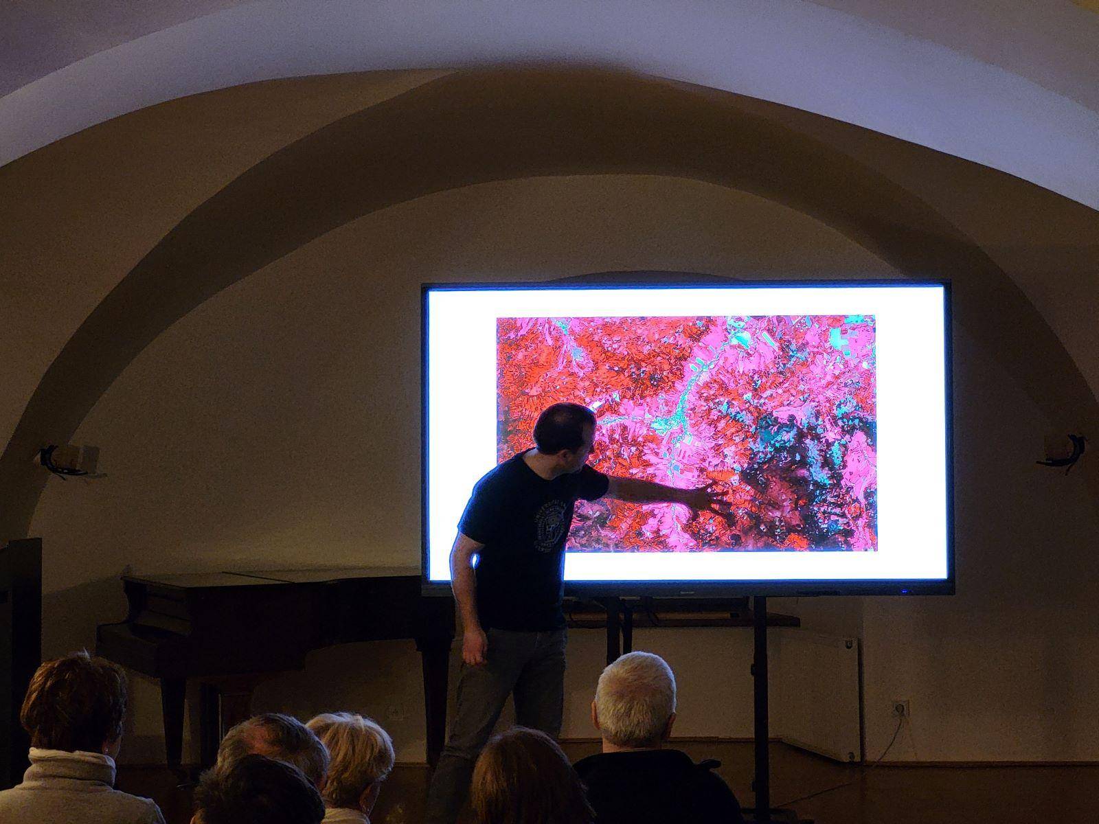 Přednáška na téma „Vybrané jesenické problémy z nadhledu – Region na satelitních snímcích“29.02.2024 Geografickou a trochu geoinformatickou přednášku představil v Rytířském sále při neobvyklém datu 29. února Mgr. Pavel Rušar. V její první polovině zazněly informace z historie lidských pokusů nahlédnout na naši planetu z vesmíru, zmíněny byly časnější fotografie kosmonautů i speciální snímky senzorů z pokročilých satelitů. V její druhé polovině se pak přednášející zaměřil na problémy Jesenicka související zejména se suchem, těžbou dříví a kůrovcovou kalamitou z posledních let, letmo byly zmíněny problémy eroze půdy, meteorologických extrémů a šíření invazních rostlin, kterým bude věnováno budoucí pokračování přednášky. Trochu neobvyklý příspěvek k muzejnímu regionálnímu bádání měl však i trochu jiný dosah, neboť nejrůznější spektrální syntézy složené z široké škály barev nabídly návštěvníkovi kromě exaktních informací, které nesly, také takřka umělecký zážitek. | |