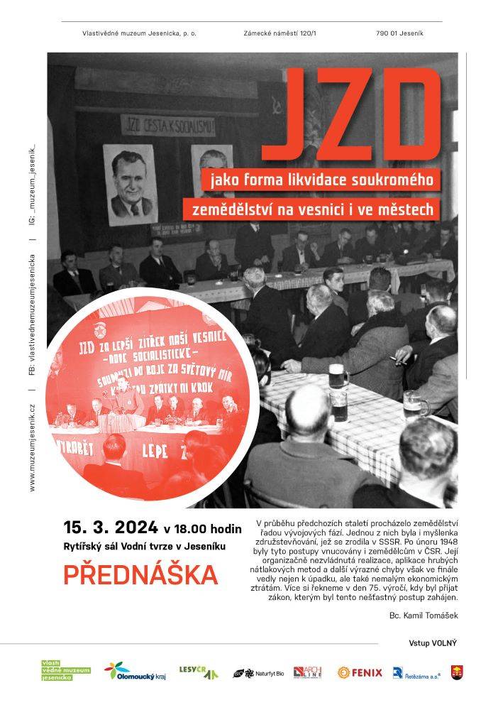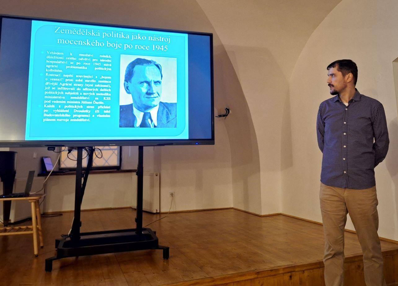 Přednáška přiblížila vznik jednotných zemědělských družstev15.03.2024 Dne 15. března 2024 se v Rytířském sále Vodní tvrze uskutečnila přednáška o jednotných zemědělských družstvech, která v době socialistické vlády přestavovala primární organizační jednotku československého zemědělství. Návštěvníci byli přednášejícím, Bc. Kamilem Tomáškem, seznámeni s vývojem zemědělské výroby v širším kontextu a se stavem agrárního hospodářství v českých zemích v posledním období existence Rakouska-Uherska a za první republiky, kdy se družstevnictví, avšak v naprosto odlišné podobě, u nás objevilo poprvé a na rozdíl od pozdější formy se těšilo i značné oblibě. Následně byla představena problematika vývoje zemědělství po roce 1945 a zvláště po únoru 1948, kdy již měla v rukou plně moc komunistická strana, provádějící od konce roku 1948 plánovanou restrukturalizaci zemědělské výroby po vzoru Sovětského svazu do formy velkovýrobních zemědělských družstev. Byly popsány důvody a důsledky první etapy „socializace vesnice“, jež skončila kvůli mnohým aspektům, včetně zásadního odporu velké části samotných hospodářů, těžkým neúspěchem. Finální částí přednášky se pak stalo rozkrytí poslední fáze vývoje, jež ve výsledku dovedla koncem 50. a v 60. letech majoritní část doposud soukromě hospodařících zemědělců do područí jednotných zemědělských družstev, kde zůstaly „svázáni“ až do Sametové revoluce v listopadu 1989. | |