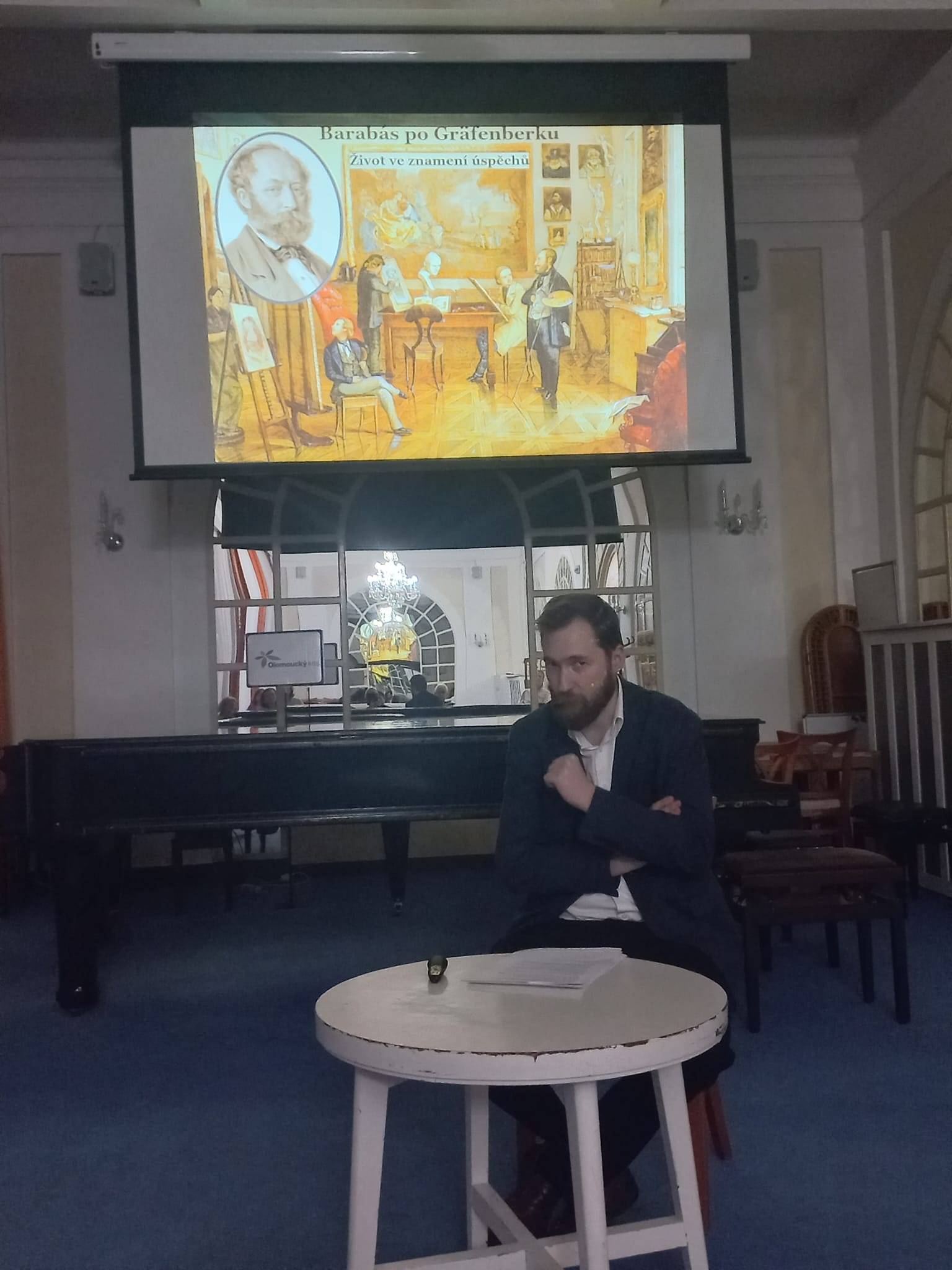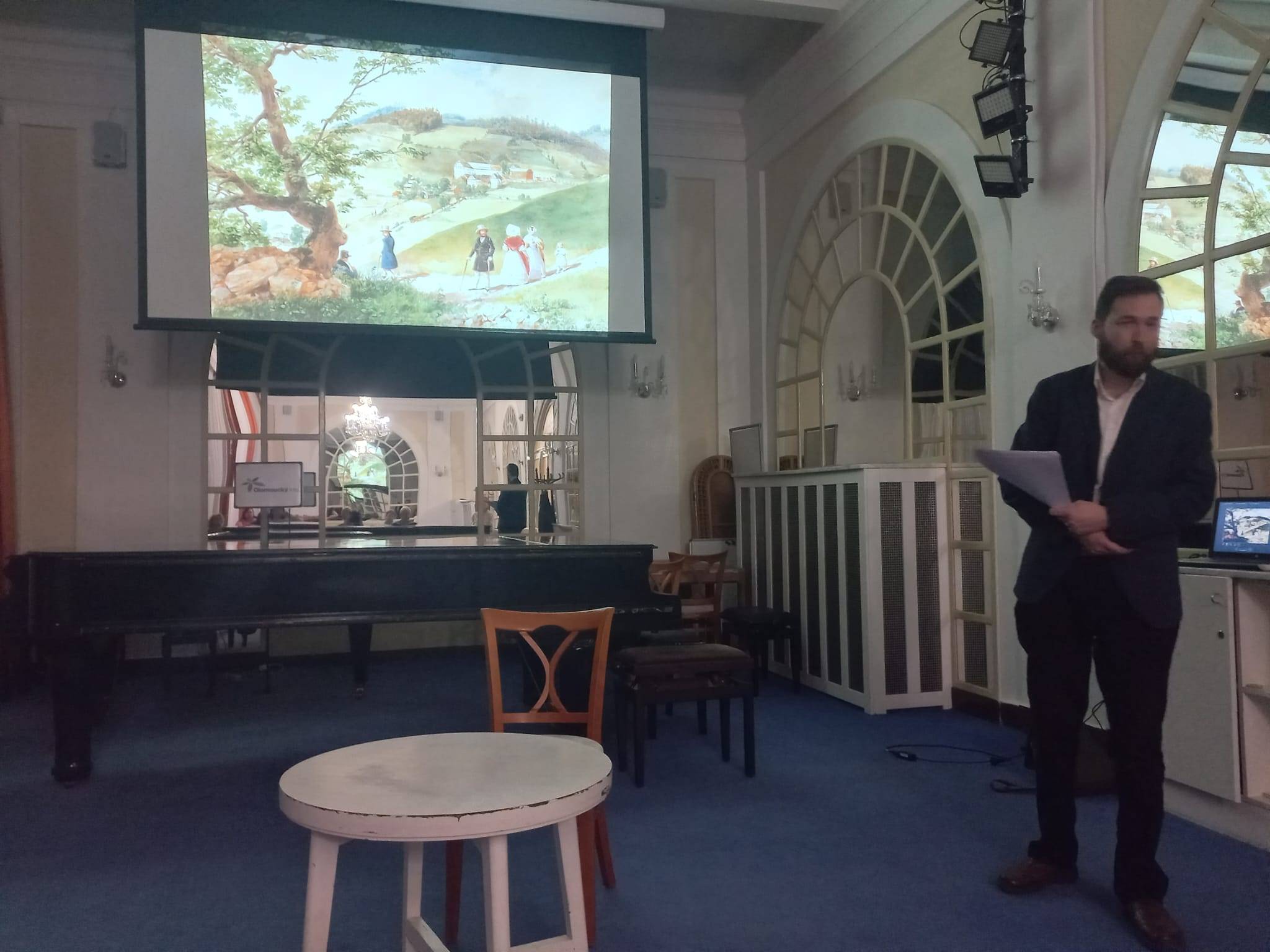 Akvarely jesenických lázní z dílny nestora maďarského malířství21.03.2024 Dne 21. března 2024 se ve večerních hodinách uskutečnila v Zrcadlovém sále Priessnitzova sanatoria přednáška etnografa VMJ Matěje Mately, jemuž se předchozího roku podařil významný objev v oblasti bádání nad historií místních lázní – díky výstavy Maďarského národního muzea si povšiml tří akvarelů Gräfenberku vytvořených Miklósem Barabásem, který zde roku 1839 několik měsíců pobýval. Přednášející nejprve pojednal o okolnostech objevu, posléze přítomným přiblížil osobu a tvorbu zakladatele moderního maďarského malířství, který během své dlouhé kariéry zpodobnil nejvýznačnější osobnosti uherských dějin. Vrcholem přednášky se pak stala první veřejná (minimálně na Jesenicku) projekce tří akvarelů, na nichž Barabás zachytil unikátní podobu lázní za Priessnitzova života a které si můžete prohlédnout zde. Dané téma M. Matela podrobně rozvedl ve studii, která bude součástí sborníku Jesenicko 2024, jehož vydání plánuje VMJ a SOkA Jeseník na letošní květen. | |