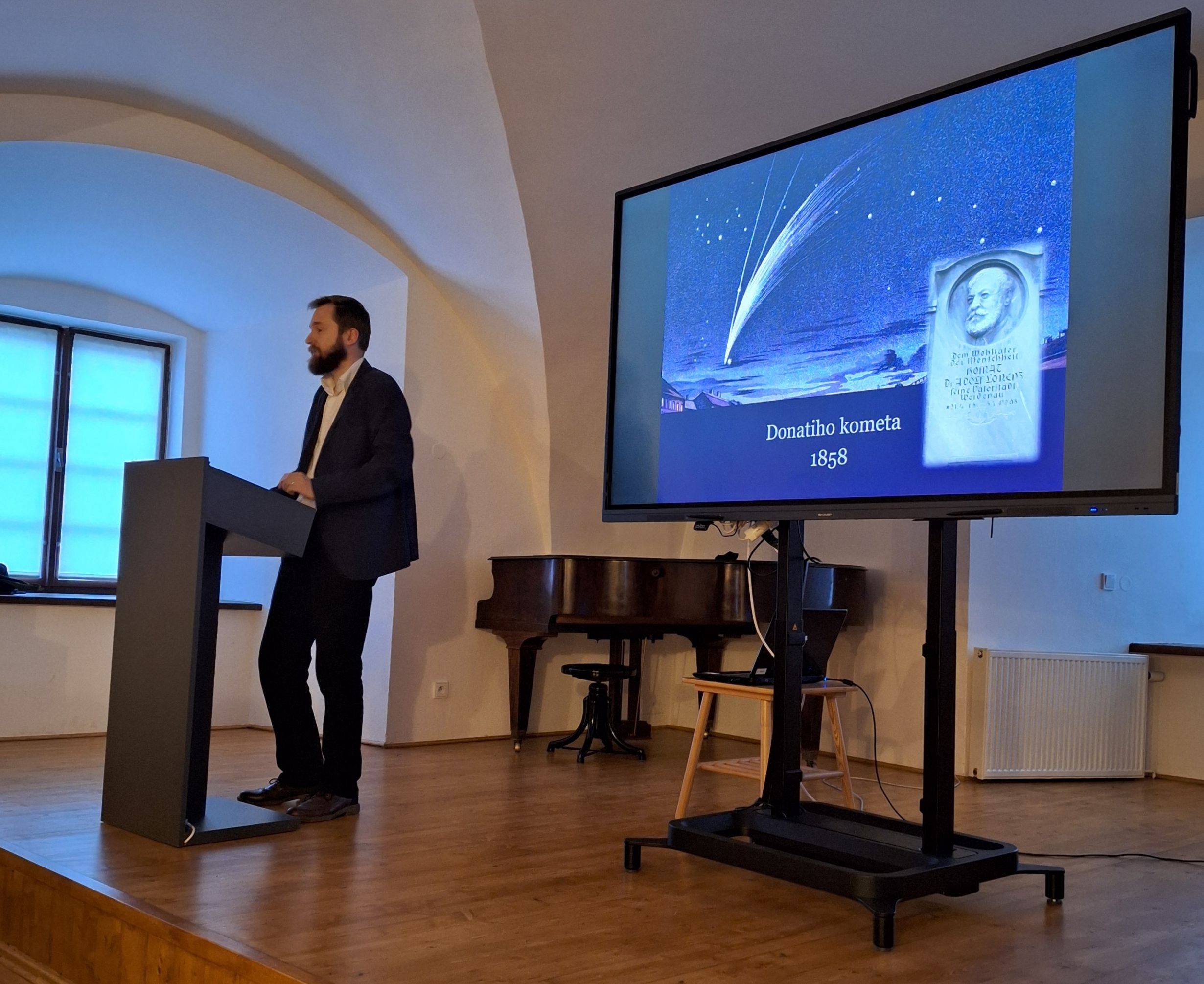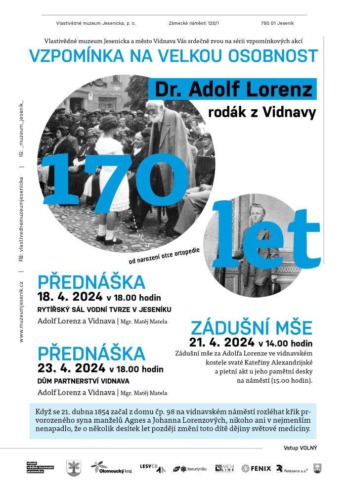 Přednáška přiblížila slavného ortopeda dr. Lorenze coby rodáka z Vidnavy18.04.2024 Dr. Adolf Lorenz patří mezi největší osobnosti moderní světové medicíny, jeho ortopedické metody pomáhají dodnes tisícům potřebných. Zatímco jeho dílo je v odborných kruzích dobře známým fenoménem, málo se ví o jeho kořenech a vztahu k rodnému kraji. Tuto dosud neznámou kapitolu Lorenzova života přiblížil na přednášce 18. dubna etnograf VMJ Matěj Matela, který se životem, dílem a odkazem vidnavského ortopeda dlouhodobě zabývá a na rok 2026 o něm plánuje vydat menší knihu. Účastníky seznámil s nejranějšími Lorenzovými vzpomínkami, jeho složitým vztahem s matkou i některými osobnostmi, které jej v dětství formovaly, k nimž patřil např. restaurátor Josef Bauch. Patřičný prostor byl pak věnován Lorenzovým návratům do rodného města, z nichž ten nejslavnější a poslední se odehrál v srpnu roku 1935, kdy zde ortoped odhalil svou pamětní desku. Přednáška byla první částí vzpomínkových akcí, zorganizovaných VMJ a městem Vidnava u příležitosti 170. výročí Lorenzova narození. V neděli 21. dubna se ve 14.00 hod. ve vidnavském kostele sv. Kateřiny bude konat zádušní mše za Adolfa Lorenze, po níž bude následovat pietní akt u pamětní desky na náměstí. Vše završí přednáška na půdě vidnavského Domu partnerství 23. dubna v 18.00 hod. | |