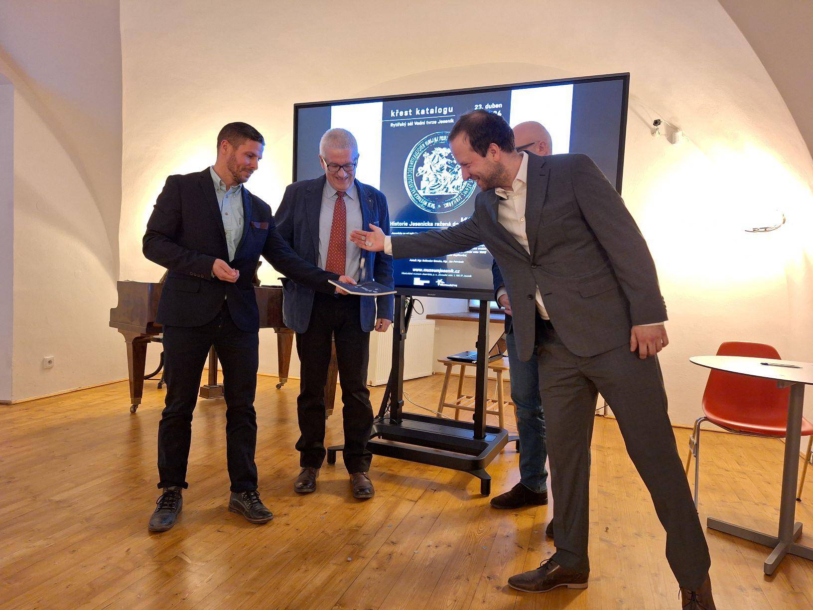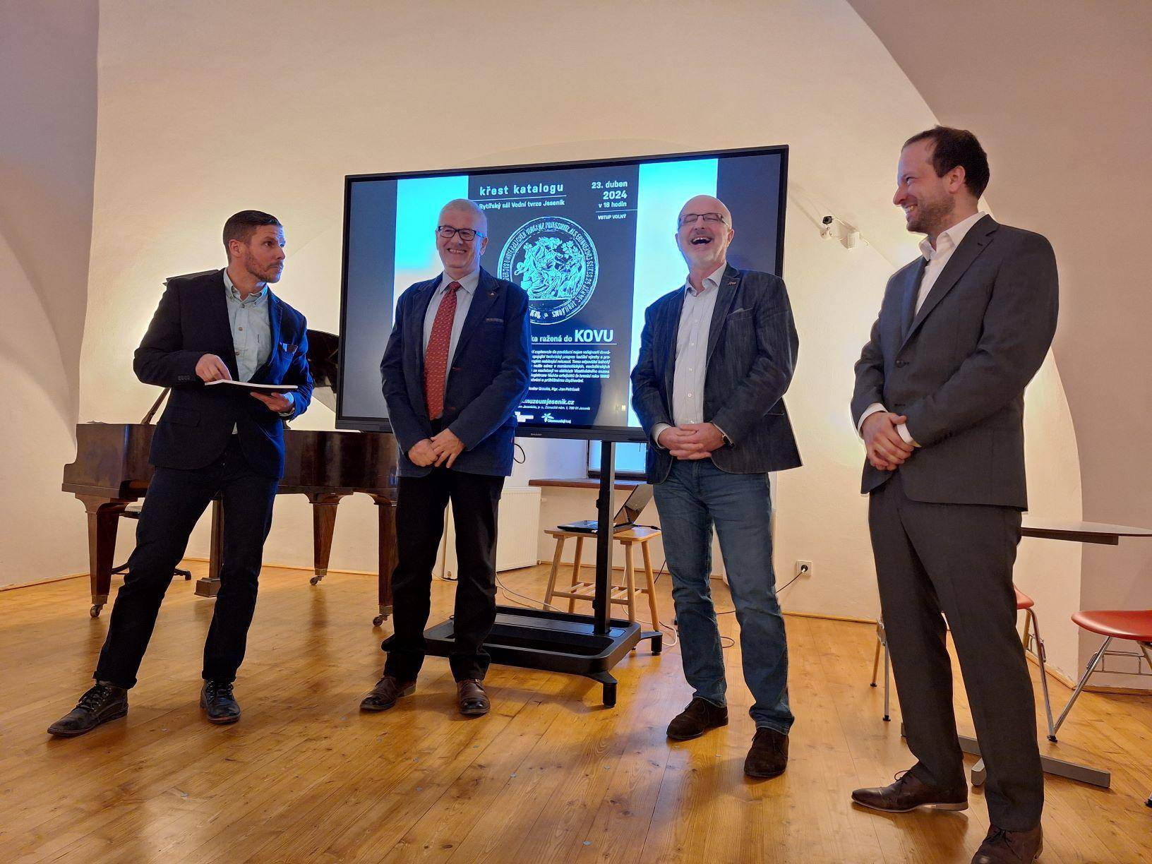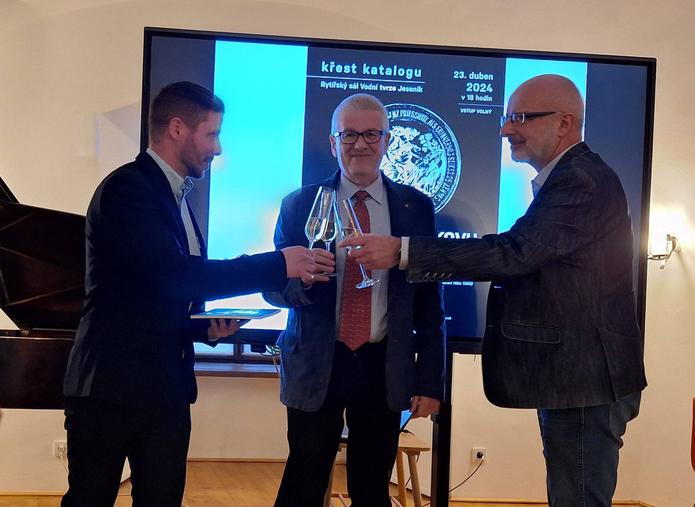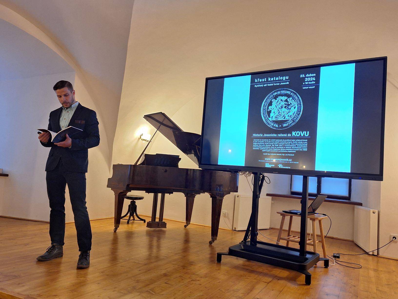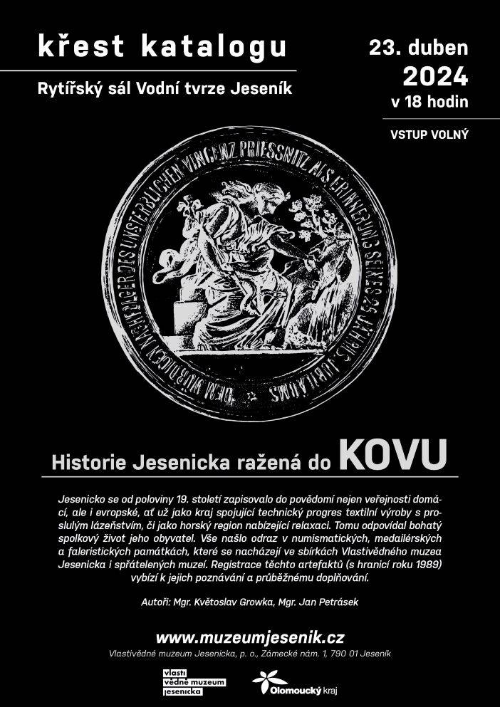 Křest katalogu Historie Jesenicka ražená do kovu23.04.2024 Jako 1. svazek nově založené edice „Katalog Z historických sbírek Jesenicka“ představil 23. dubna 2024 v Rytířském sále Vodní tvrze ředitel Vlastivědného muzea Jesenicka Pavel Rušar společné dílo člena České numismatické společnosti Květoslava Growky a historika VMJ Jana Petráska. Autoři zpracovali dějinný obraz Jesenicka od 19. století do roku 1989 v numismatických, medailérských a faleristických památkách ze sbírky VMJ i spřátelených muzeí v Olomouci, Šumperku a Opavě. Posluchači se dozvěděli i krušné osudy muzejní numismatické sbírky a na několika ukázkách mohli vidět, jak se buduje sbírka nová a jakým způsobem probíhaly práce na katalogu samotném. Křtu se ujal Dr. Petr Holub, člen výboru České numismatické společnosti v Praze a předseda její pobočky ze Šumperka. K překvapení všech byl katalog pokřtěn nikoli obligátním šampaňským, ale s přihlédnutím k jeho tématu zasypán jednohaléřovými mincemi z let 1953–1960. Tóny klavíru v podání Josefíny Jankové přispěly k dobré náladě večera završeného autogramiádou. | |