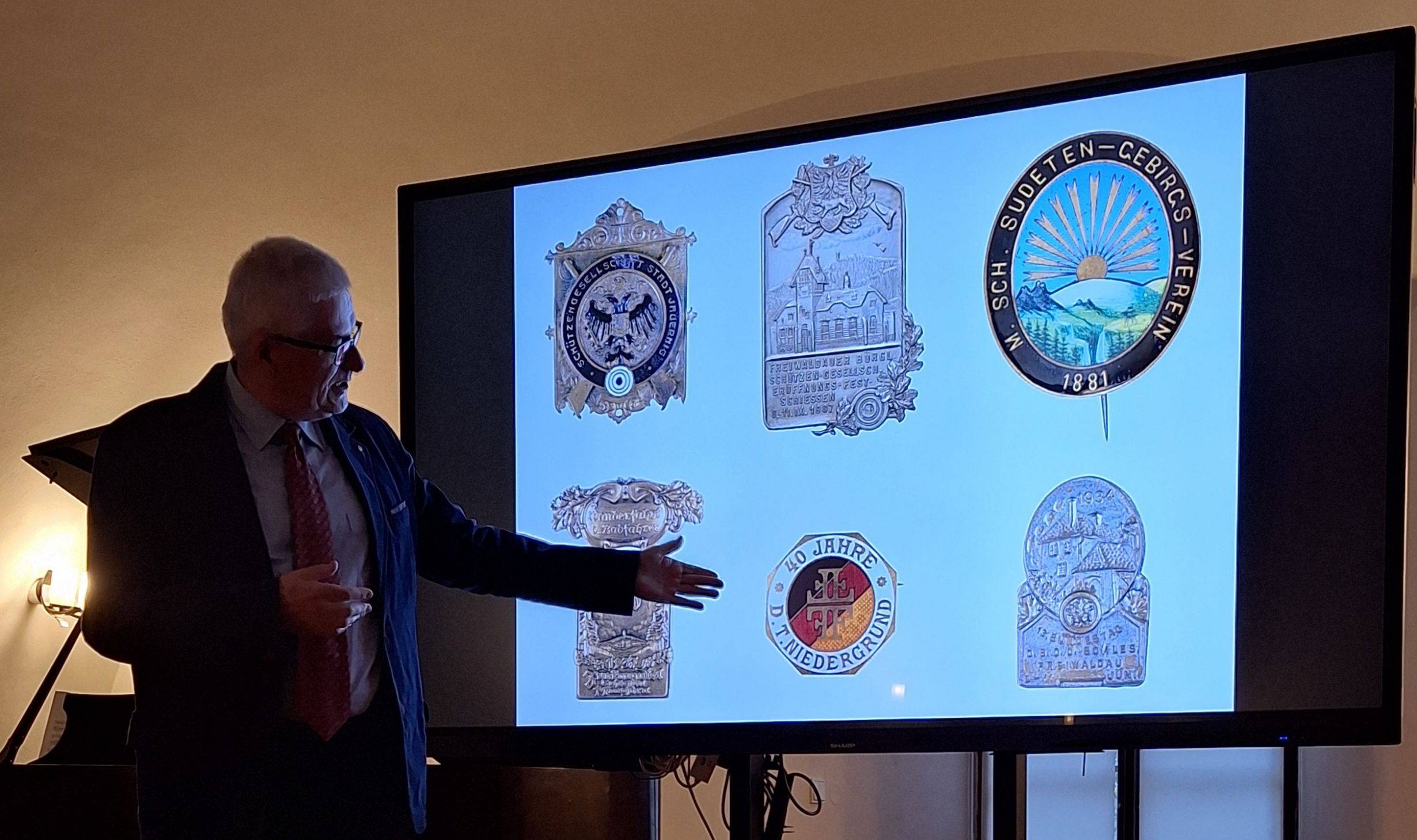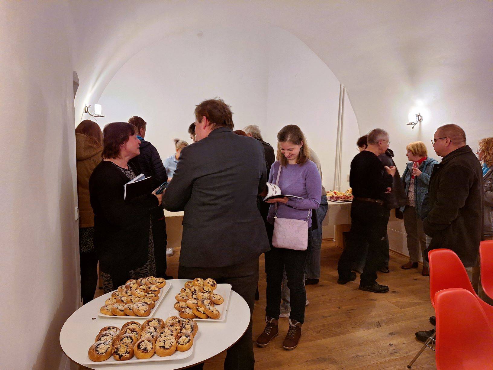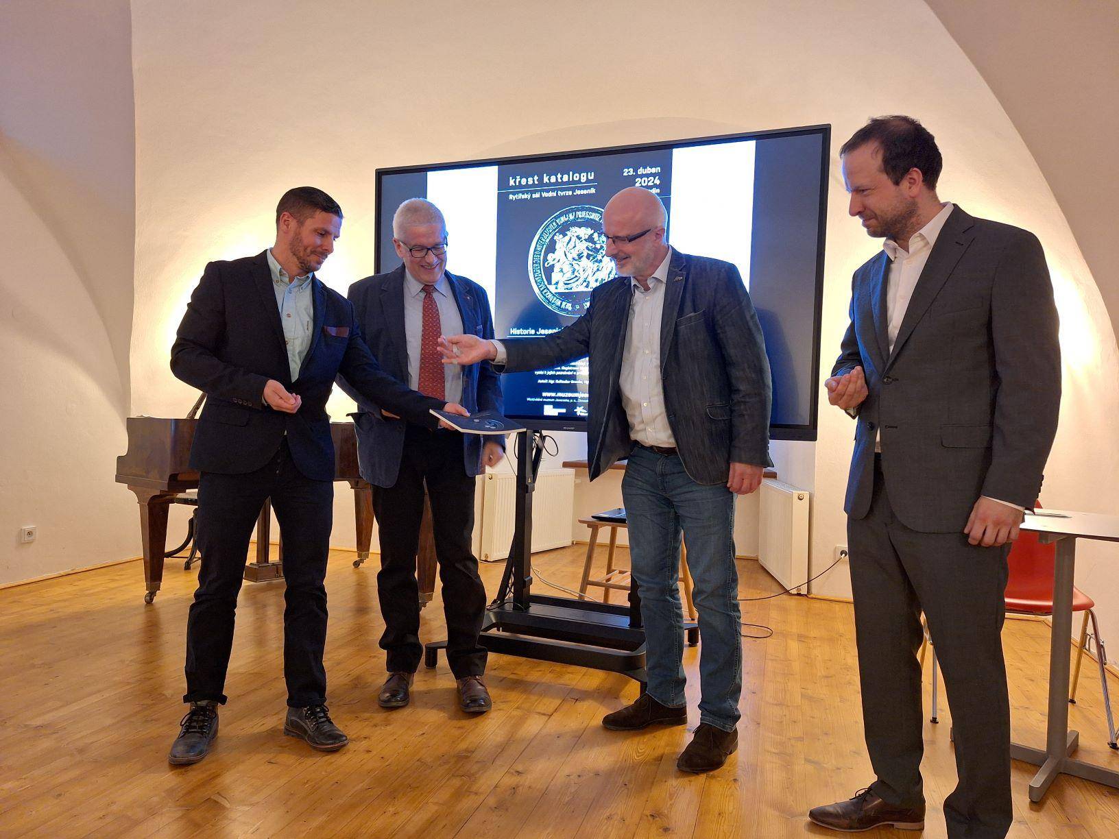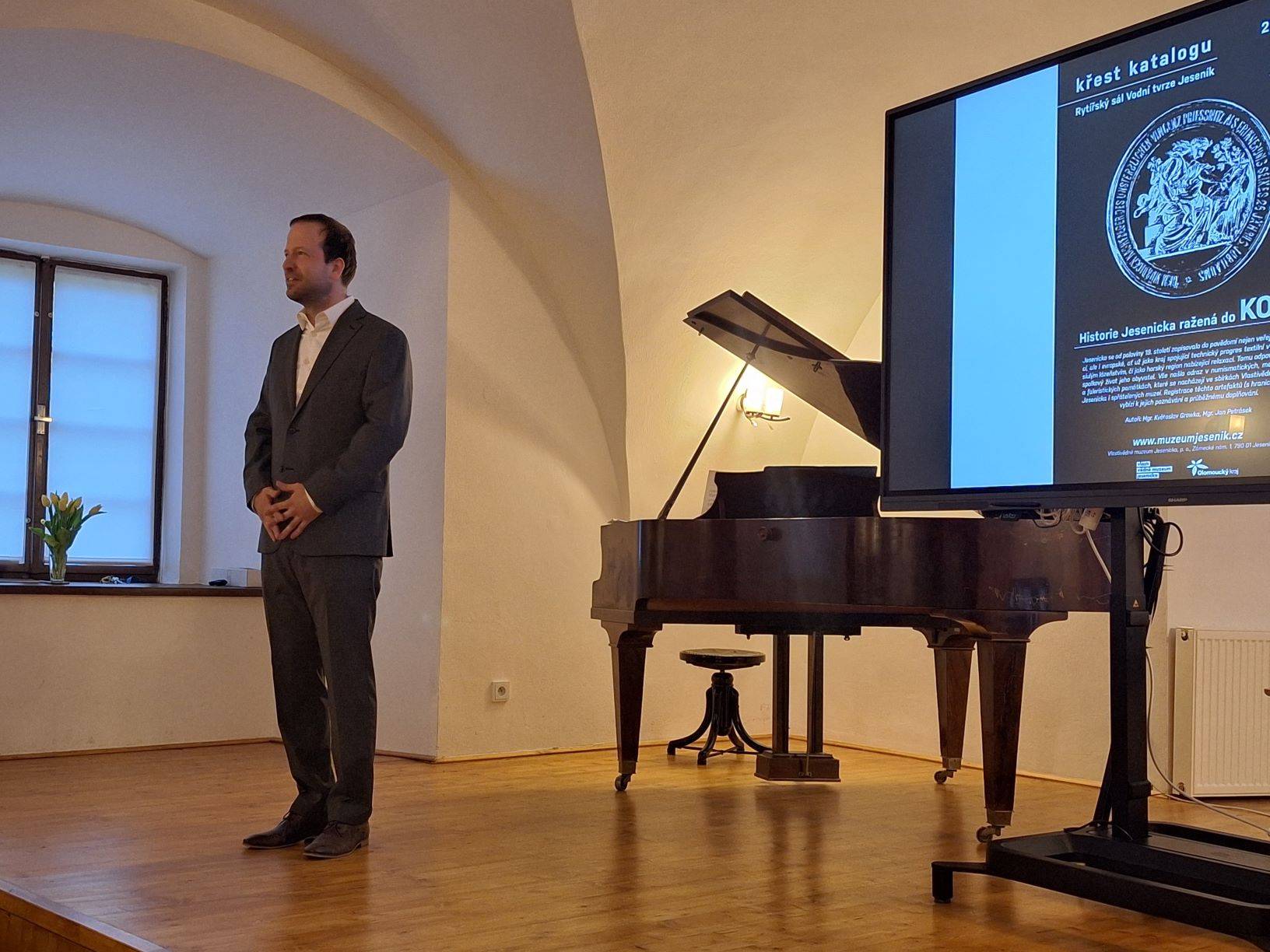 Křest katalogu Historie Jesenicka ražená do kovu23.04.2024 Jako 1. svazek nově založené edice „Katalog Z historických sbírek Jesenicka“ představil 23. dubna 2024 v Rytířském sále Vodní tvrze ředitel Vlastivědného muzea Jesenicka Pavel Rušar společné dílo člena České numismatické společnosti Květoslava Growky a historika VMJ Jana Petráska. Autoři zpracovali dějinný obraz Jesenicka od 19. století do roku 1989 v numismatických, medailérských a faleristických památkách ze sbírky VMJ i spřátelených muzeí v Olomouci, Šumperku a Opavě. Posluchači se dozvěděli i krušné osudy muzejní numismatické sbírky a na několika ukázkách mohli vidět, jak se buduje sbírka nová a jakým způsobem probíhaly práce na katalogu samotném. Křtu se ujal Dr. Petr Holub, člen výboru České numismatické společnosti v Praze a předseda její pobočky ze Šumperka. K překvapení všech byl katalog pokřtěn nikoli obligátním šampaňským, ale s přihlédnutím k jeho tématu zasypán jednohaléřovými mincemi z let 1953–1960. Tóny klavíru v podání Josefíny Jankové přispěly k dobré náladě večera završeného autogramiádou. | |