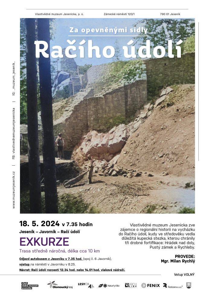 Exkurze za zbytky opevněných sídel v Račím údolí18.05.2024 V sobotní ráno 18. května se u autobusového nádraží v Javorníku sešlo sedm zájemců o vlastivědnou exkurzi. Skupinka pod vedením archeologa VMJ Milana Rychlého zamířila do tajemného Račího údolí, kterým v dobách středověku vedla důležitá kupecká stezka, kterou chránily fortifikace Hrádek nad doly, Pustý zámek a hrad Rychleby. Účastníci se tak dozvěděli o historii těchto objektů, které sice neznáme původním jménem, stejně jako nemáme tušení o jejich staviteli, avšak díky oborům jako kasteologie a archeologie se nám několik zajímavých střípků z minulosti přece jen objevit podařilo. | |