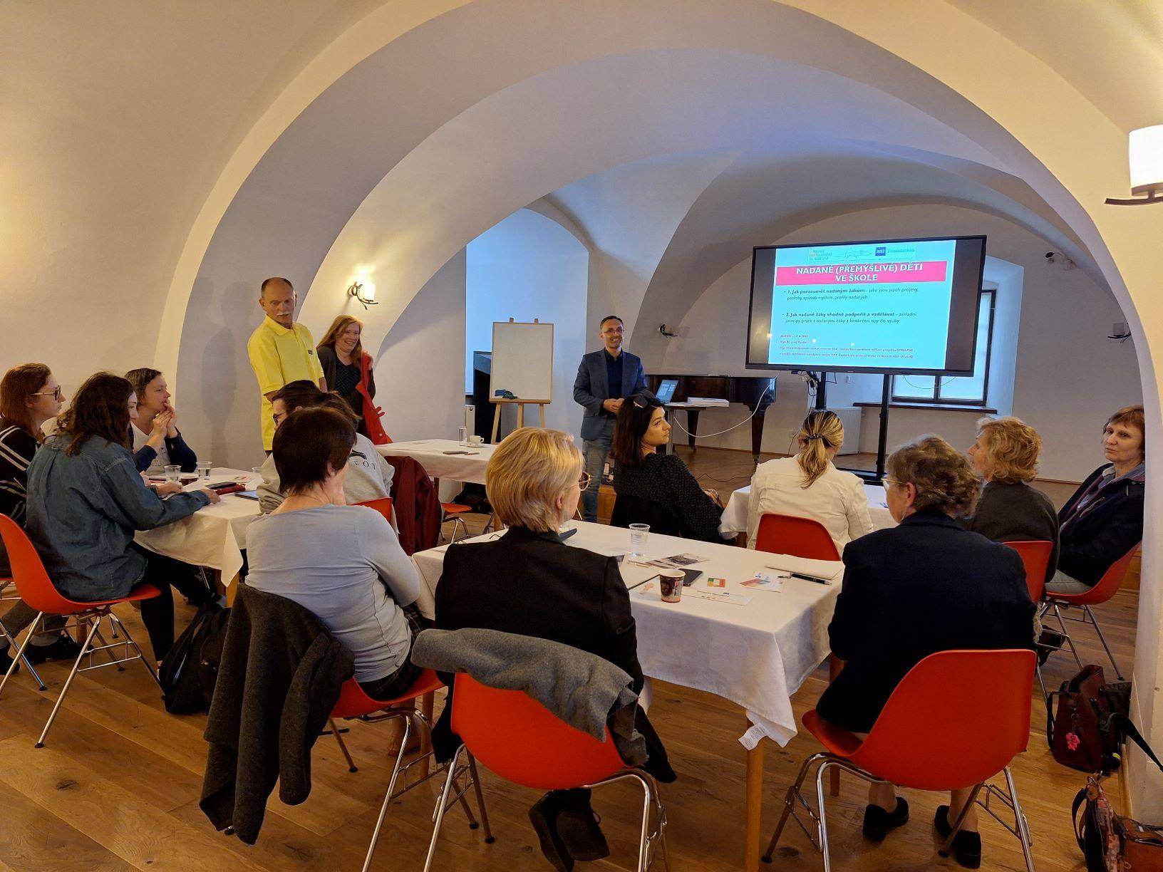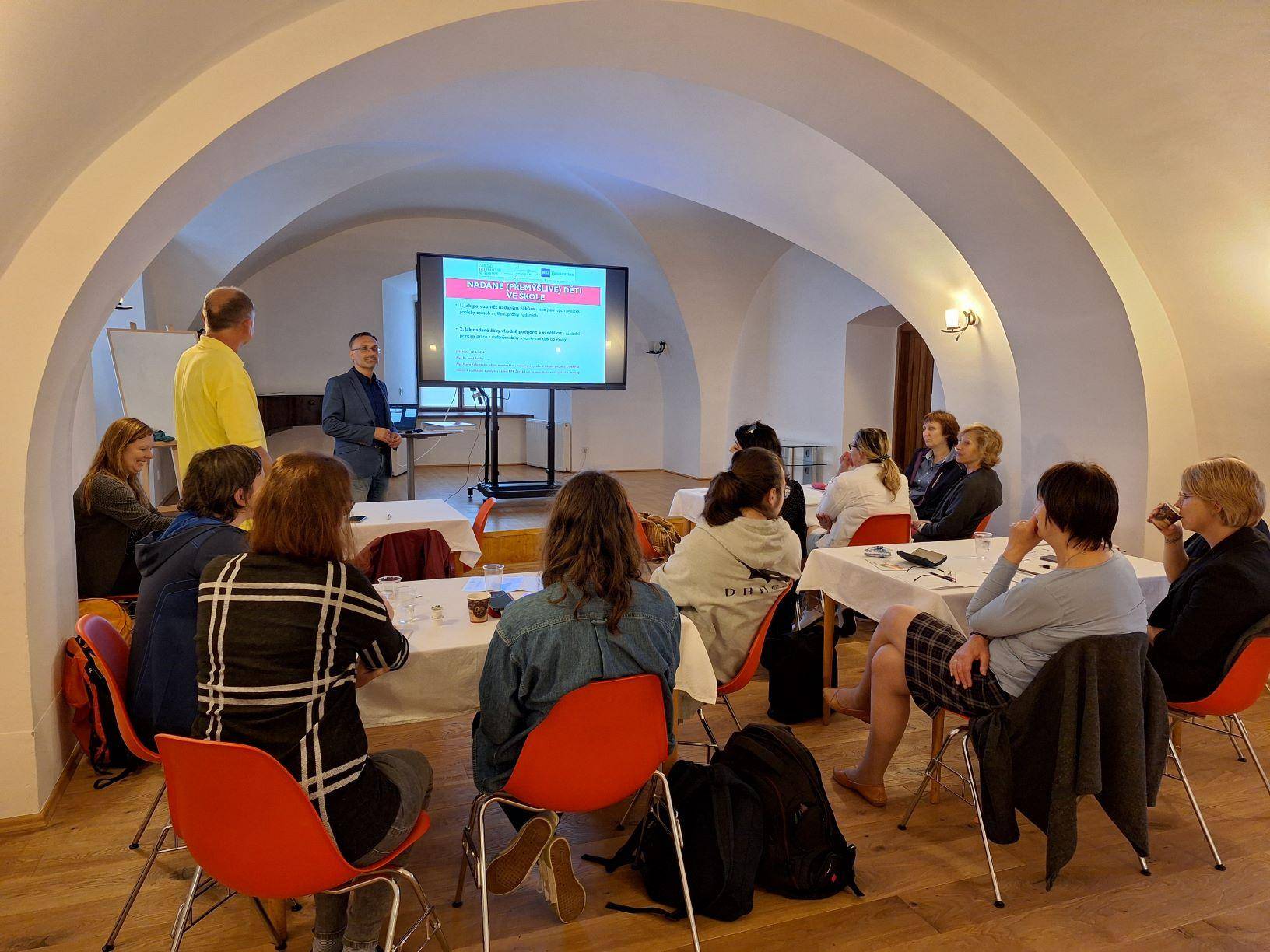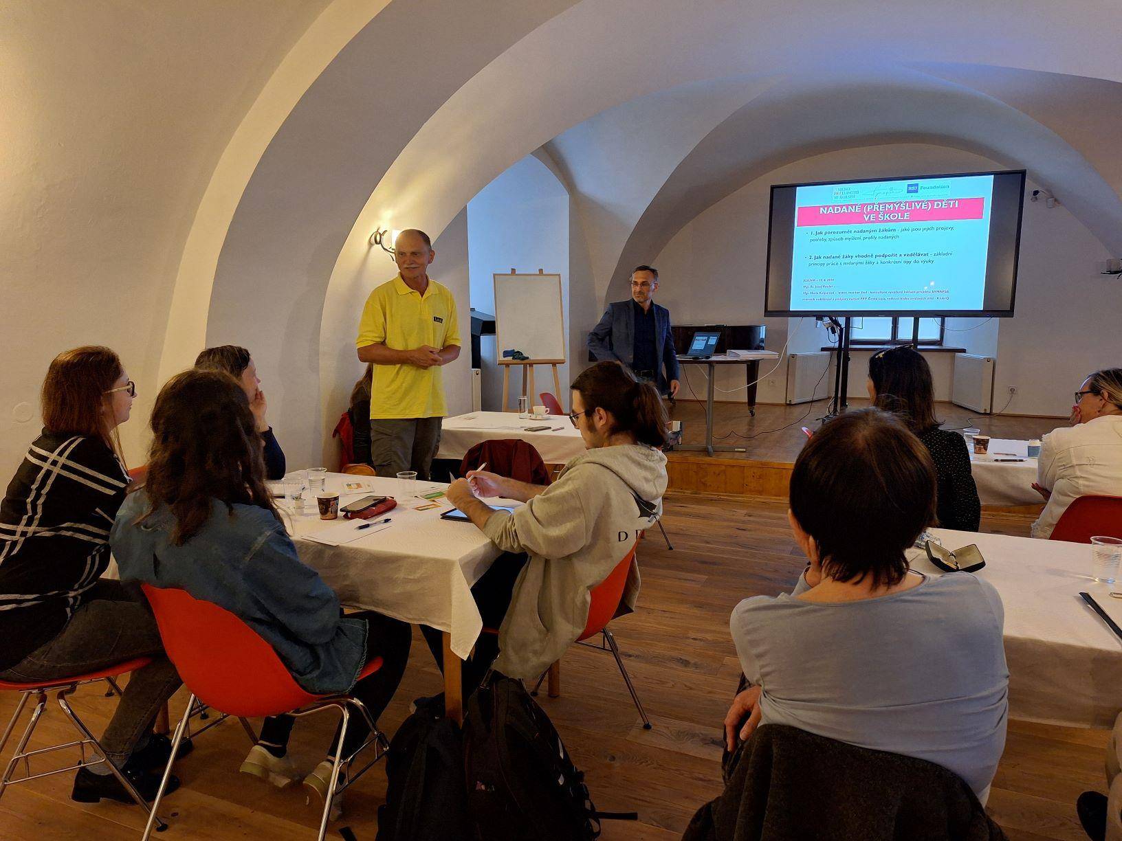 Práce s nadanými žáky v rámci systému školy12.06.2024 Dne 12. 6. 2024 proběhl v Rytířském sále Vodní tvrze seminář Mgr. Bc. Josefa J. Roušara, koordinátora podpory nadání v NPI ČR. Seminář byl zaměřen zejména na porozumění nadaným žákům, jejich projevům a potřebám. V první části, která byla vedena částečně formou workshopu, se účastníci snažili přijít na to, jak podpořit nadané žáky na základě jejich projevů a porozumění jejich potřebám. K tomu přispělo i seznámení s různými profily nadaných žáků, včetně toho, co je pro ně typické. V druhé části se účastníci letmo seznámili s tím, co tvoří školní systém podpory nadání, z jakých oblastí se skládá a jak k němu může škola dospět. Mezi pedagogy byl zájem jak o minimalistický systém, který si škola může postavit téměř sama, tak o spolupráci s projektem Synapse, kdy na tvorbě systému a plánu podpory nadání několik měsíců pracuje školní tým s týmem mentorů projektu Synapse. Seminář se uskutečnil v rámci projektu T-expedice Jeseníky 2024, který je zaměřen na podporu nadaných žáků a jejich pedagogů v regionu Jesenicka. Akci finančně podpořilo MŠMT ČR a Olomoucký kraj. | |