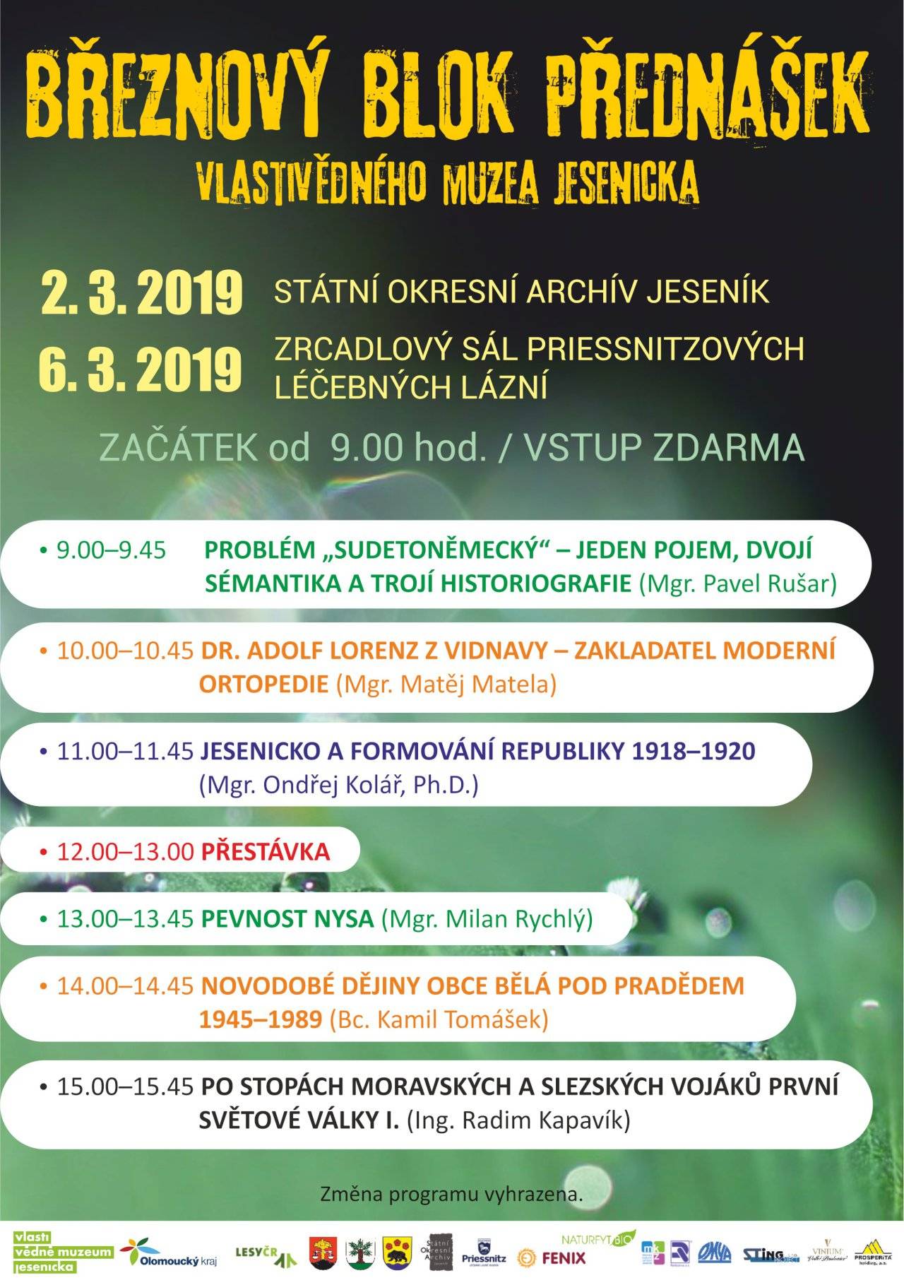 Březnový blok přednášek ve Státním okresním archivu Jeseník02.03.2019 2. března 2019, Konferenční místnost Státního okresního archivu Jeseník Přednášky Vlastivědného muzea Jesenicka se v březnu poprvé uskutečnily v netradiční podobě. V jediný den bylo možné vyslechnou si více rozličných témat v tzv. přednáškovém bloku. Během přednáškového bloku zazněly tyto přednášky: