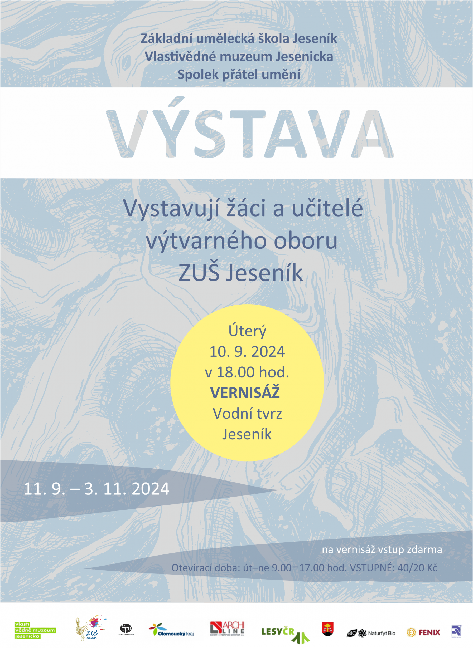 Výstava žáků a učitelů ZUŠ Jeseník10.09.2024 Vernisáží dne 10. září 2024 byla úspěšně zahájena podzimní výstava žáků a učitelů ZUŠ Jeseník. Na výstavě si můžete prohlédnout práce žáků i jejich učitelů, Ivy Svobodové, Lenky Grygové a Filipa Raifa. Na vernisáži byli přítomni i někteří bývalí učitelé výtvarného oboru Základní umělecké školy Jeseník. Na flétnu zahrála Jana Svobodová, žákyně Veroniky Kroupové. | |