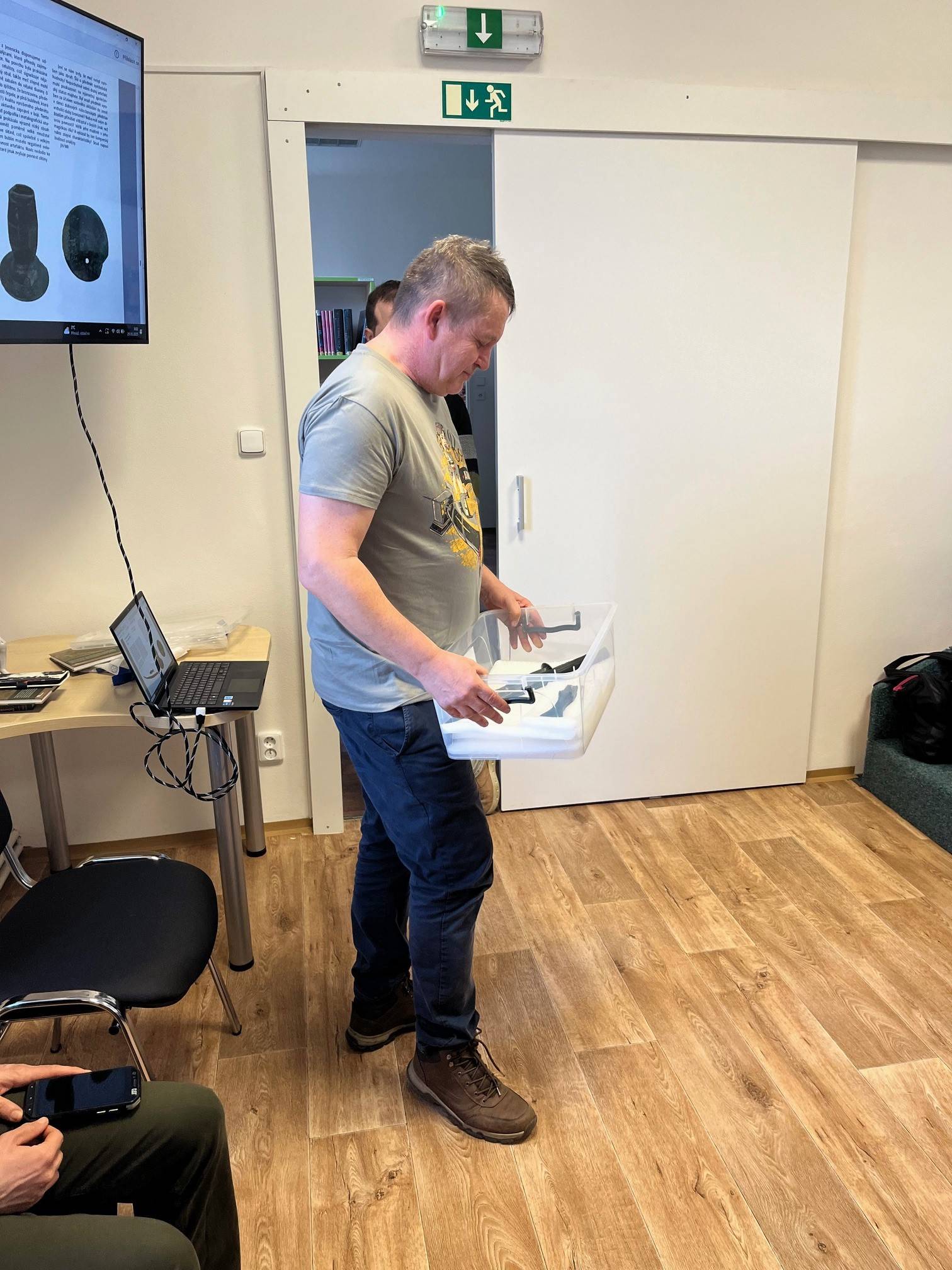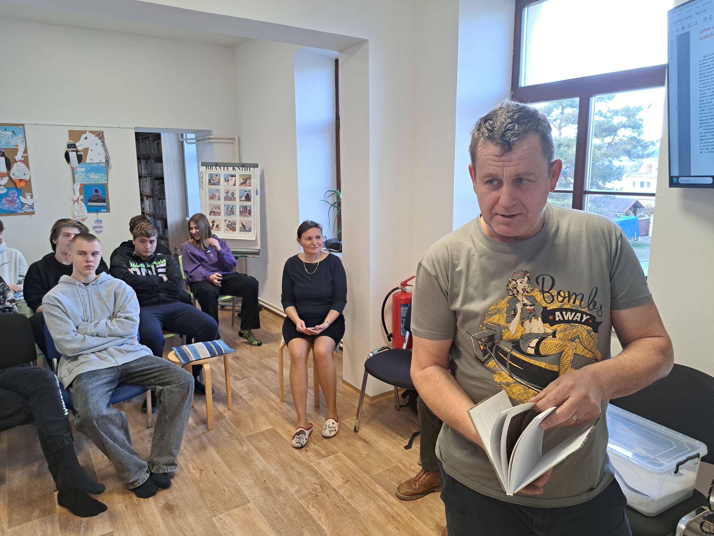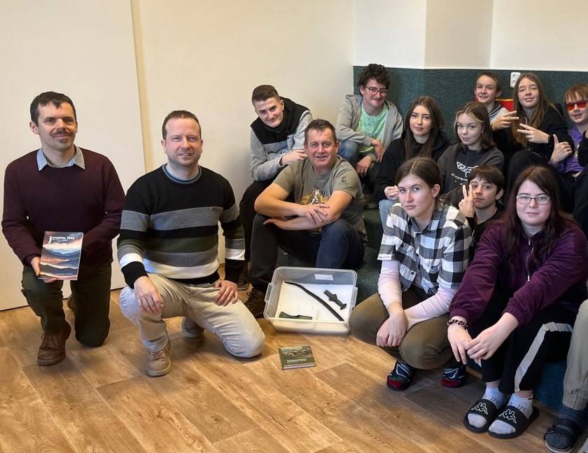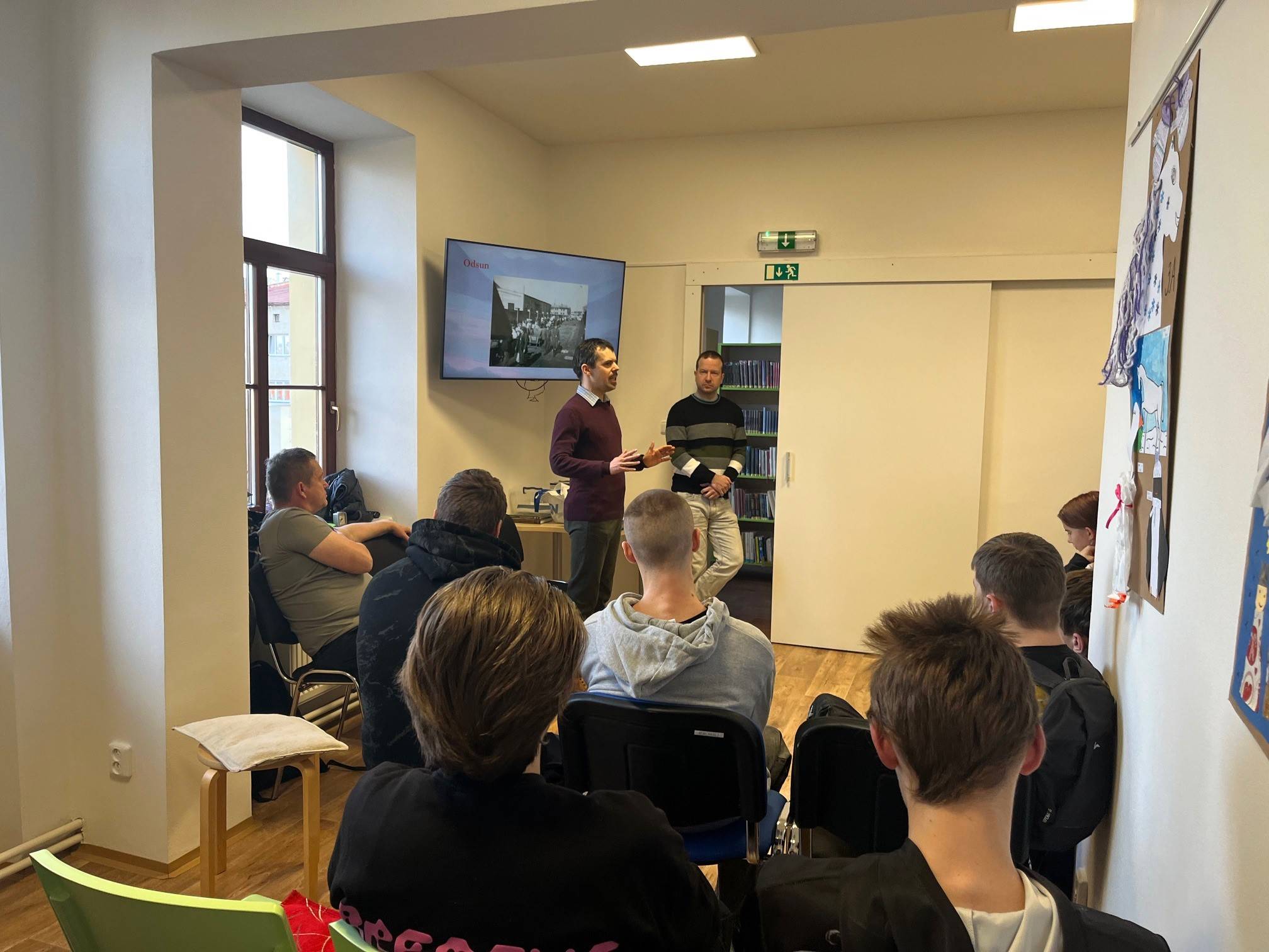 Beseda se studenty ve Zlatých Horách29.01.2025 Ve středu 29. ledna proběhla v Městské knihovně ve Zlatých Horách beseda pracovníků VMJ se žáky 8. a 9. třídy základní školy spojená s představením dvou knih muzea. Historik Ondřej Kolář pohovořil o publikaci „Jesenicko 1945: mezi válkou a mírem“, ředitel VMJ Pavel Rušar posluchačům představil katalog „Záhadné předměty z jesenických sbírek“ a archeolog Milan Rychlý žákům předvedl některé z historických artefaktů popsaných v katalogu a vylíčil okolnosti jejich objevení. Následovala diskuze, která se týkala práce muzejních historiků a archeologů. Řeč ale byla také o práci s informacemi a internetovými zdroji, o pátrání po rodinné historii a dalších tématech. | |