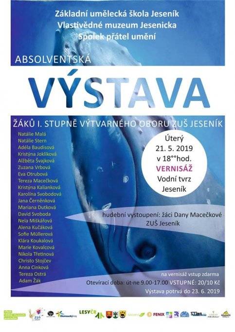 Absolventská výstava ZUŠ Jeseník (vernisáž)21.05.2019 21. května 2019, Galerie Vodní tvrze Každým rokem uzavírají žáci výtvarného oboru svá studia absolventskou výstavou, na které prezentují výsledky svého dlouholetého studijního úsilí. Letos se jich na závěrečné výstavě představí neuvěřitelných dvacet tři, z nichž každý si zvolil specifické téma, které dlouhodobě zpracovává. Stejnou různorodost jako náměty mají použité techniky kresby, malby, grafiky, fotografie a prostorových prací. Svými díly žáci vyjadřují nejen osvojené technické dovednosti, ale také svůj postoj k živé i neživé přírodě, lidské společnosti, jejímu fungování, historii i k lidskému jedinci. Na absolventské výstavě I. stupně učitelé Jana Krhánková, Iva Svobodová a Lenka Grygová představí své absolventy, z nichž někteří úspěšně vykonali talentové zkoušky na střední školy uměleckého směru a další se stanou žáky druhého stupně. Fotoreportáž z vernisáže. | |
