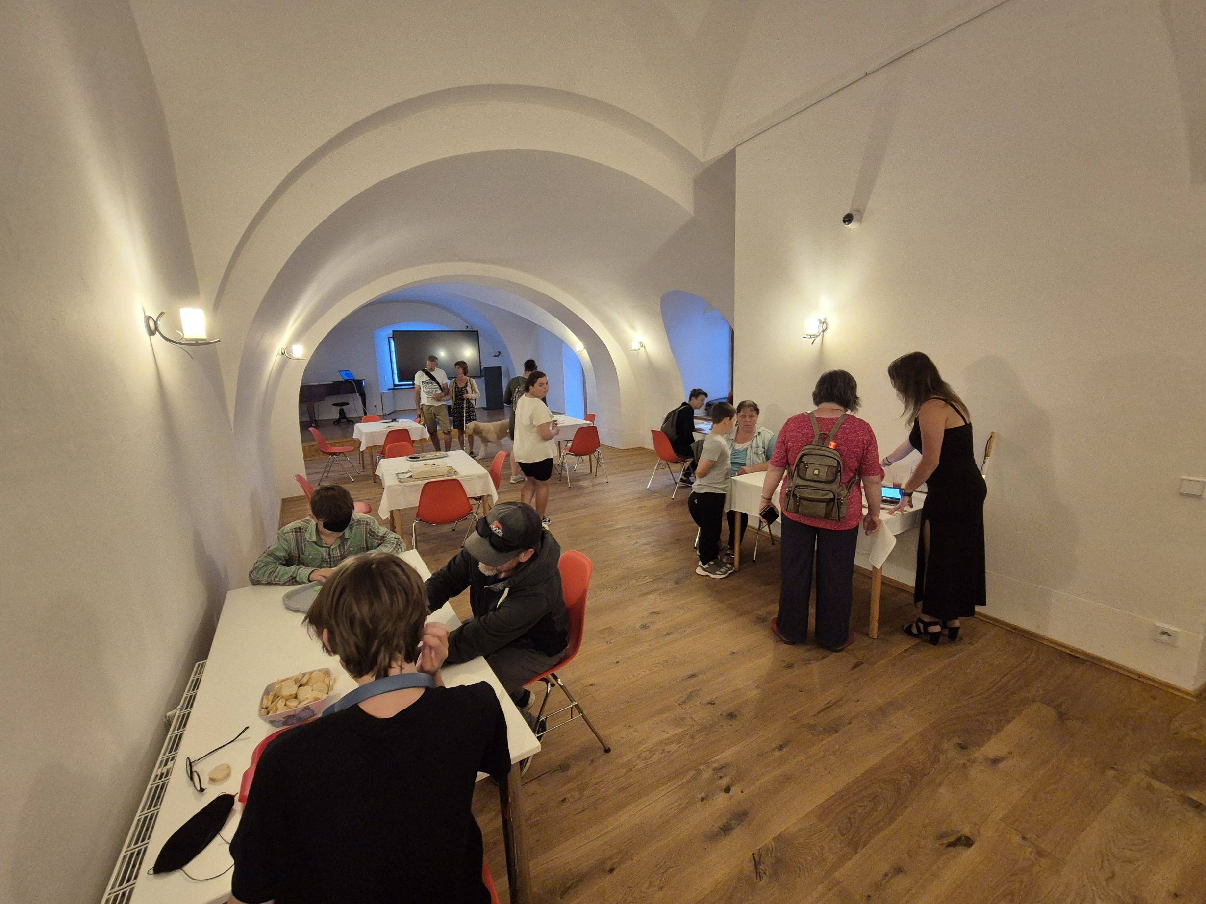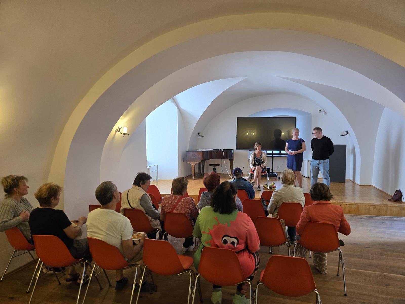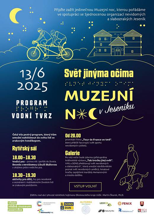 Muzejní noc ve Vodní tvrzi13.06.2025 V pátek 13. června se ve Vodní tvrzi v Jeseníku uskutečnila Muzejní noc, kterou pořádalo Vlastivědné muzeum Jesenicka ve spolupráci s jesenickým pracovištěm Sjednocené organizace nevidomých a slabozrakých. Večer nabídl bohatý program. Od 18.00 do 19.00 hod. nás nevidomá paní Libuše Skálová seznámila s prací vodicího psa a předvedla povely, které vodicí pes musí zvládat. Od 19.00 do 20.00 hod. si zájemci mohli vyzkoušet aktivity bez kontroly zraku a optické a kompenzační pomůcky pro zrakově postižené. Nejvíce lákalo psaní Braillovým písmem na Pichtově psacím stroji, pomůcky pro zrakově postižené a různé hmatové hry. Velký ohlas měla také zvuková střelba. Od 20.00 hod. mohli návštěvníci zhlédnout dokument o nevidomém sportovci Ondřeji Zmeškalovi „Tour de France ve tmě“ promítaný v Rytířském sále. V rámci Muzejní noci bylo možné rovněž navštívit „Byt ve tmě“ na nádvoří Vodní tvrze. Vstupní aktivitou bylo hledání správného klíče k zámku a odemknutí bytu, uvnitř si pak mohli vyzkoušet úklid (zametení korkových špuntů) a další aktivity bez kontroly zraku. Návštěvníkům byla také zdarma přístupná výstava hmatových soch vytvořených Axmanovou technikou modelování na téma hudby „Tak trochu jiný svět“ a herna pro rodiče s dětmi. Muzejní noc přilákala návštěvníky různého věku, od dětí po seniory. Dle ohlasů se akce líbila a splnila očekávání – přiblížit svět zrakově postižených veřejnosti. | |