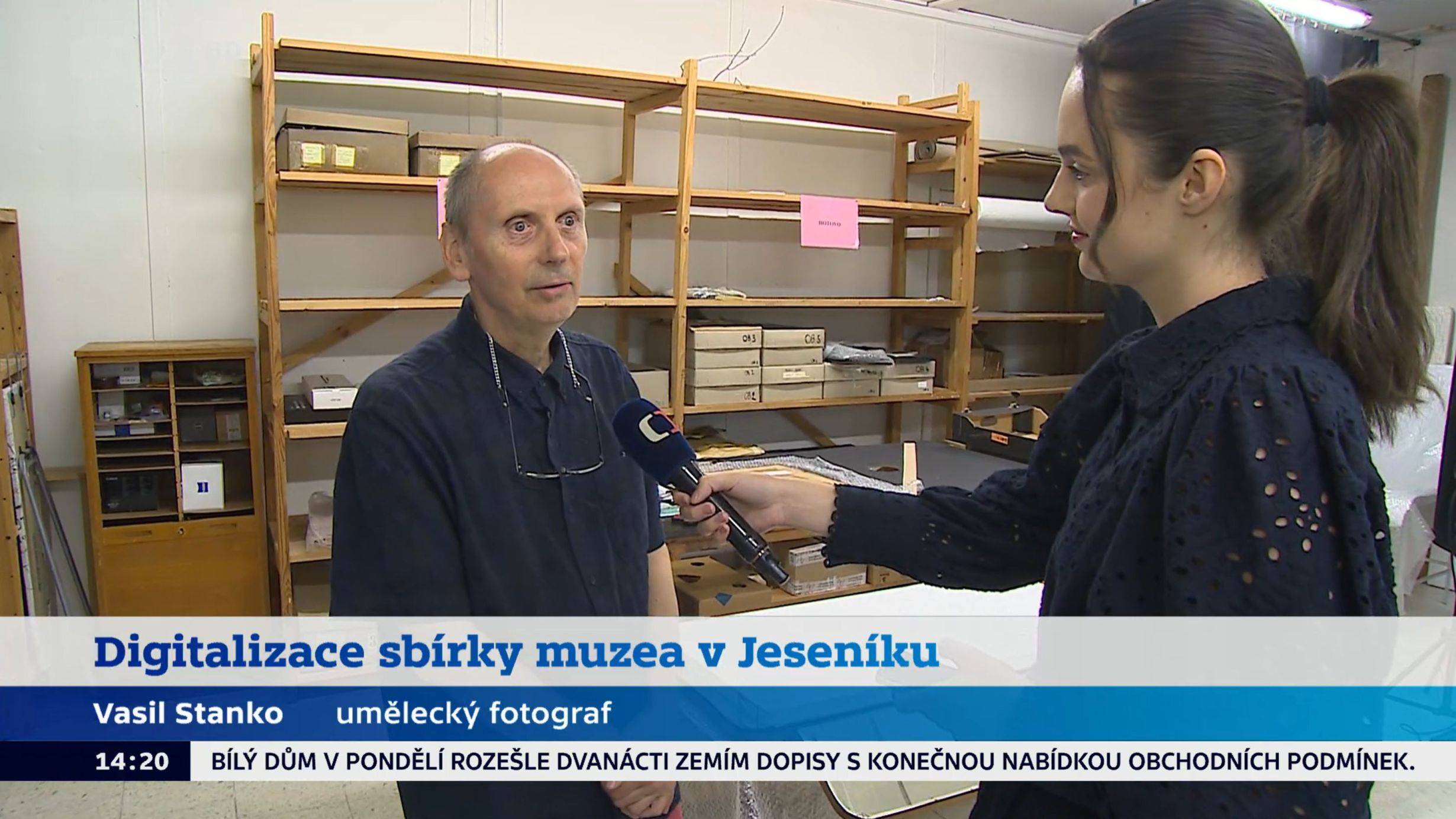 Reportáž o digitalizaci ve VMJ v kontinuálním vysílání ČT2411.07.2025 Česká televize odvysílala 6. července 2025 v rámci kontinuálního vysílání zpravodajského kanálu ČT24 reportáž o digitalizaci sbírkového fondu ve Vlastivědném muzeu Jesenicka, jejímž hlavním hostem byl fotograf Vasil Stanko. Reportáž je možno přehrát na tomto odkazu od času 14:20. Druhá reportáž byla odvysílaná také v rámci pořadu Události v regionech Ostrava (od času 14:30). | |